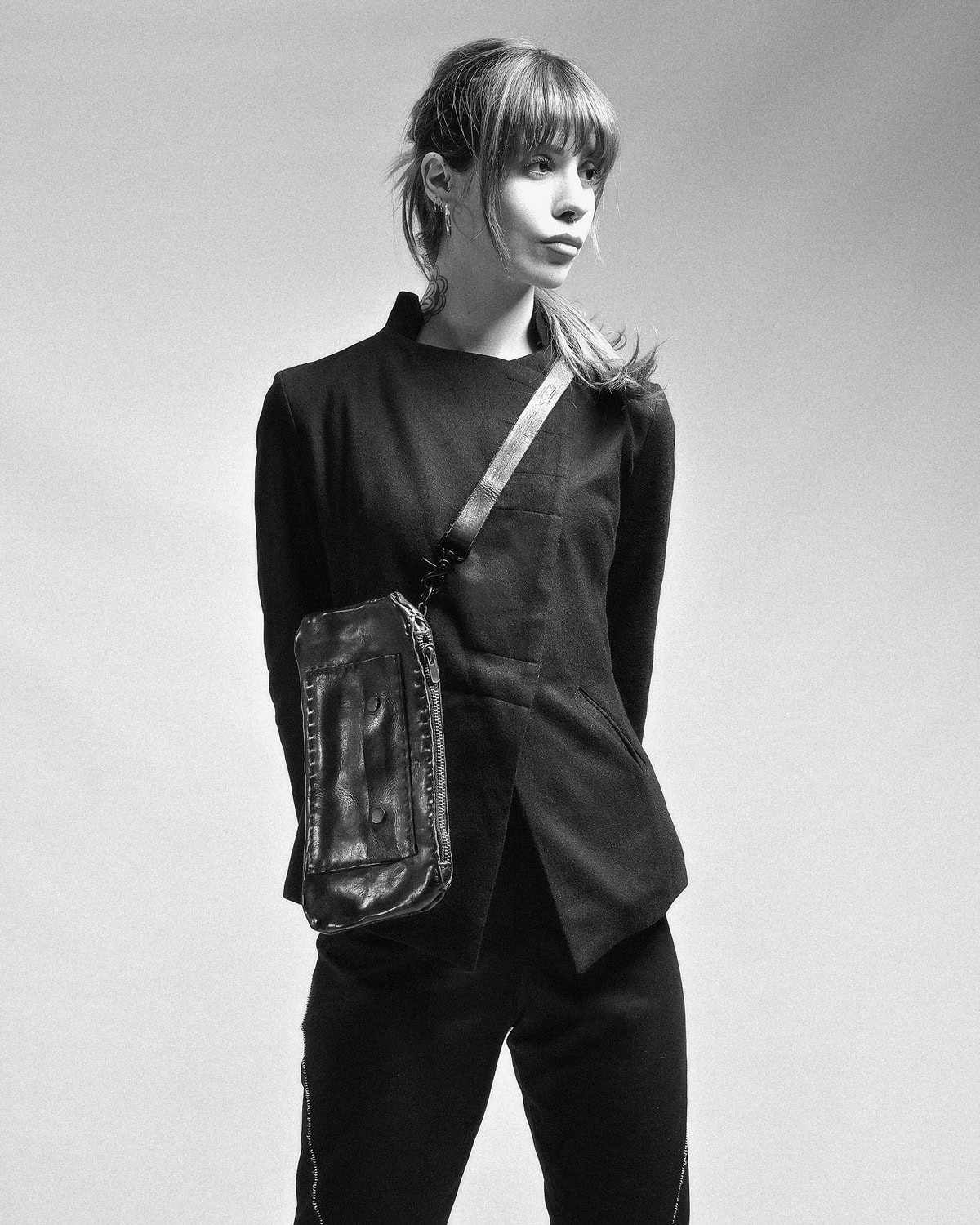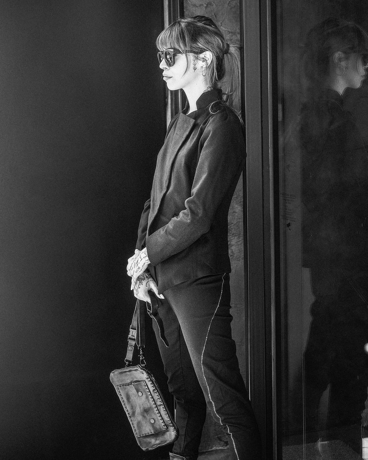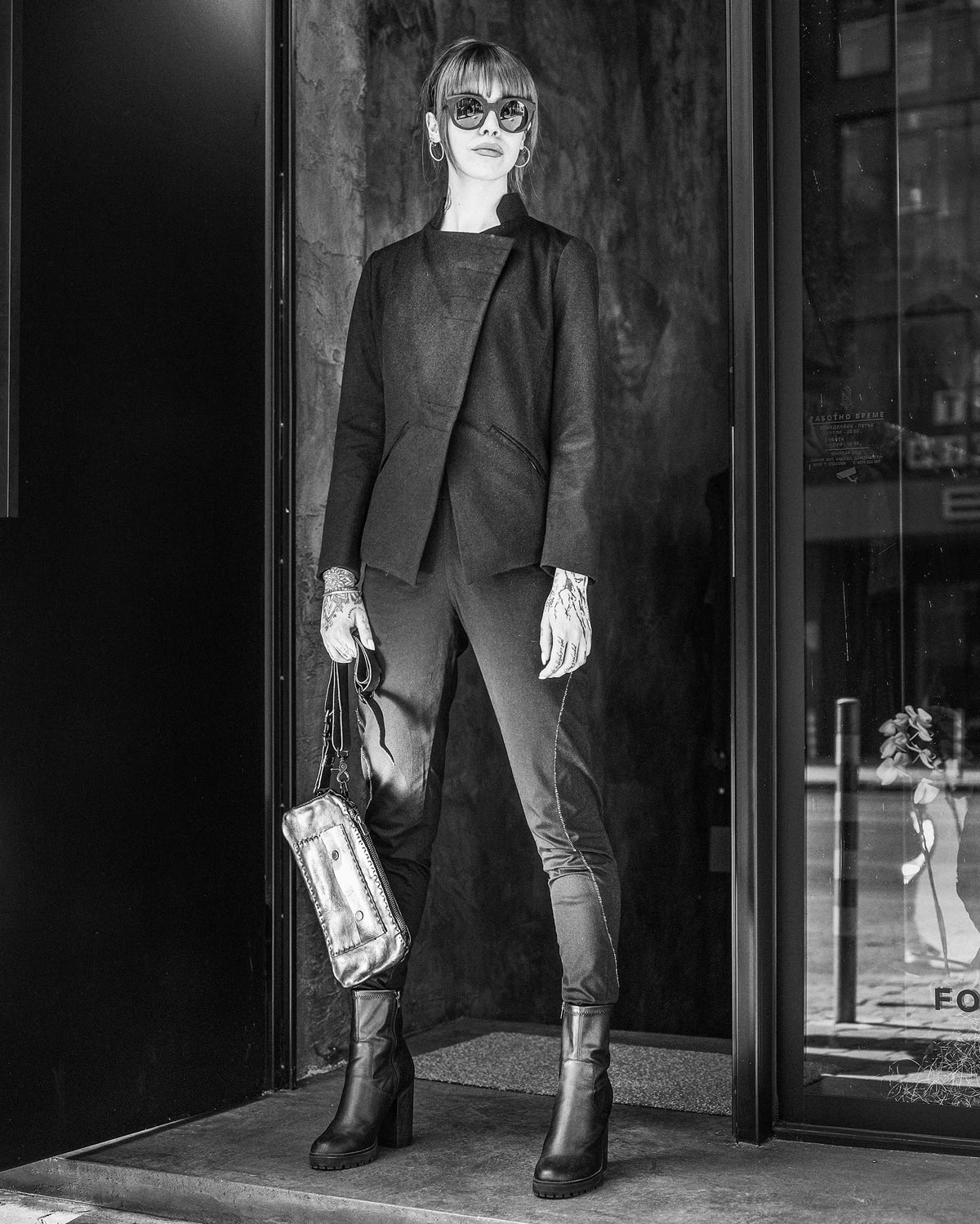 M wearing the Wool Tailored Blazer Jacket, Slim Shifted Seam Pants and Leather Cross Shoulder Bag.