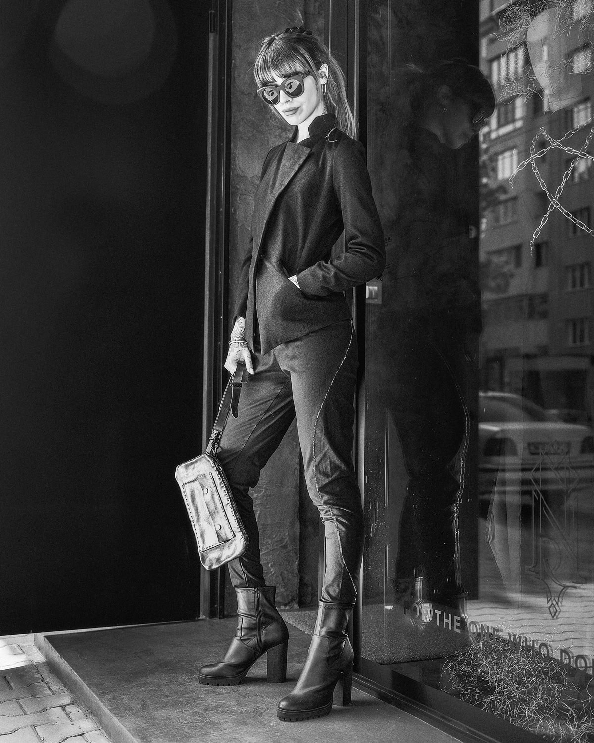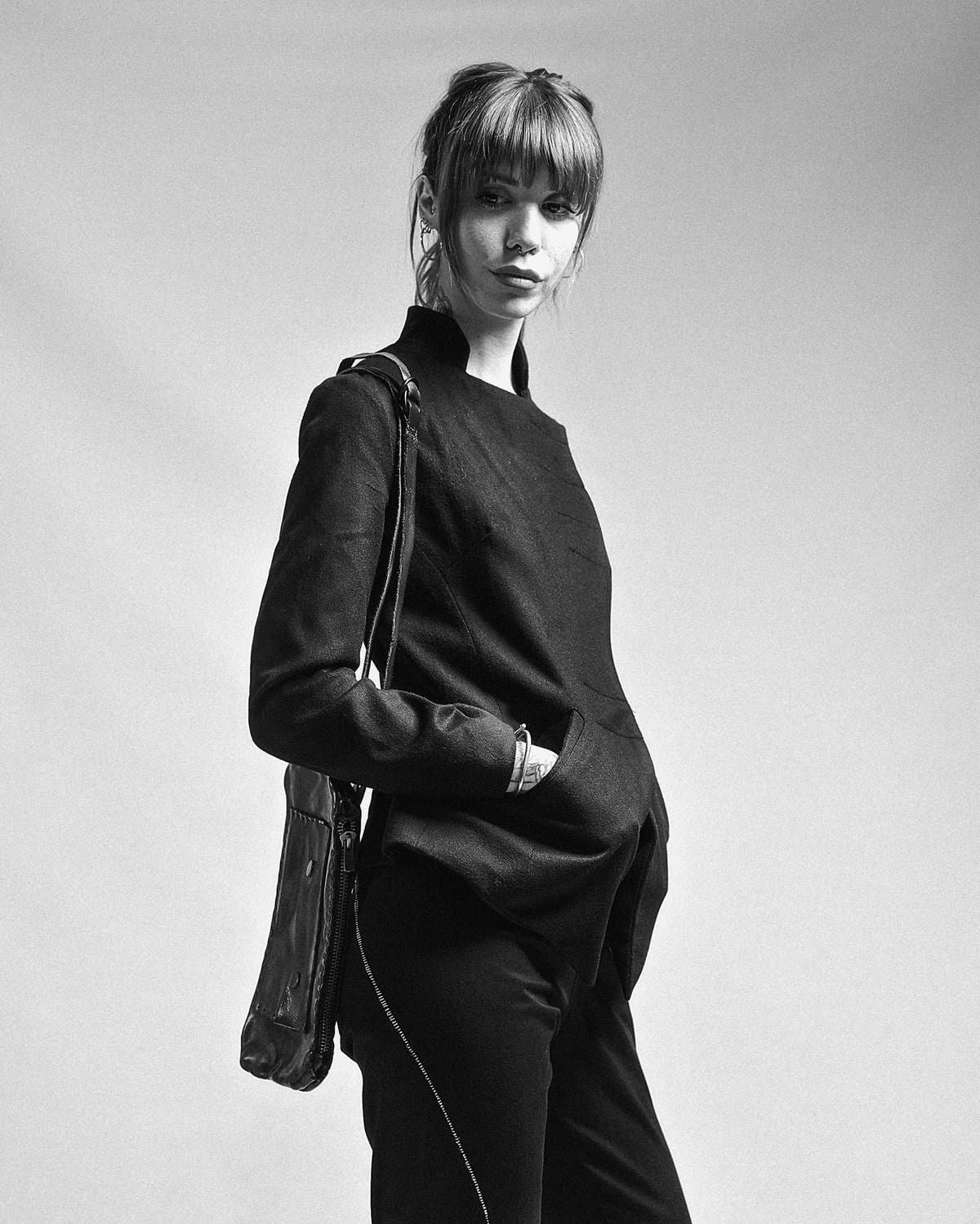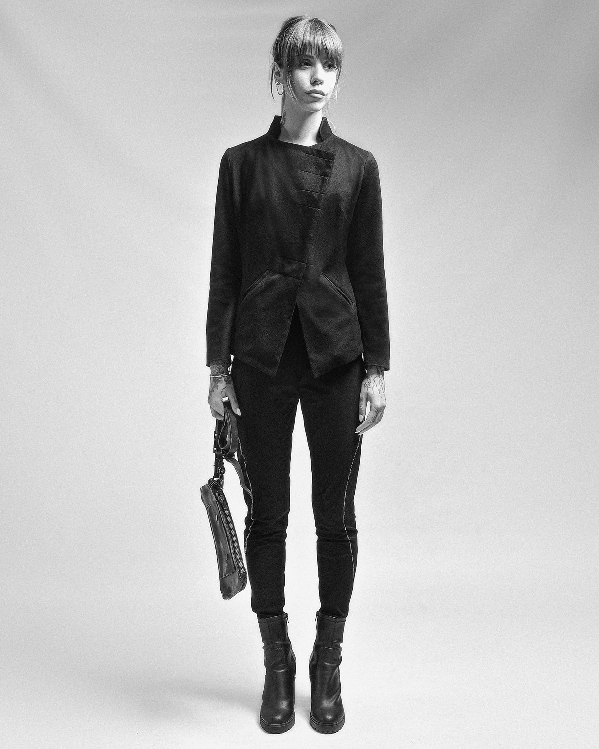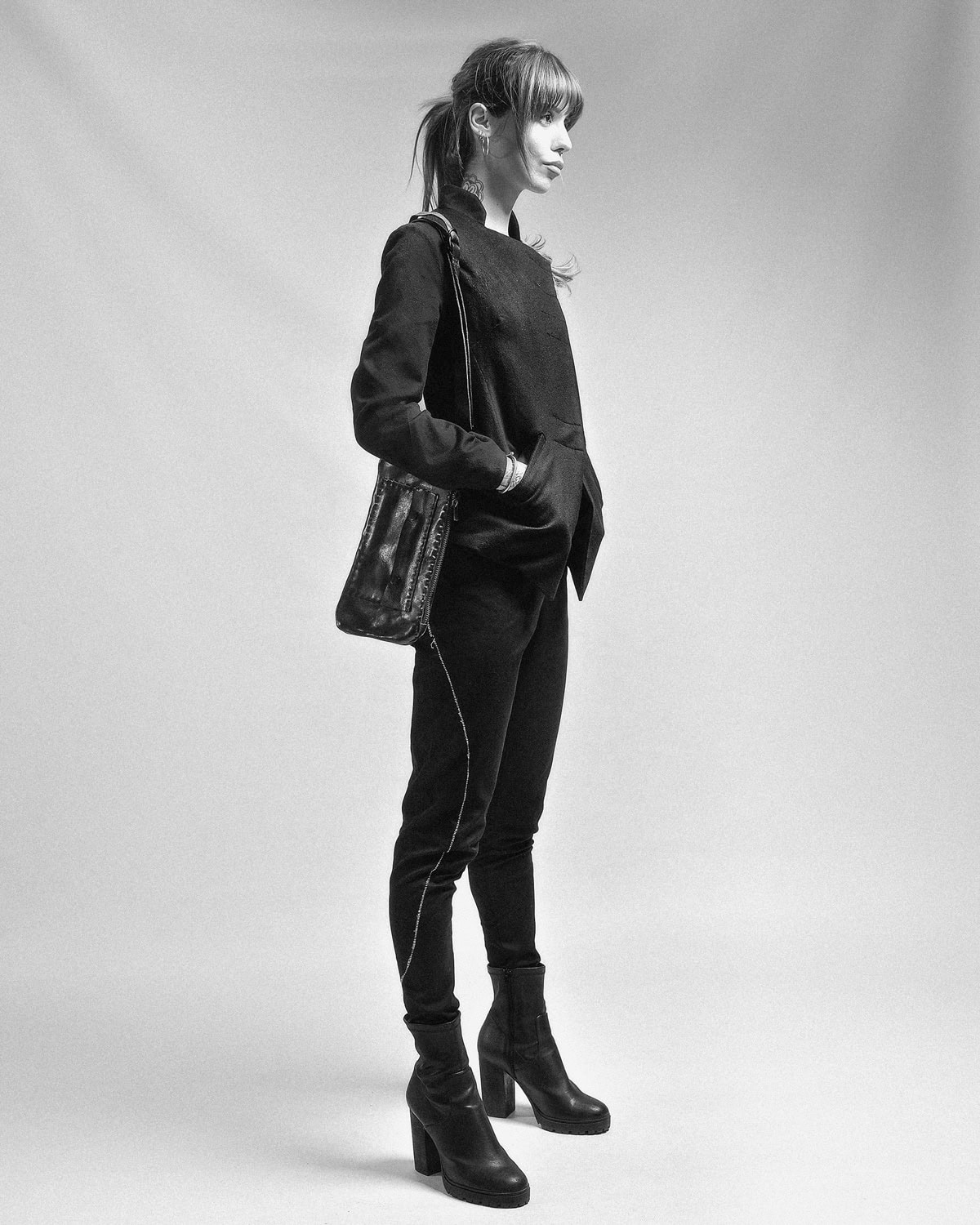 M wearing the Wool Tailored Blazer Jacket, Slim Shifted Seam Pants and Leather Cross Shoulder Bag.