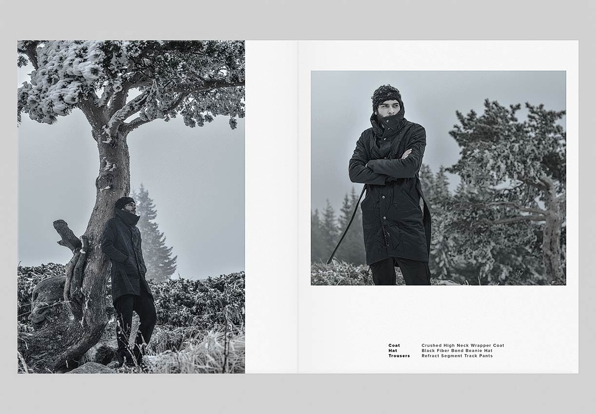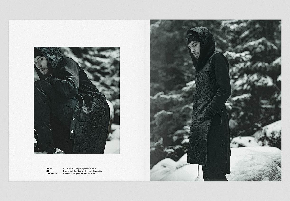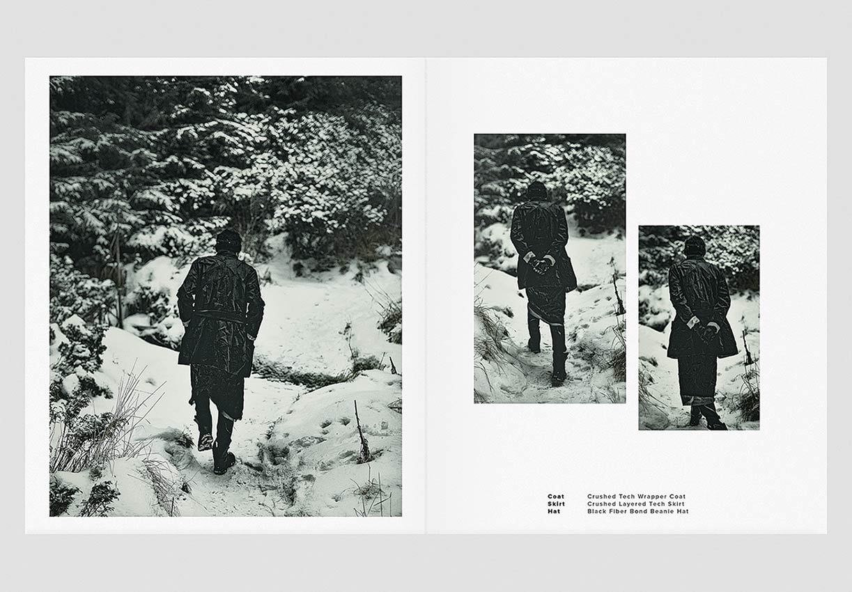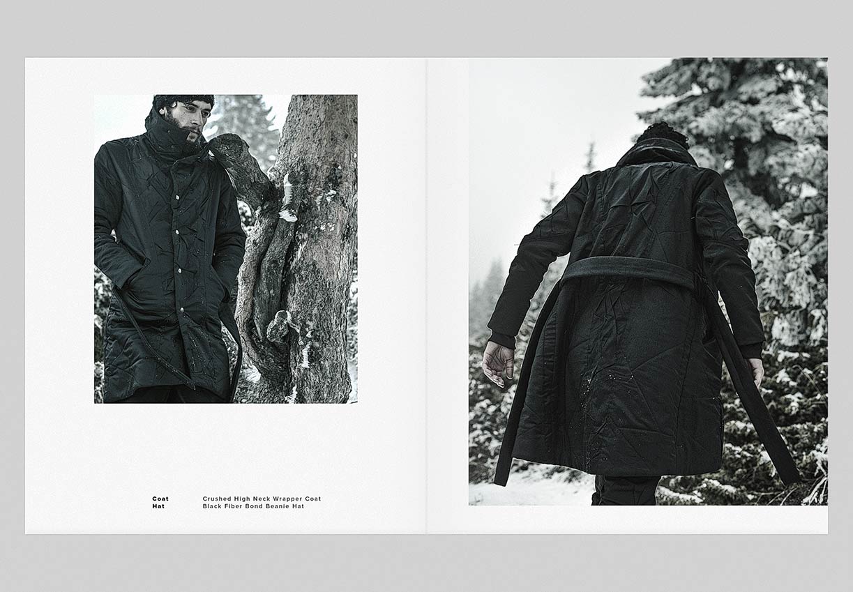 The winter menswear visuals entitled ‘Instinctive Changes’ explore the unpredictable scenery and her presence as it is. Featuring pieces from ‘YT’ collection crafted in signature ‘Crushed’ technique. Fabrics in wool, cotton & linen are constructed in a chaotic multi-fold manner to create the peculiar unison between environment and appearance.