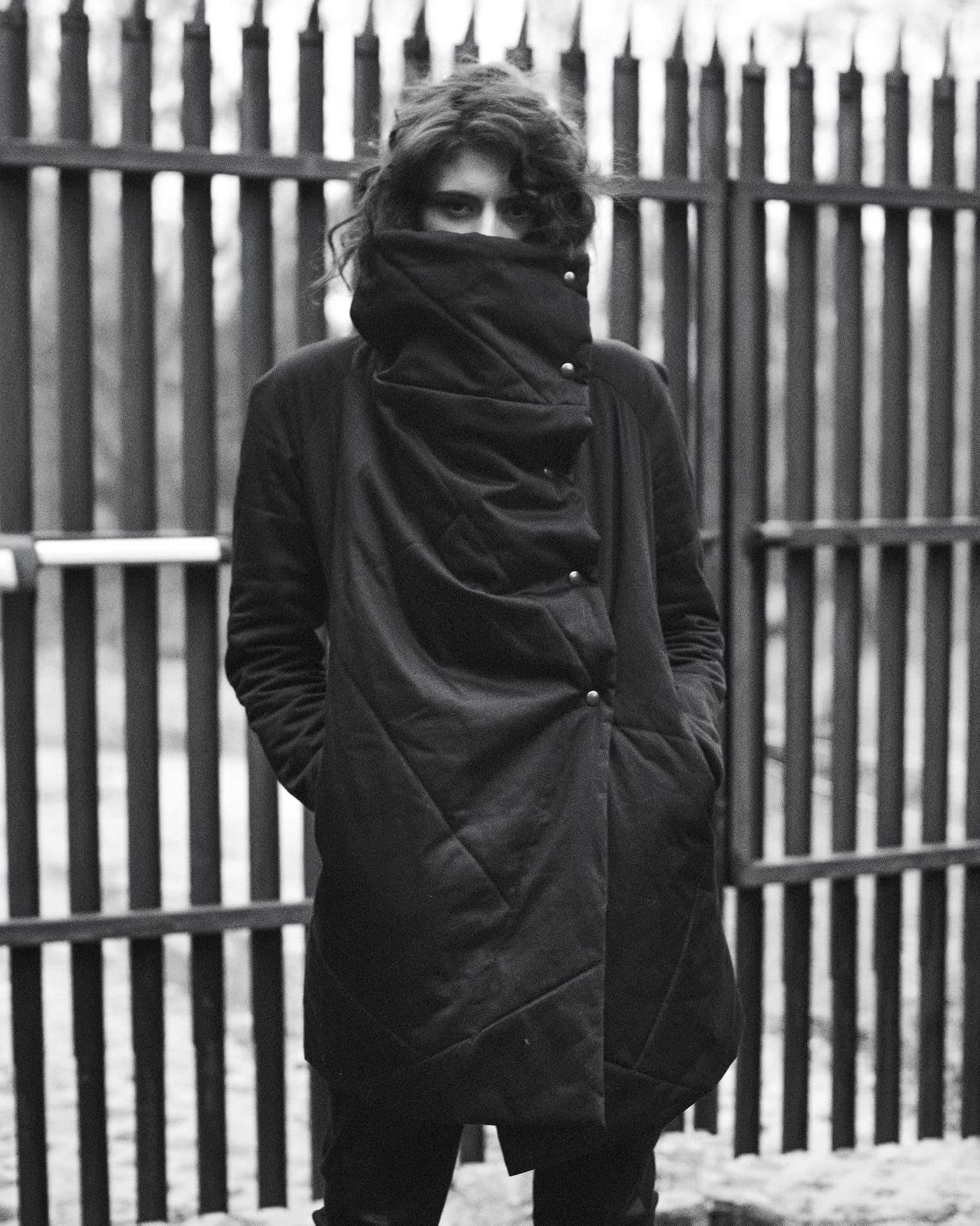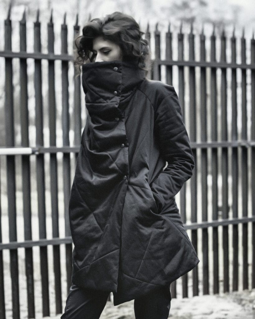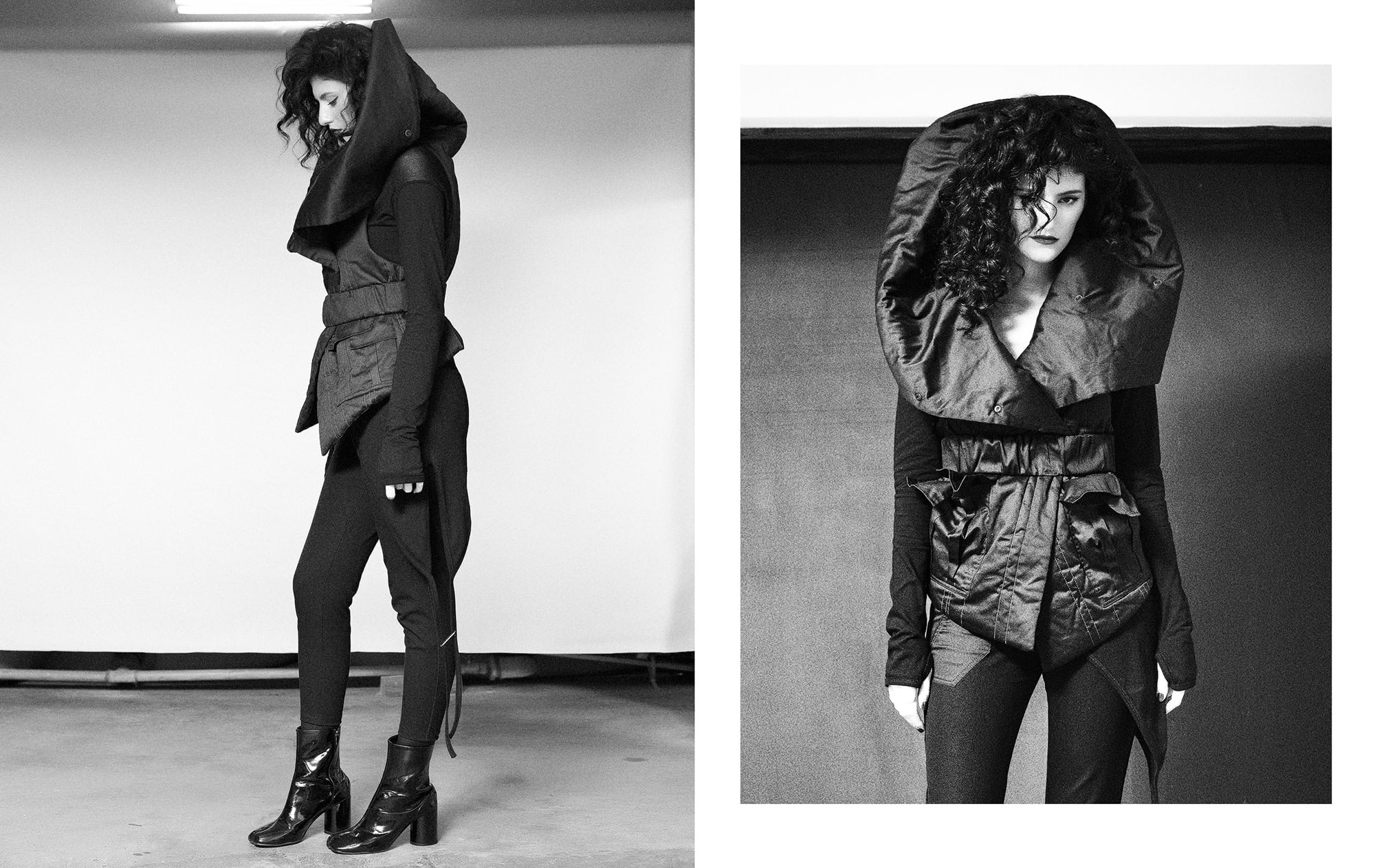 In these pictures is the outerwear is the Hooded Crushed Crop Vest in cropped cut design, crafted in the signature “Crushed” technique featuring a constructive cut hood and two front diagonal welt pockets.