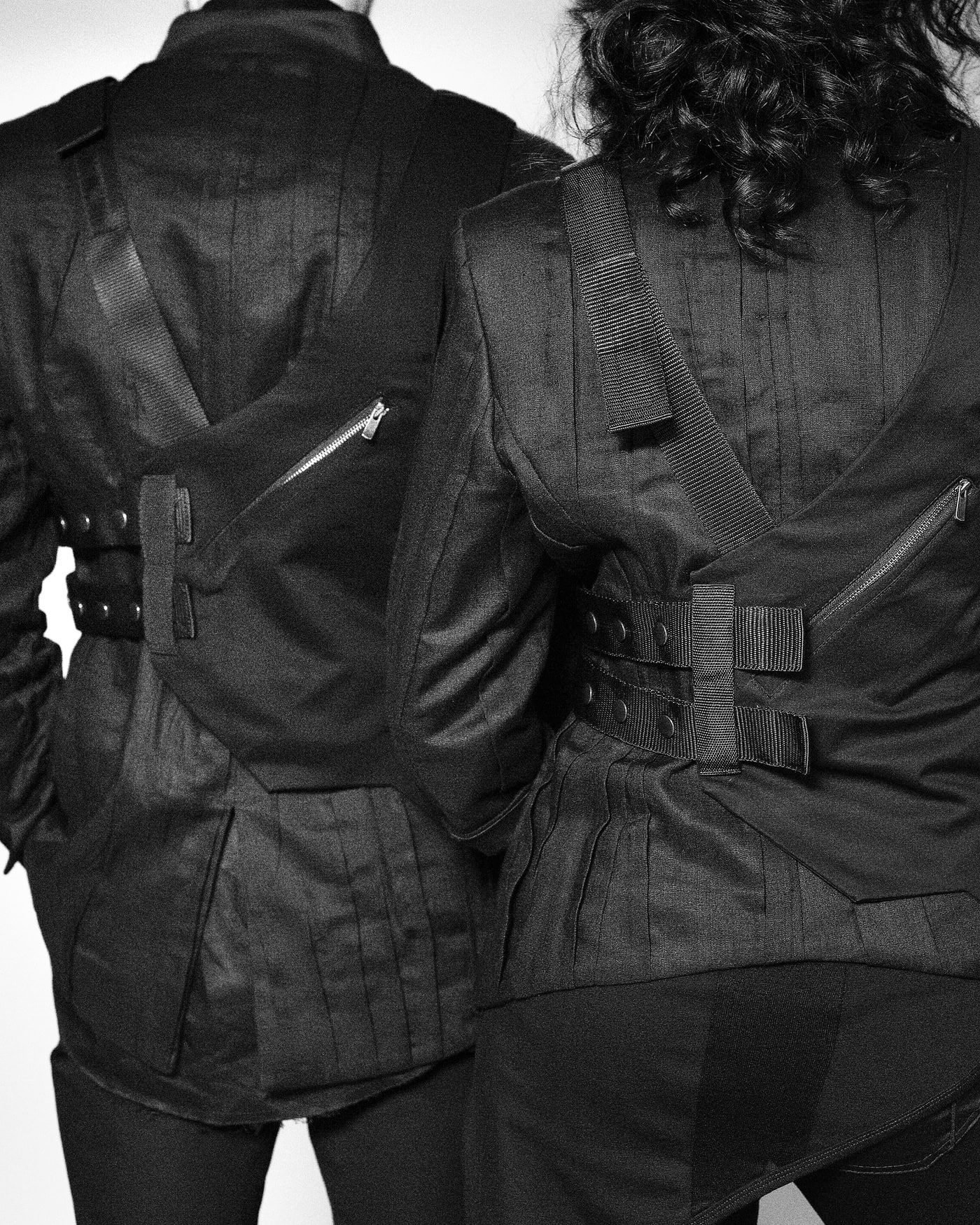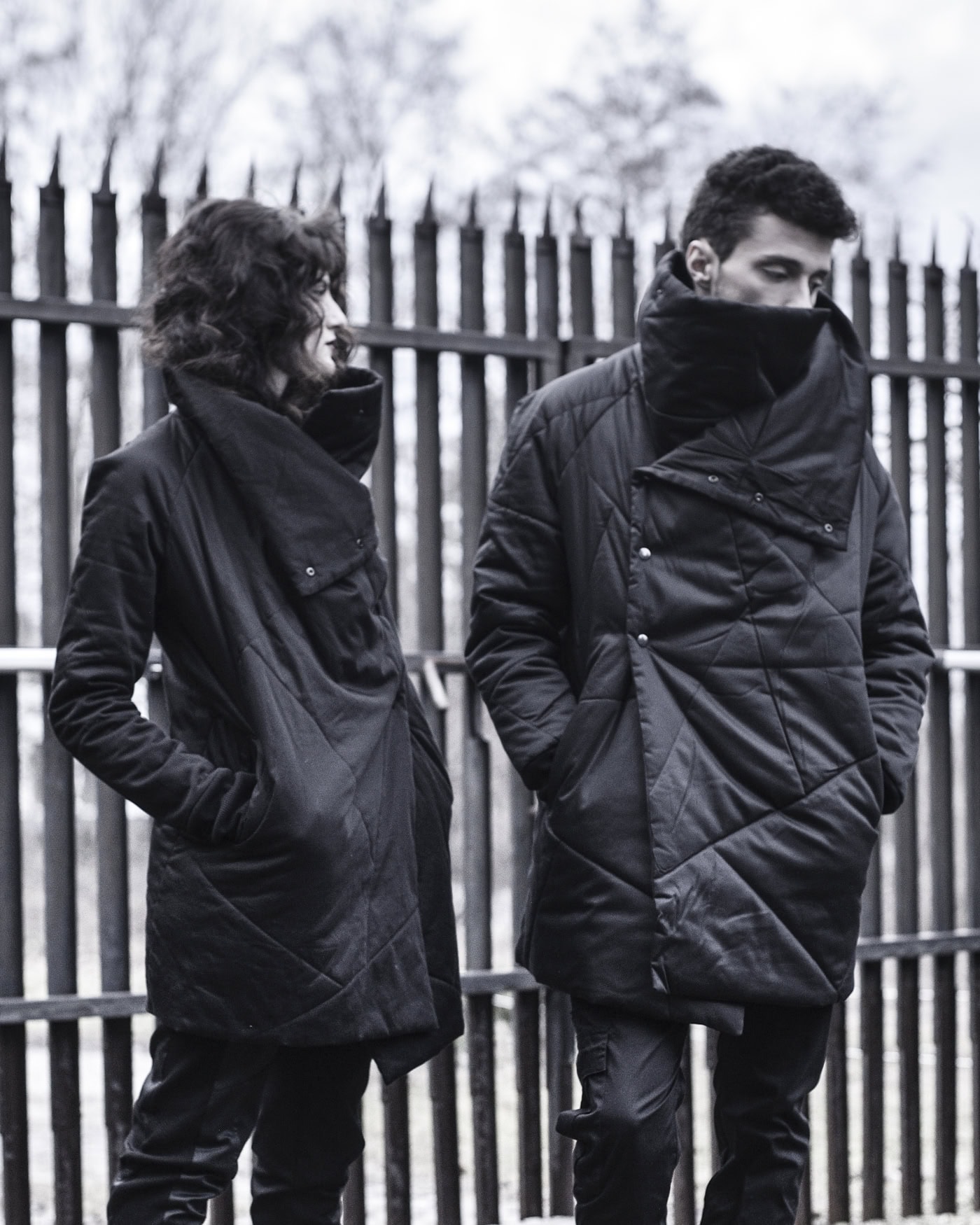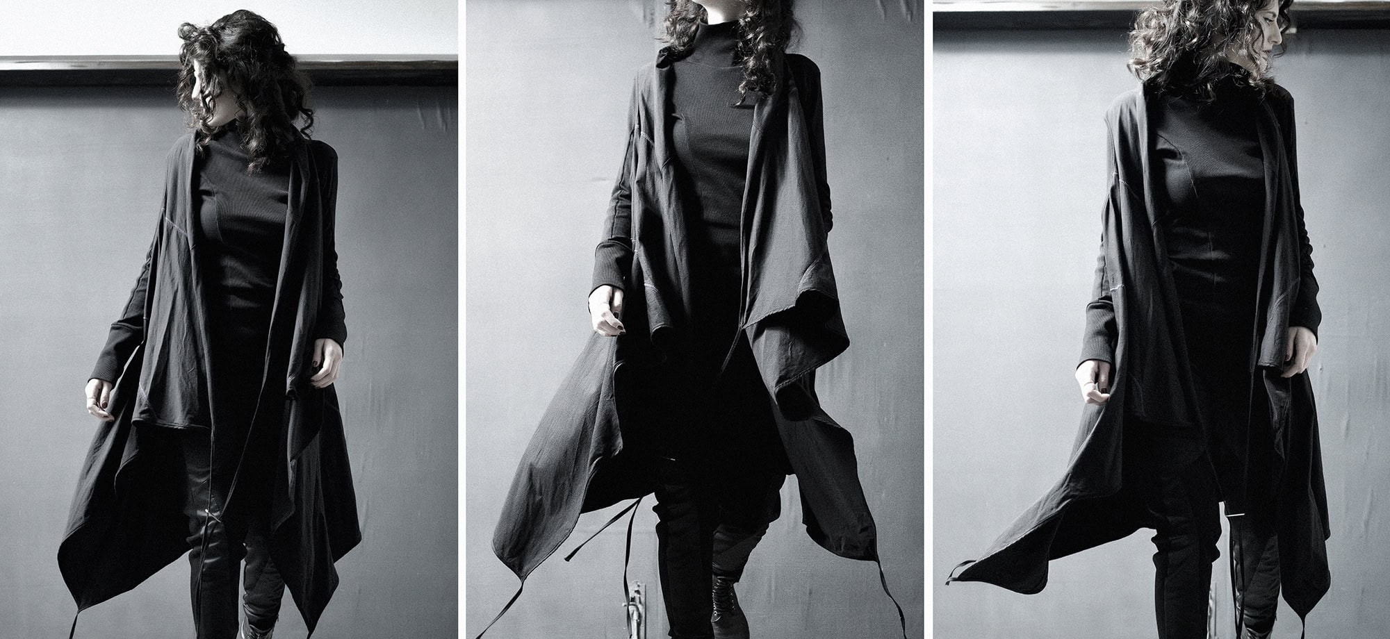 In these pictures is the outerwear is the Hooded Crushed Crop Vest in cropped cut design, crafted in the signature “Crushed” technique featuring a constructive cut hood and two front diagonal welt pockets.