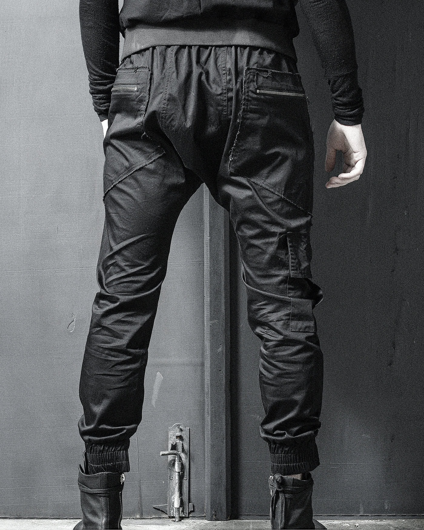 First item from the last two visuals is the Inertia Linear Volume Collar Vest, crafted in a constructive cropped design and features enlarged voluminous collar which can be used as a covering hood. Dark violet stitches shape a linear design throughout the cotton fabric. This garment is ideal for layered silhouettes, it features signature cargo pockets making it functional to it’s potential.