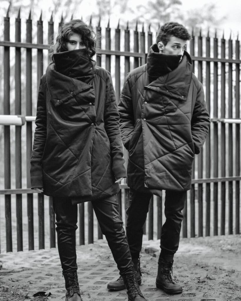 The first garment is the Quilted Winter High Neck Coat. Crafted in a relaxed silhouette it features high collar and ‘refract’ linear quilt design. It is available for both men and women and represents an ideal winter solution.
