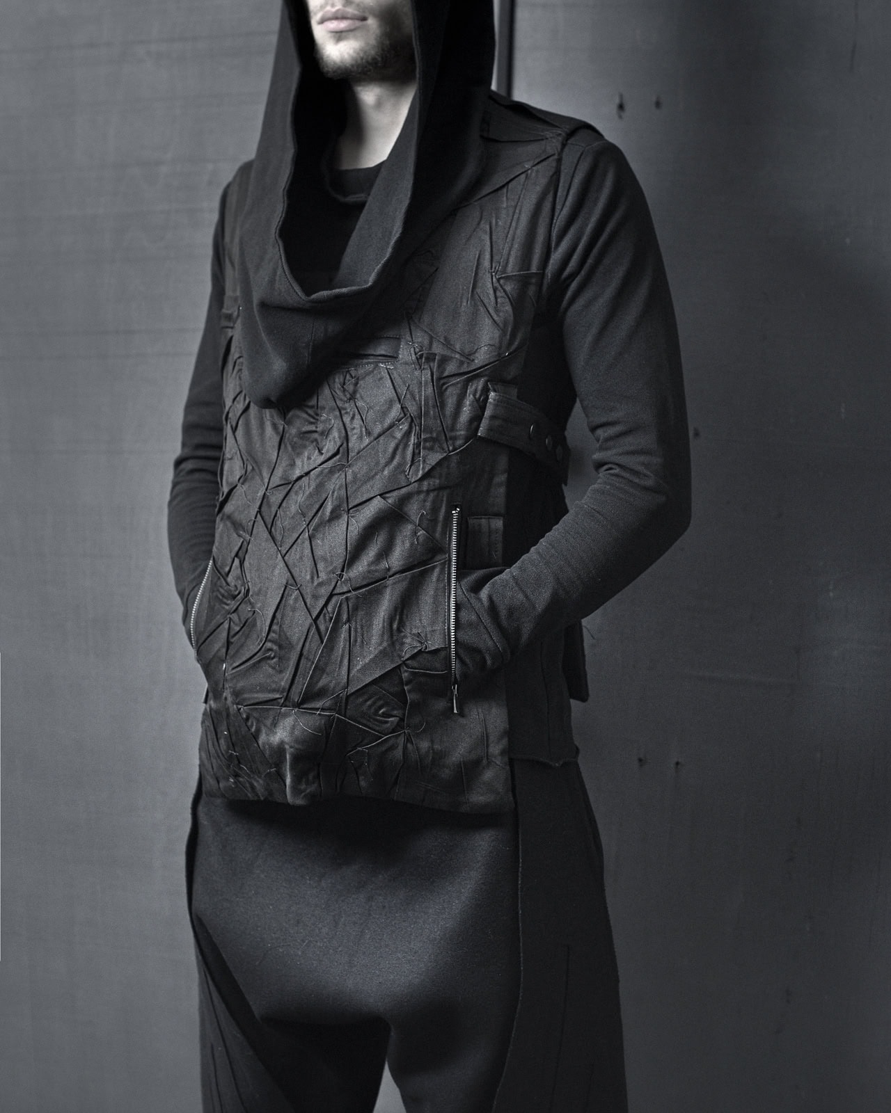 The lightweight sleeveless Crushed Guard Utility Vest emphasized with the signature ‘Crushed’ Fabric technique is the perfect addition to the Deconstructed Collar Hoodie with deconstructed hood and open front part.