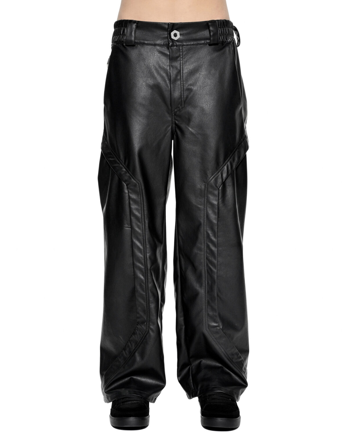 The Apex Leather Segment Trousers feature a loose, relaxed silhouette in a black leather finish, engineered with structural hexagonal vents at the front and rear.