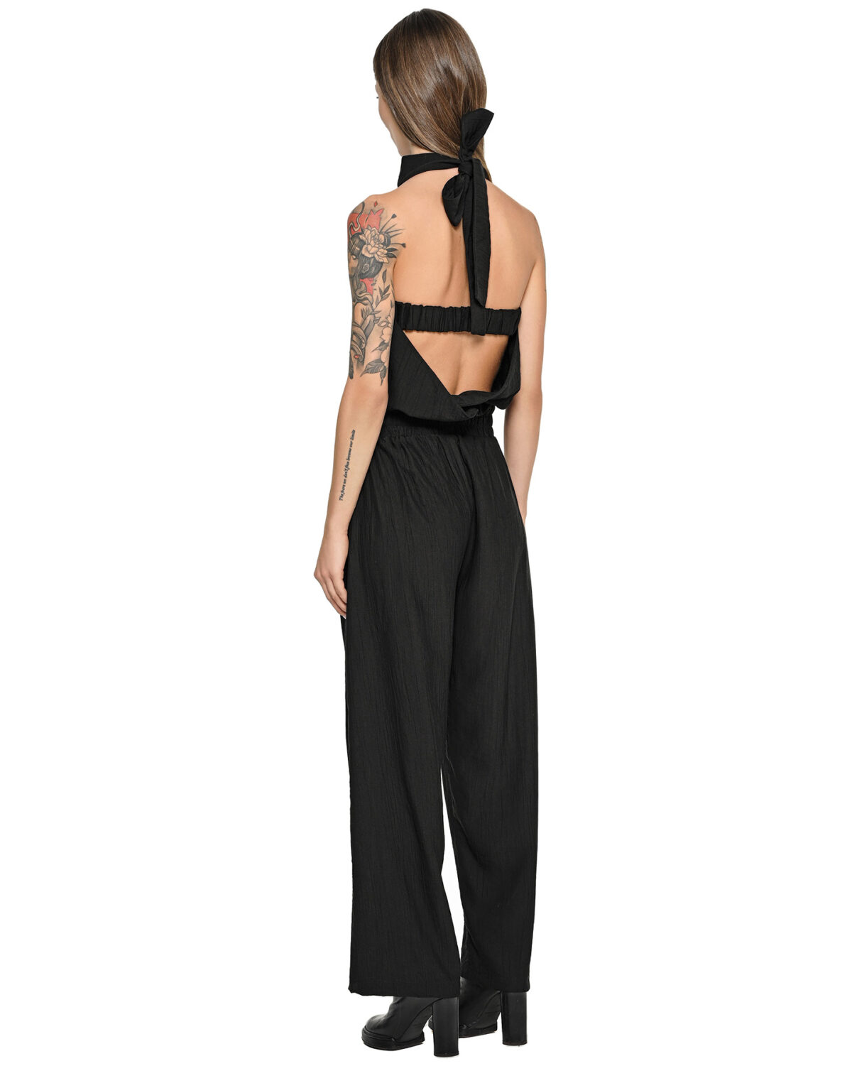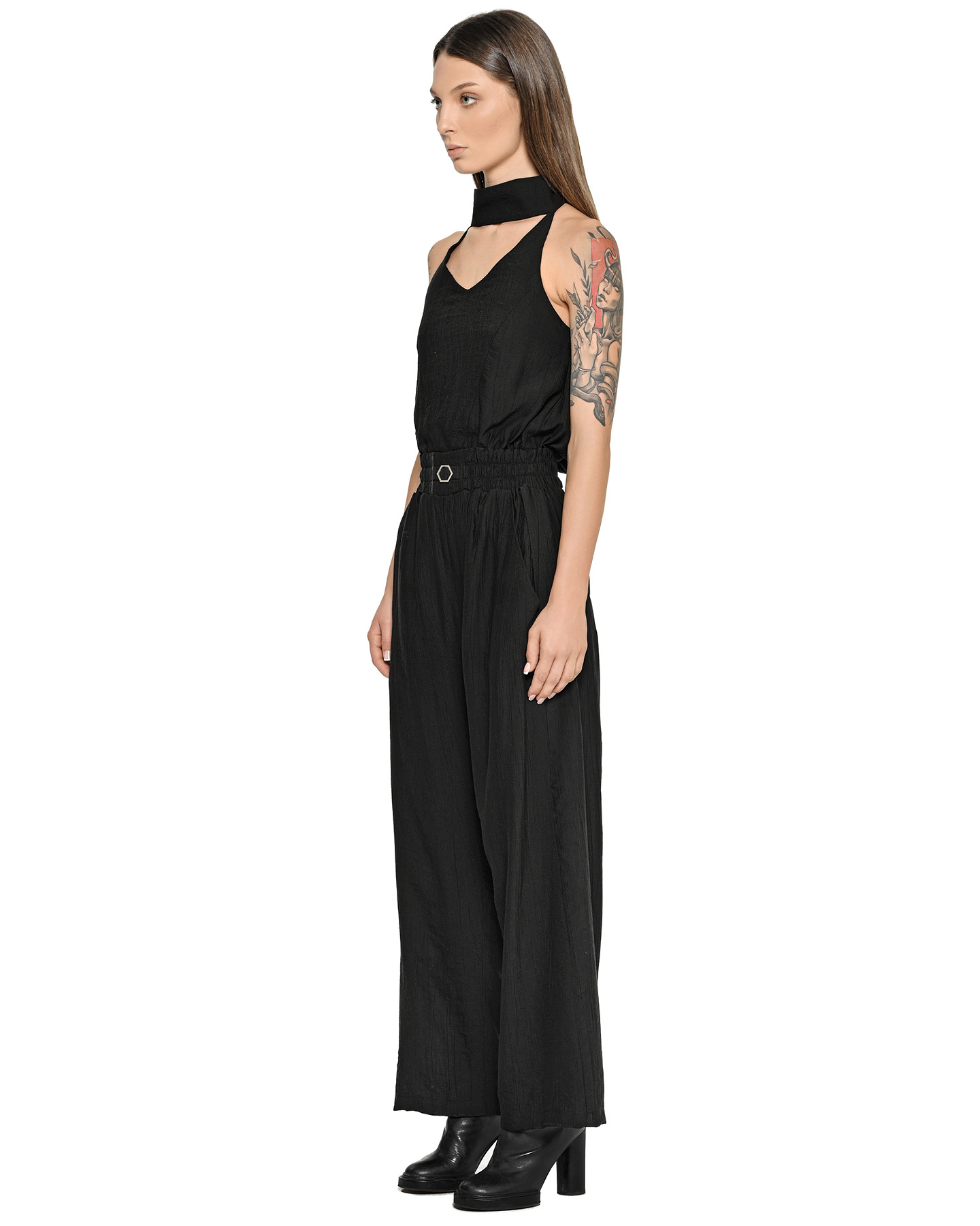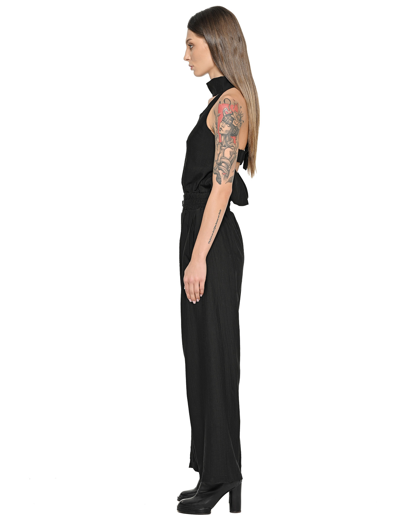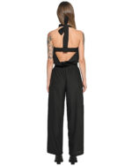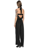The Array Bow Collar Black Overall establishes a relaxed, lightweight silhouette defined by an elongated wrap collar with a rear ribbon-style adjustment and elasticated waistline.
