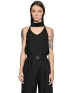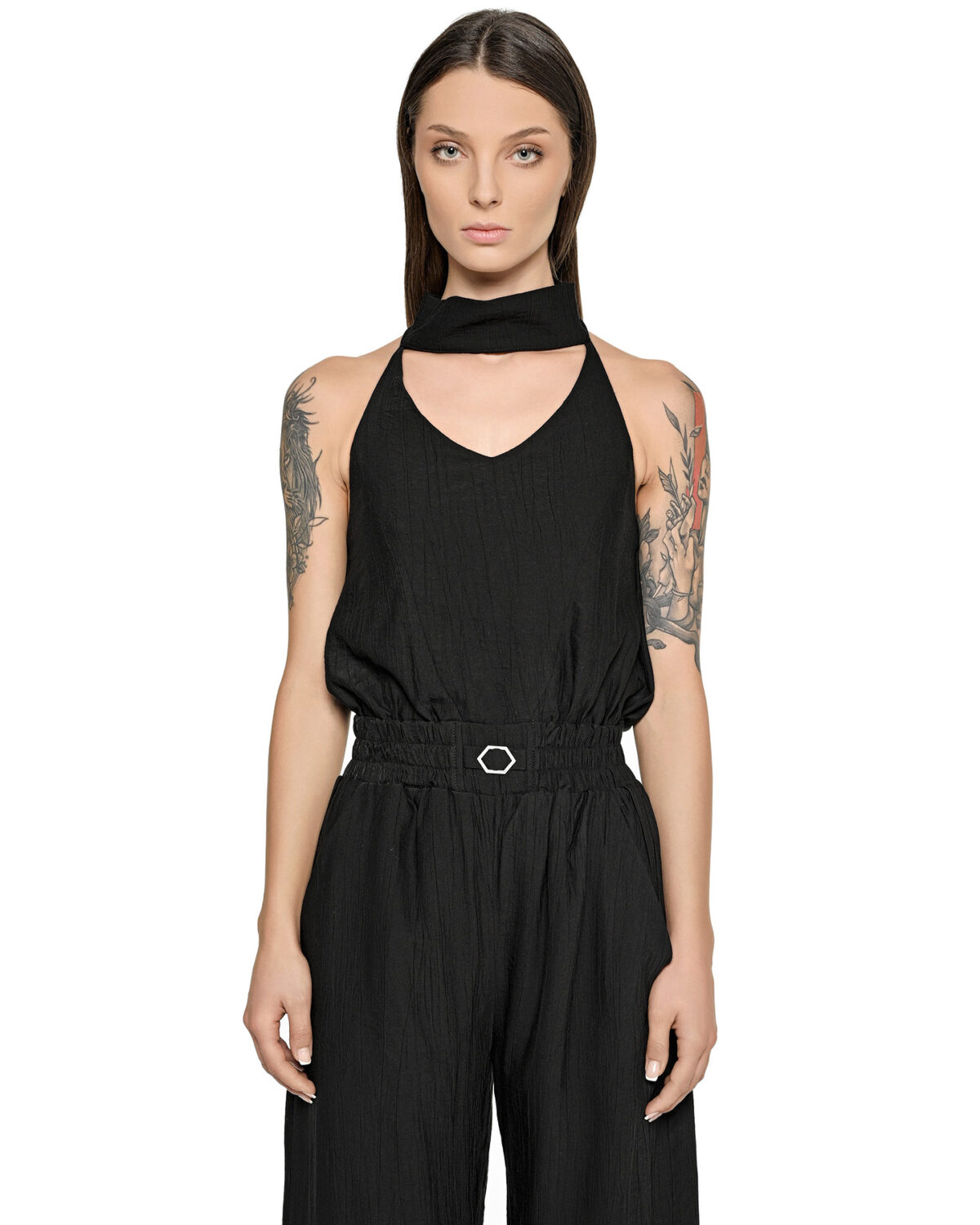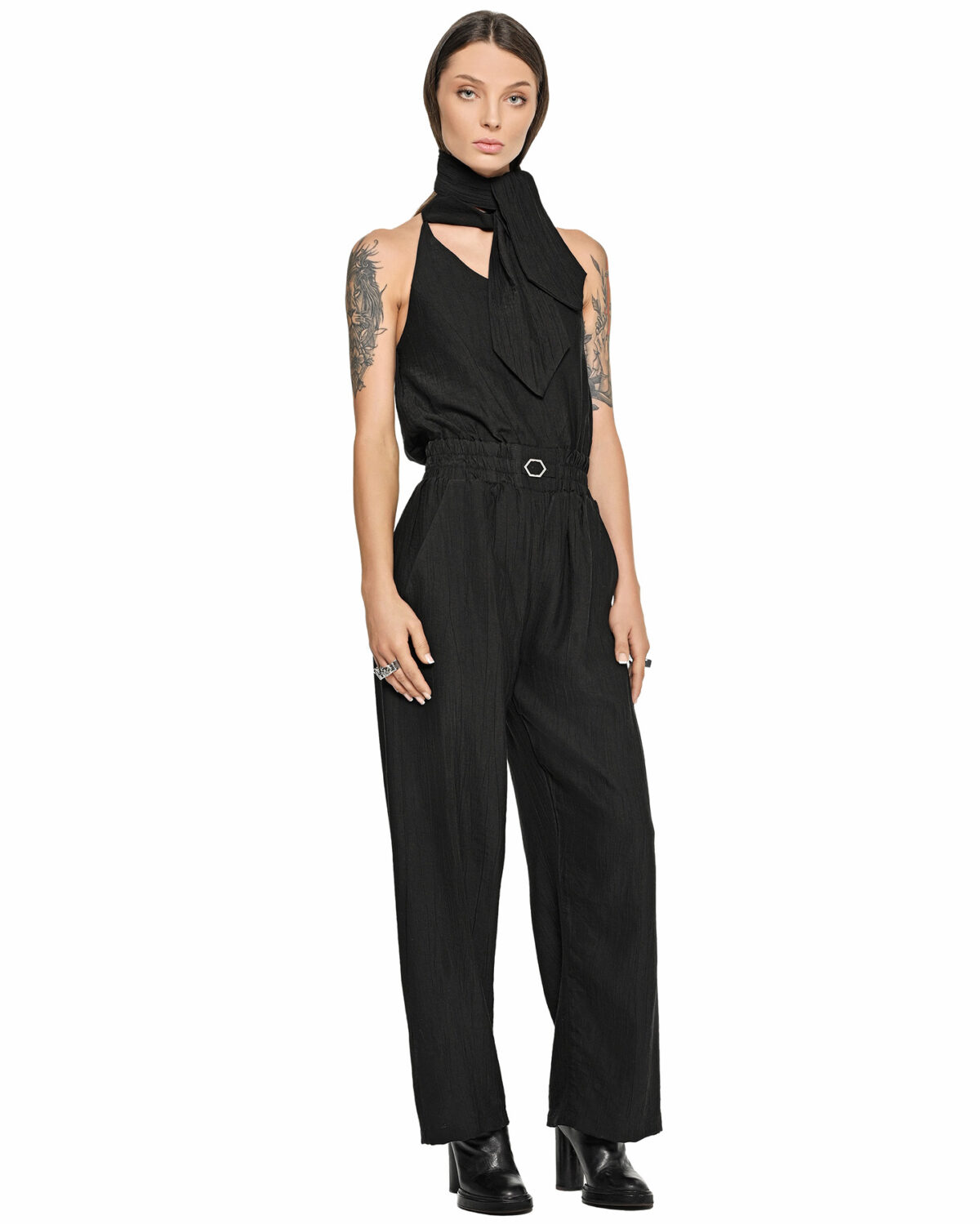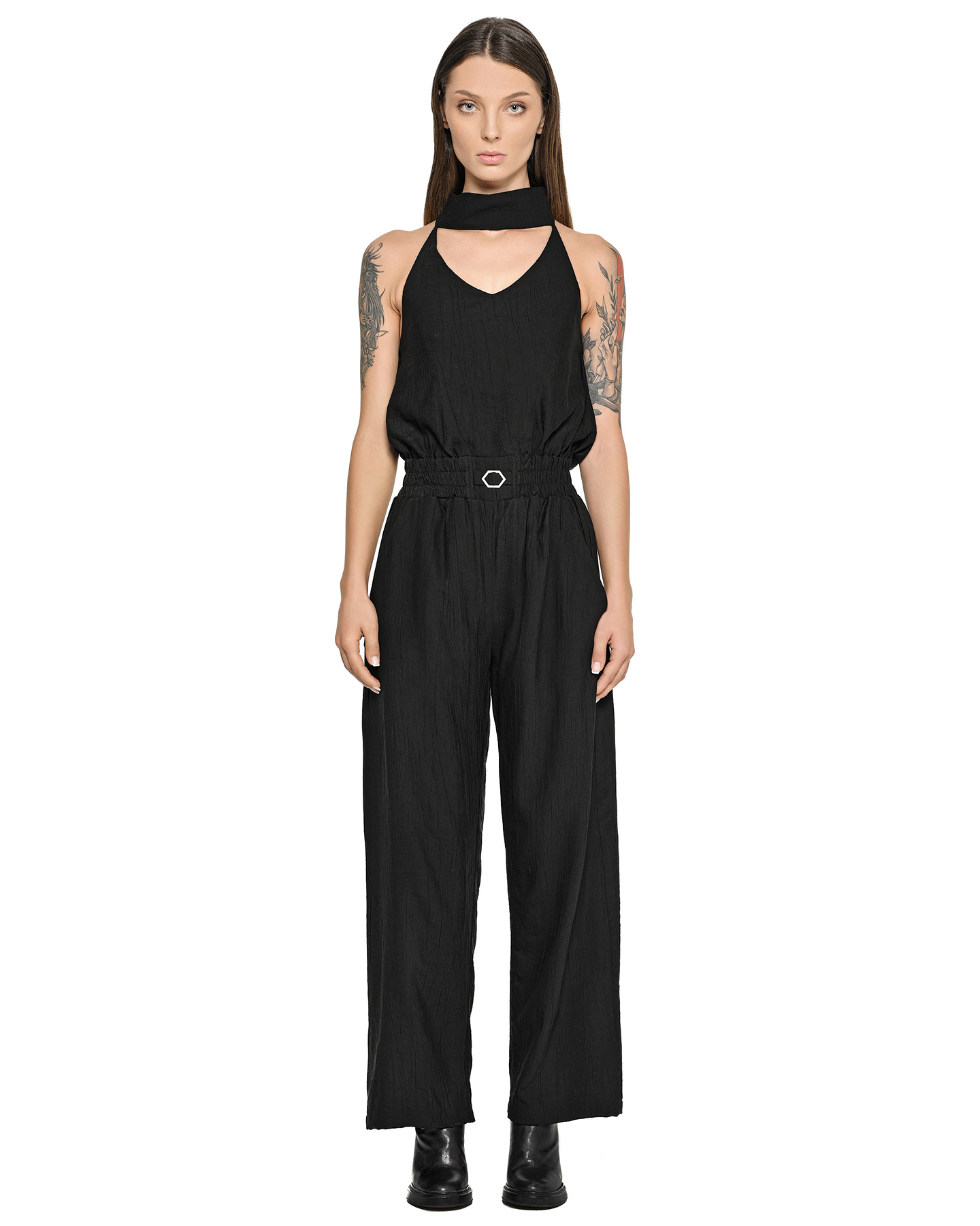 The Array Bow Collar Black Overall establishes a relaxed, lightweight silhouette defined by an elongated wrap collar with a rear ribbon-style adjustment and elasticated waistline.