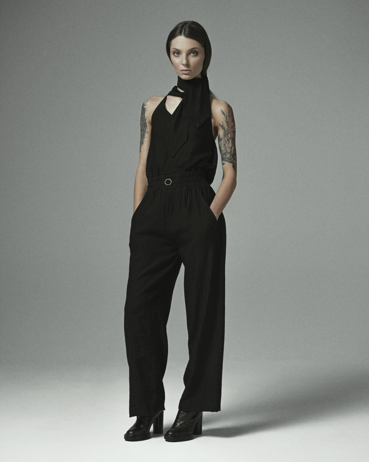 Der Array Bow Collar Black Overall zeichnet sich durch eine legere, leichte Silhouette aus, definiert durch einen verlängerten Wickelkragen mit rückseitiger Schleifenverstellung und einen elastischen Taillenbund.