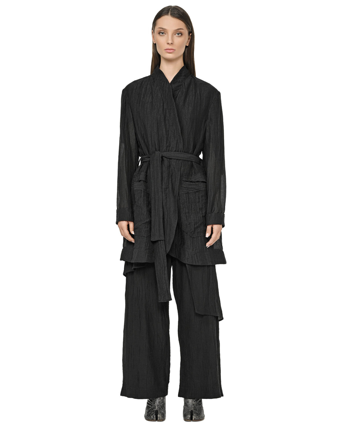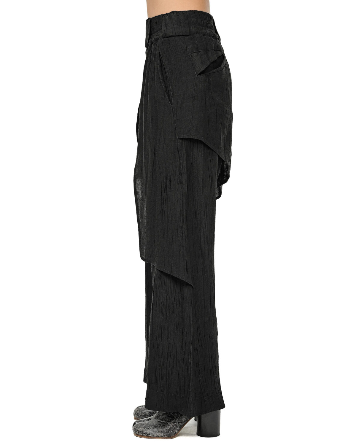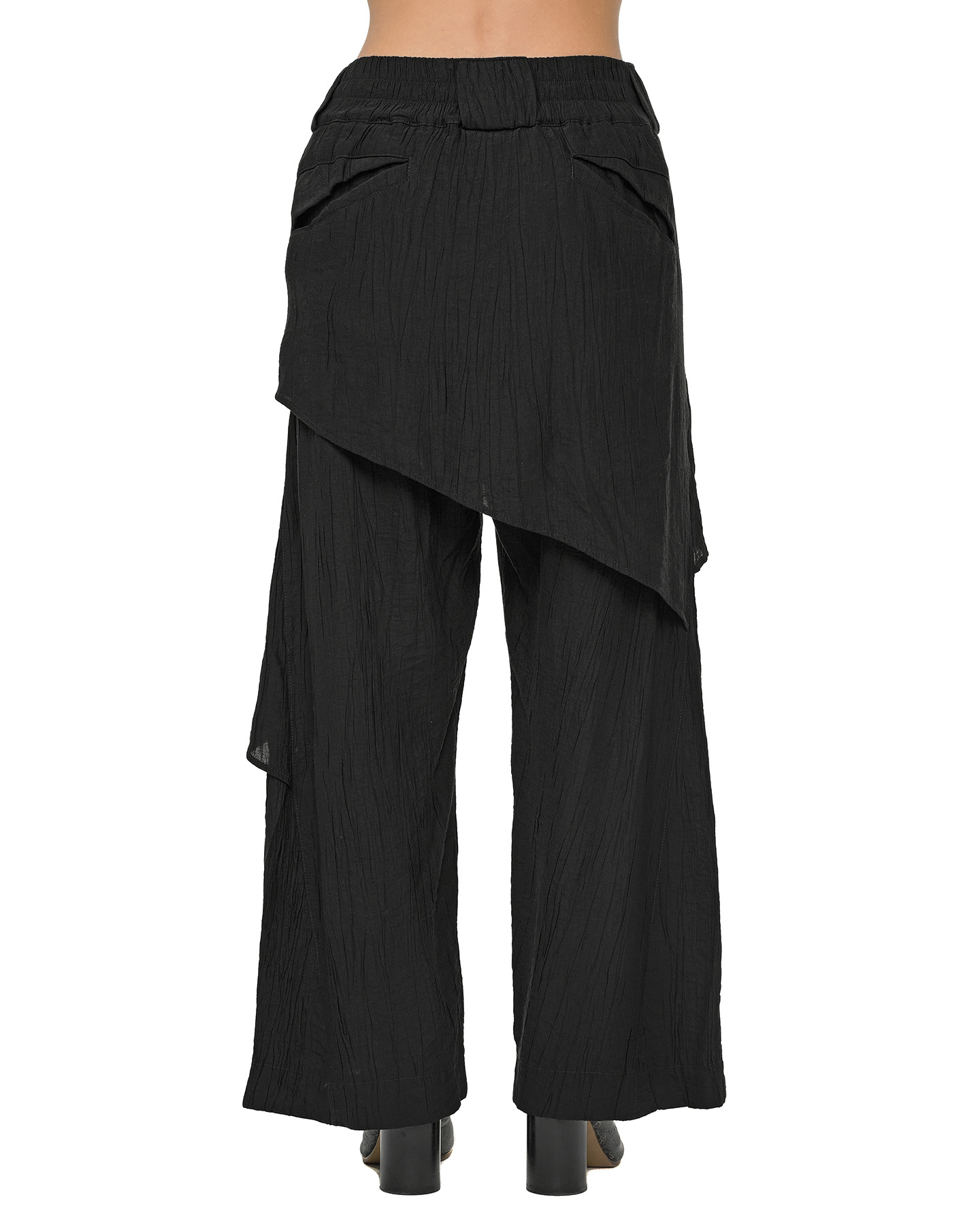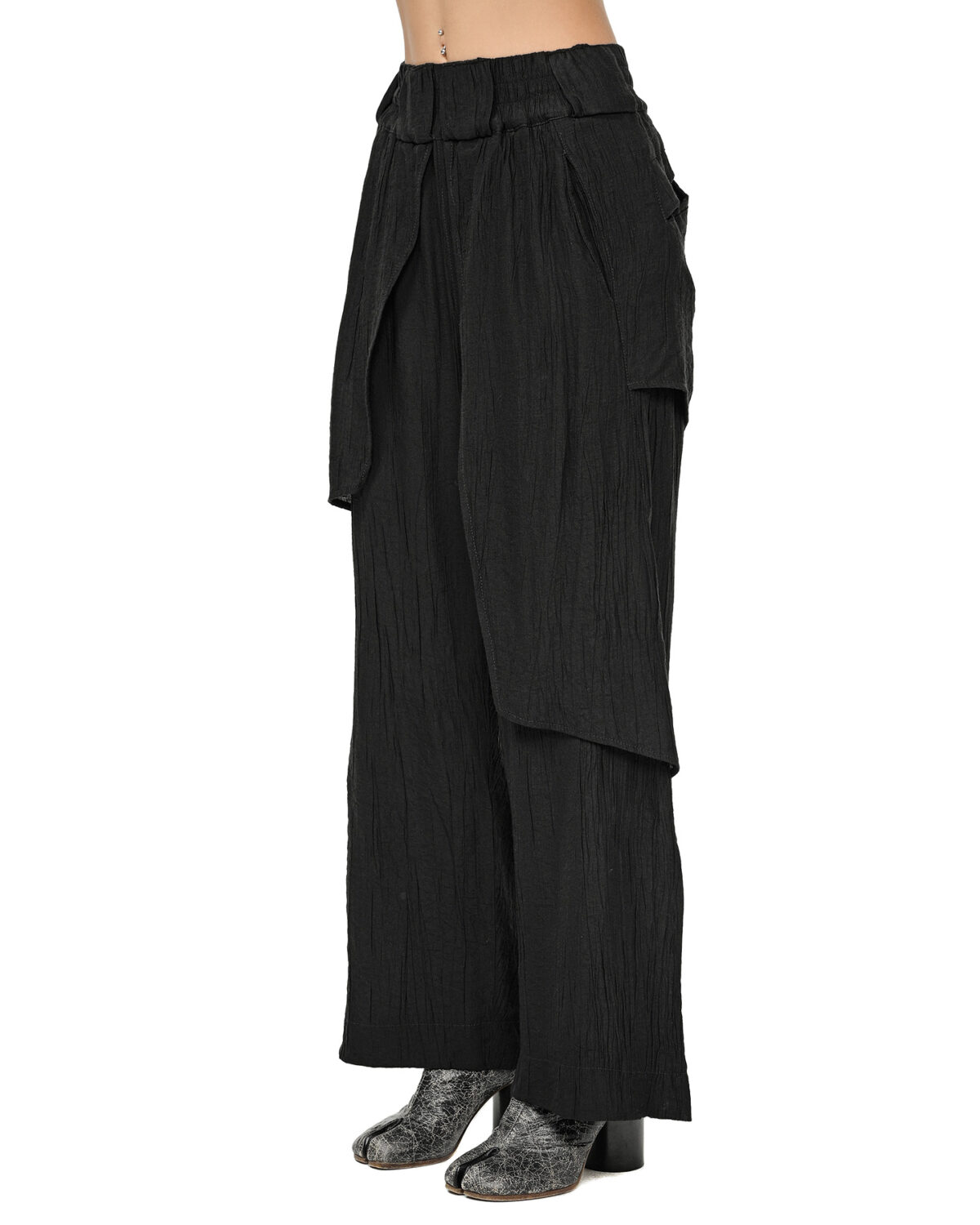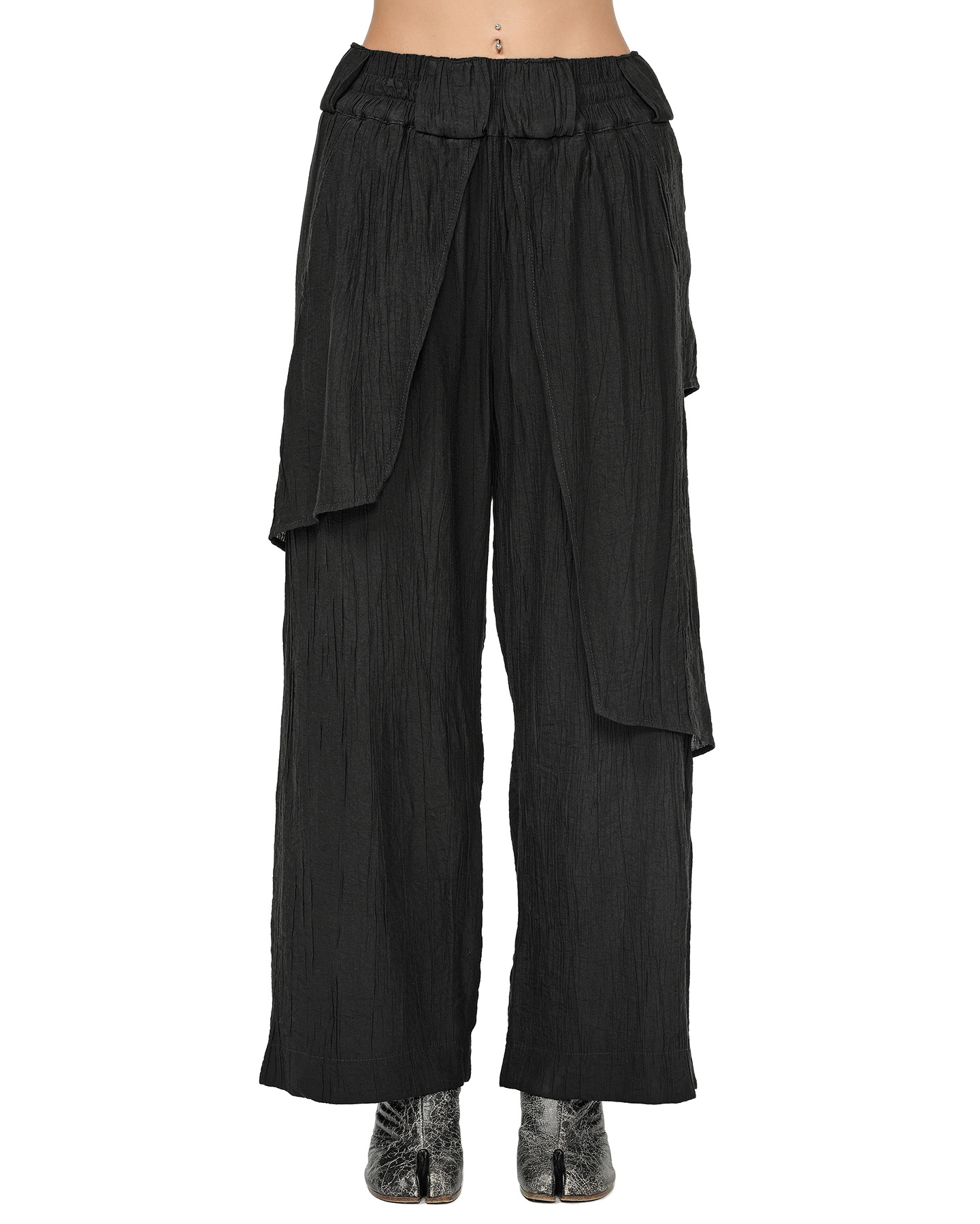 The Array Soft Layers Pants are defined by geometrically cut, asymmetrically descending layers of lightweight, wrinkled processed fabric that create an ethereal, loose-fit silhouette.