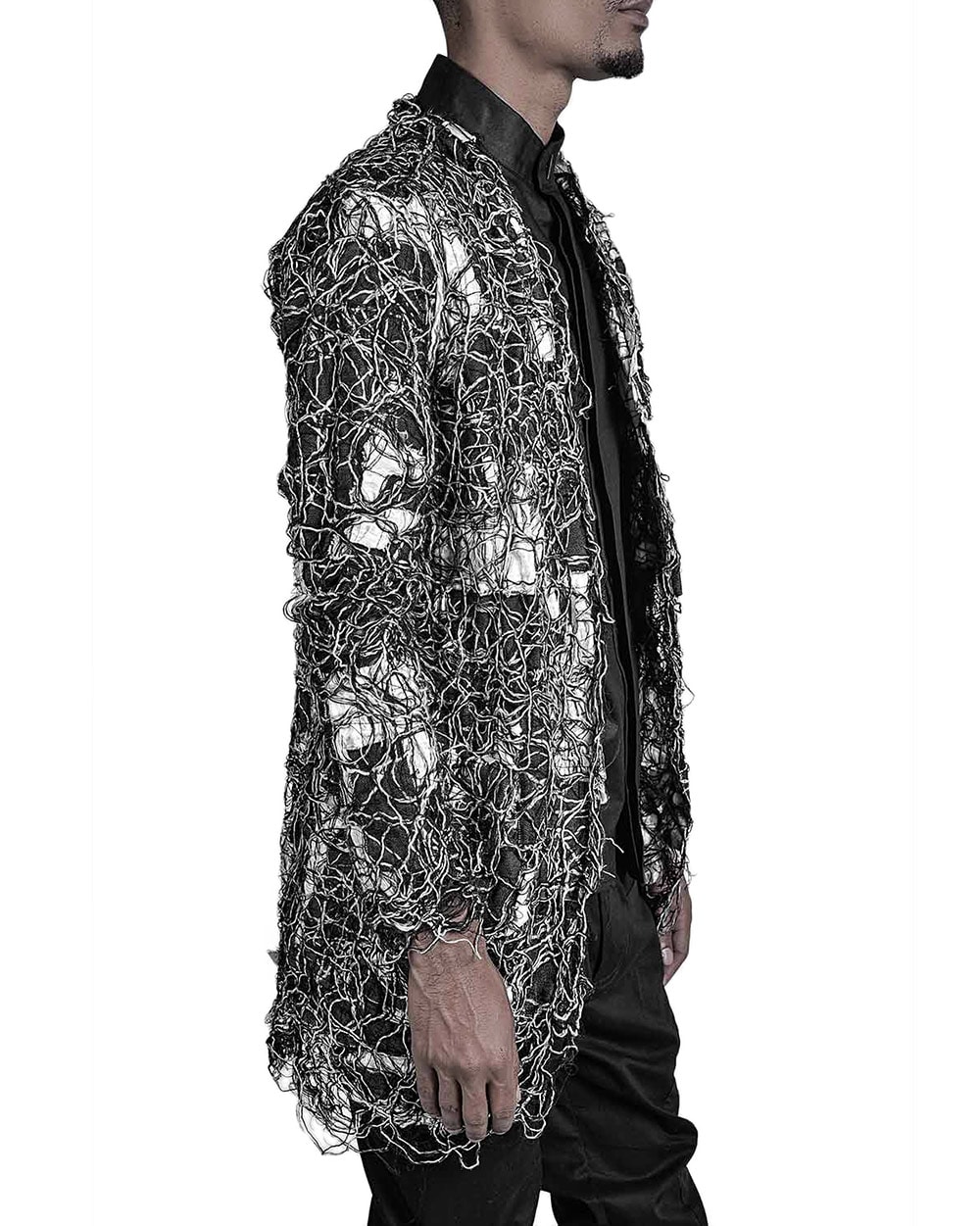 A technique crafted through intertwined natural fibers and yarns reinforced with the eponymous ‘Boro’ patchwork technique resulting in a strong and durable bond. This Fiber Bond garment possesses individualistic and one of a kind character.