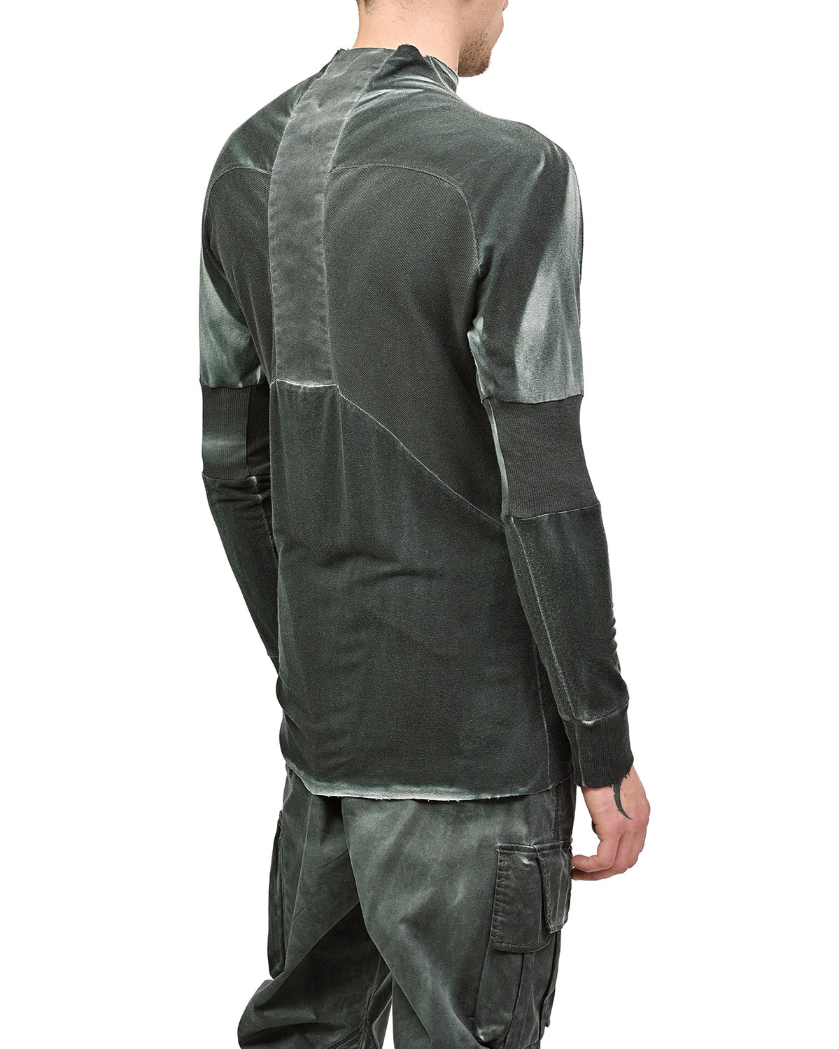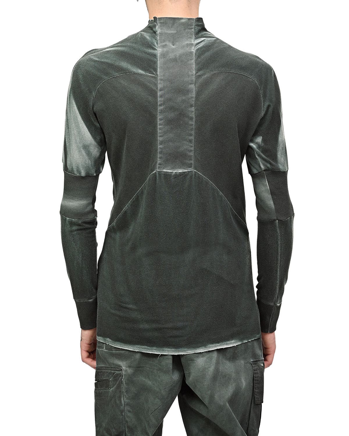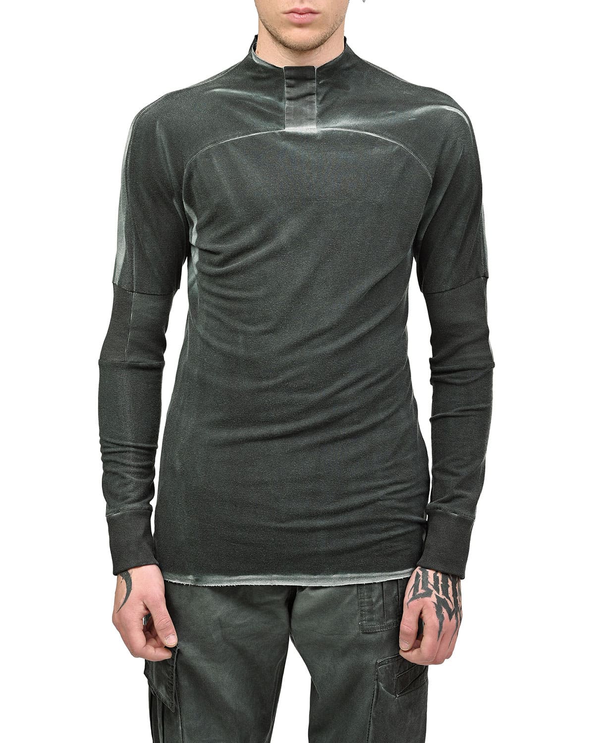 This ‘Insolitum’ Charge Long-sleeve top is crafted in soft, knitted cotton in unique object-dye color texture in a complex nuance and shades in Pine Green to grey color enhancing the garment’s complex multi-segment cut pattern.
