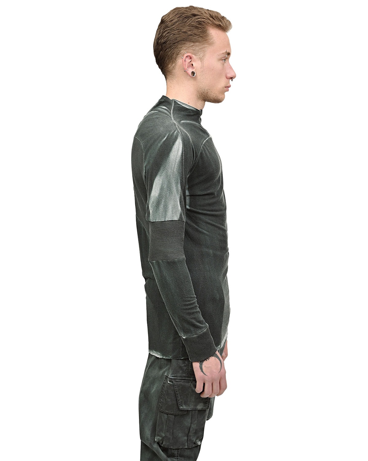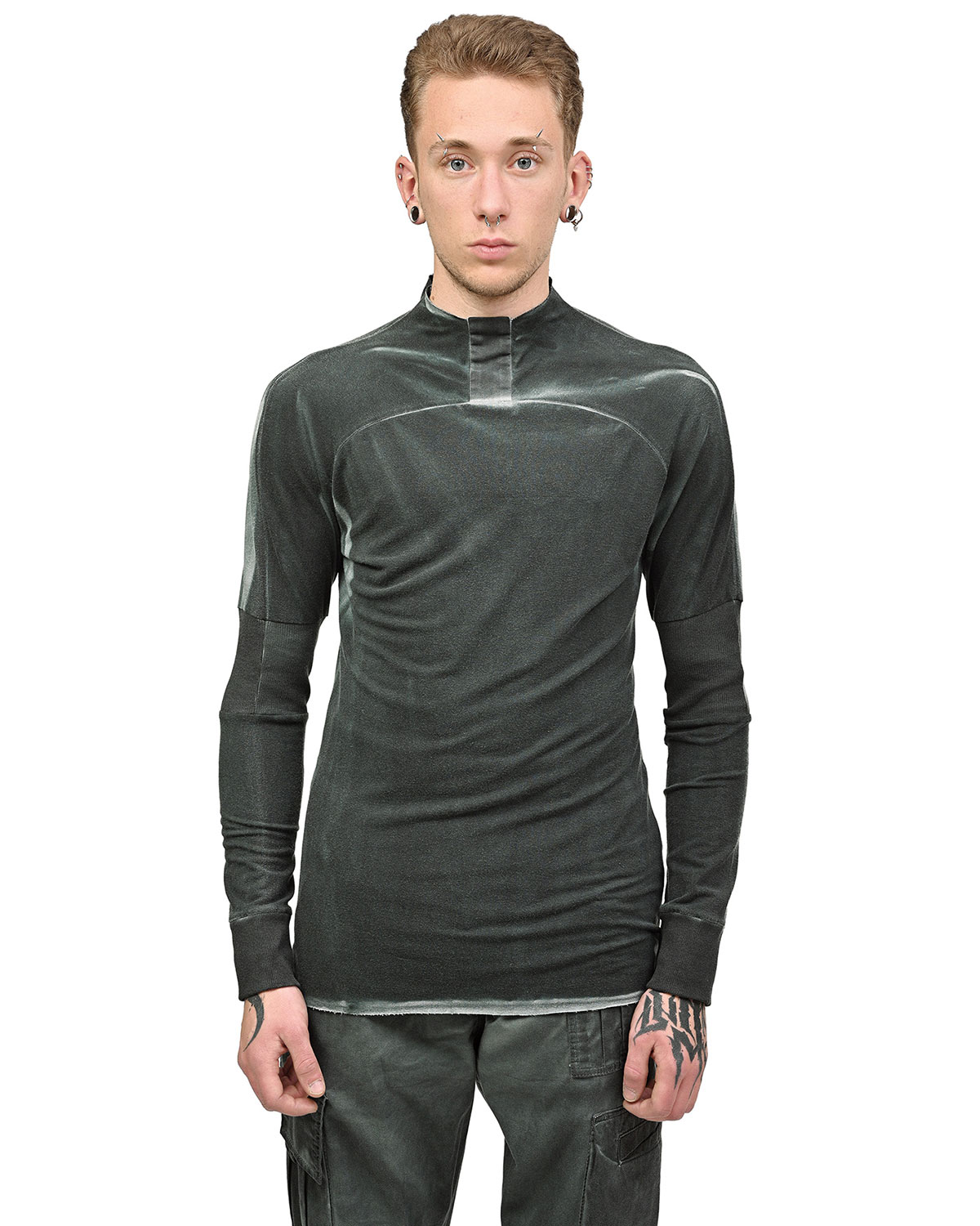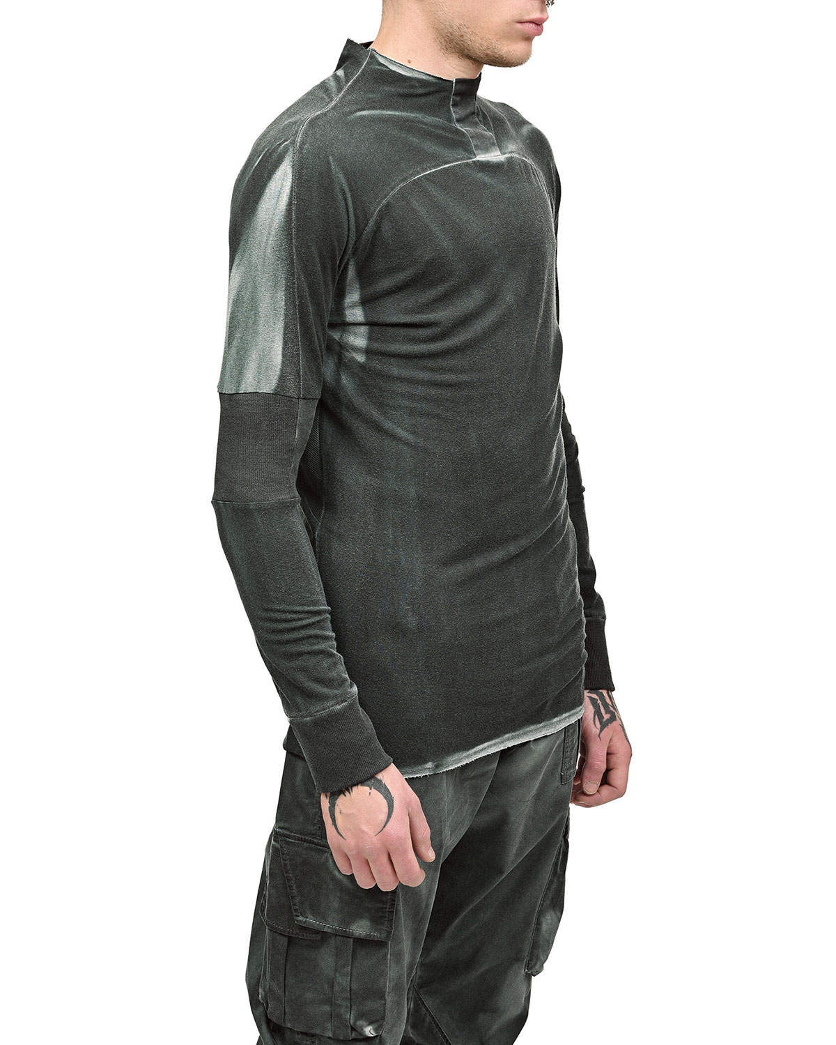 This ‘Insolitum’ Charge Long-sleeve top is crafted in soft, knitted cotton in unique object-dye color texture in a complex nuance and shades in Pine Green to grey color enhancing the garment’s complex multi-segment cut pattern.