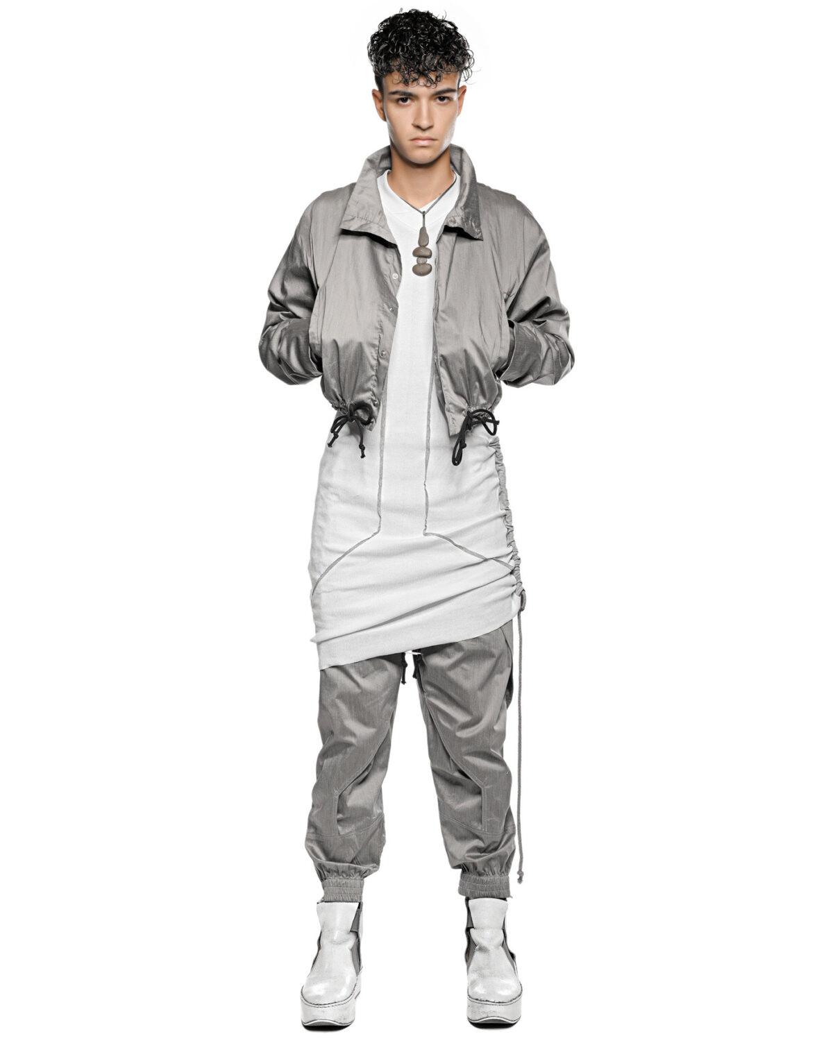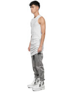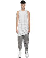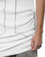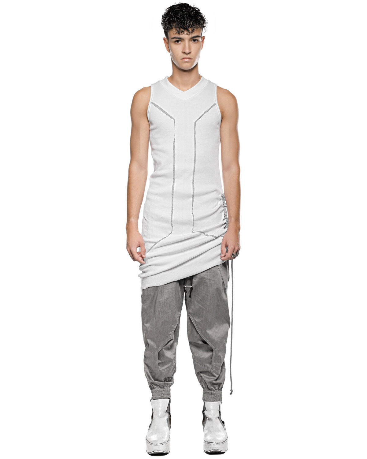 This elongated tank top translates the Cluster concept into a fitted silhouette, where a multi-panel geometric design is articulated by external contrast seams. The adjustable ruched side allows for a customized fit, while the ribbed knit texture and raw hem add a layer of tactile, artisan detail.