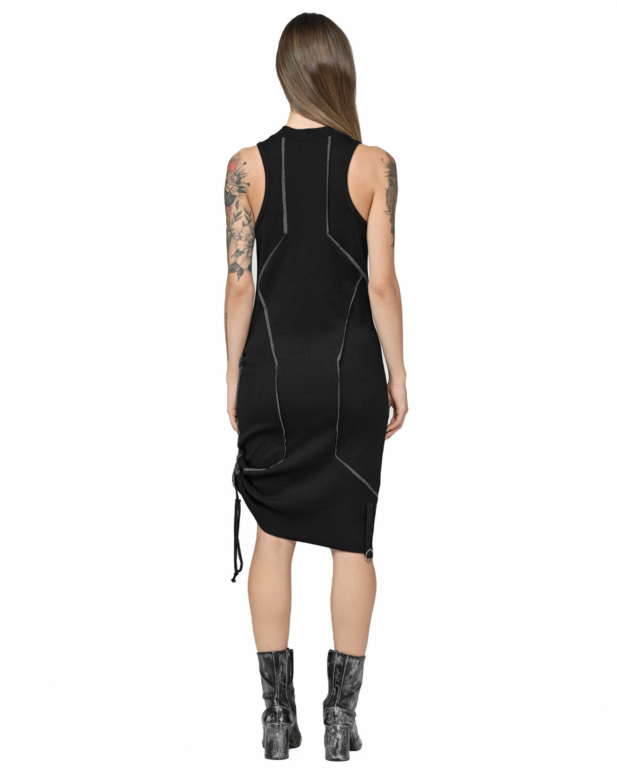 This Cluster Adjustable Long Tank Top translates concept into a fitted silhouette, where a multi-panel geometric design is articulated by external contrast seams.