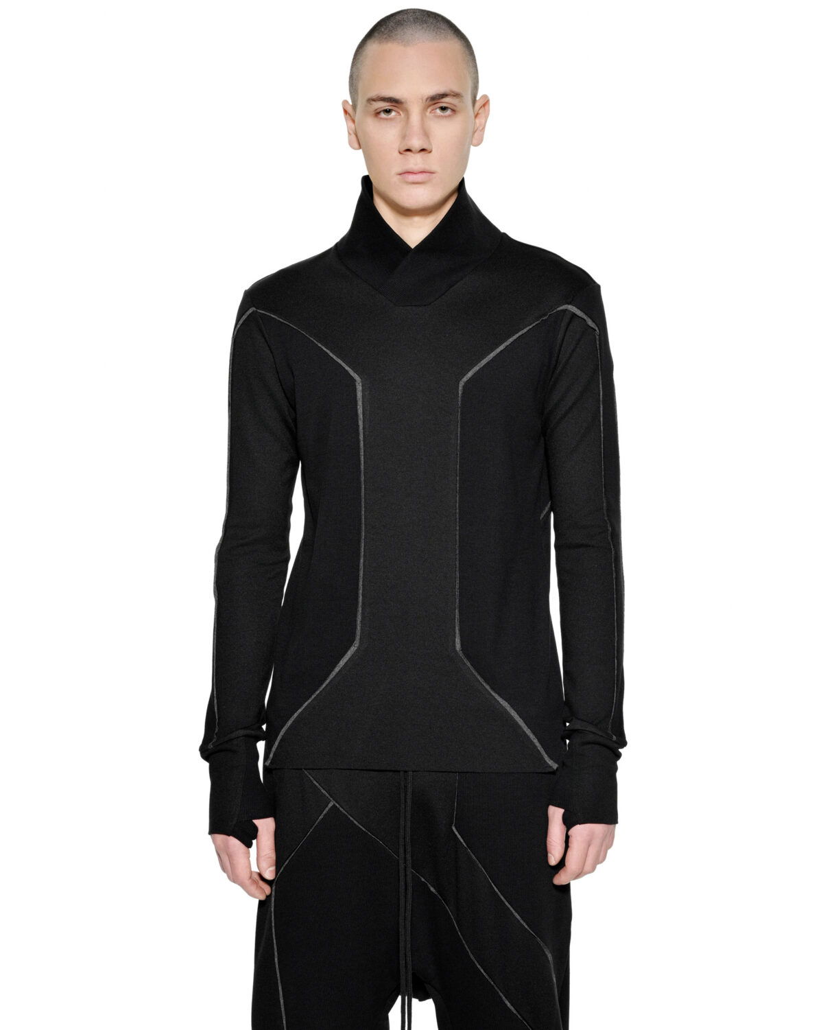 The Cluster External Seam Collar Sweater features a regular silhouette in black, crafted with a multi-panel geometric design and ribbed knit texture.