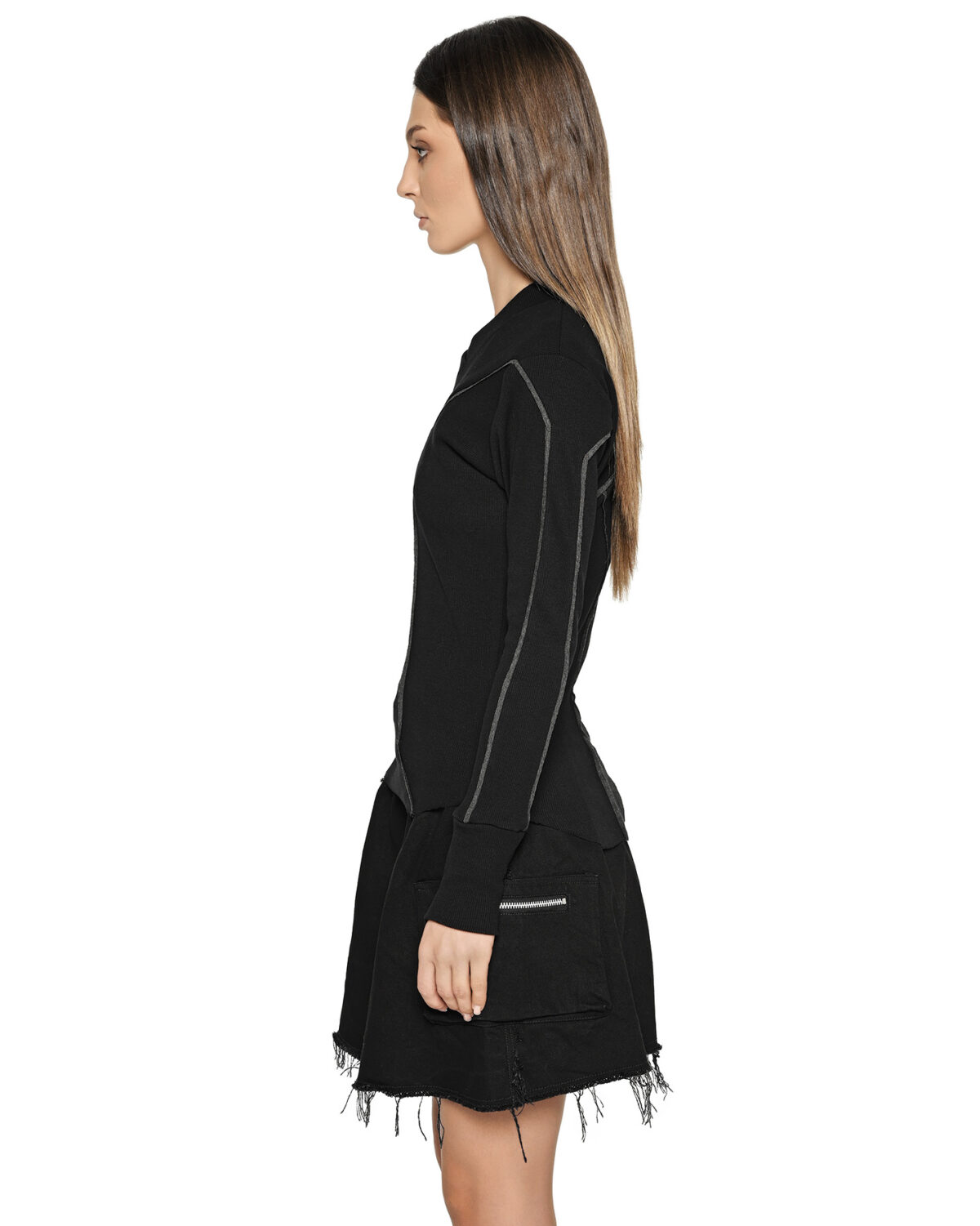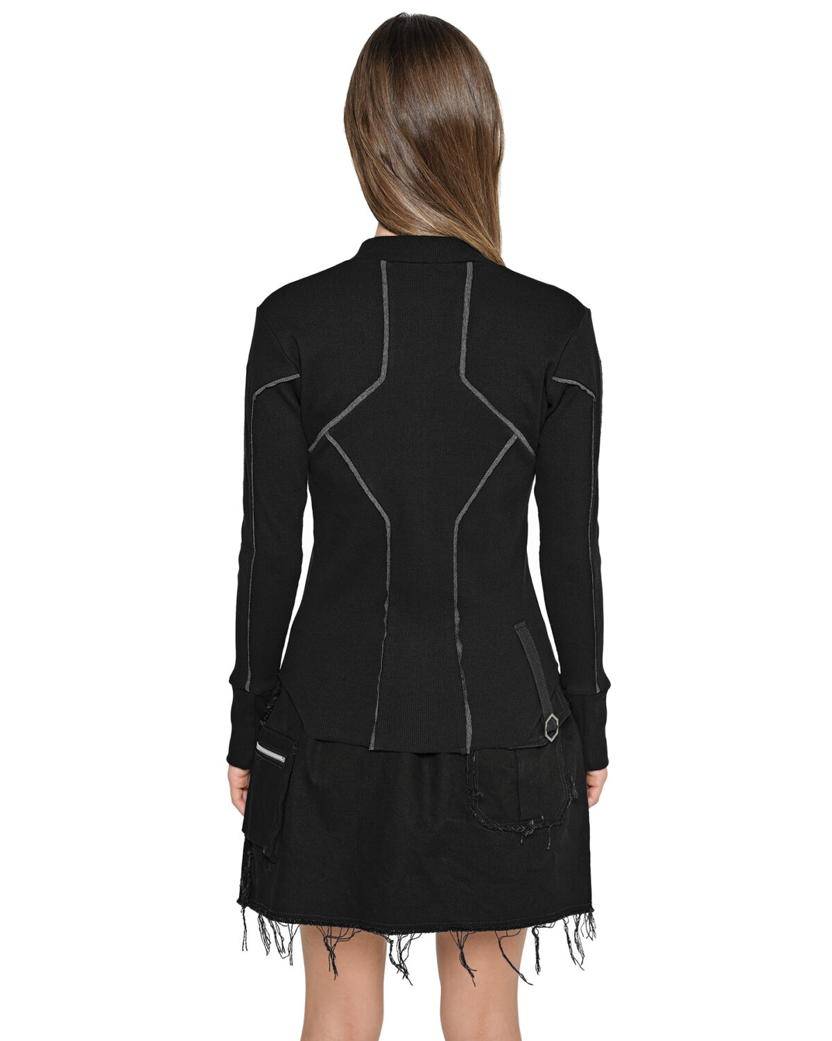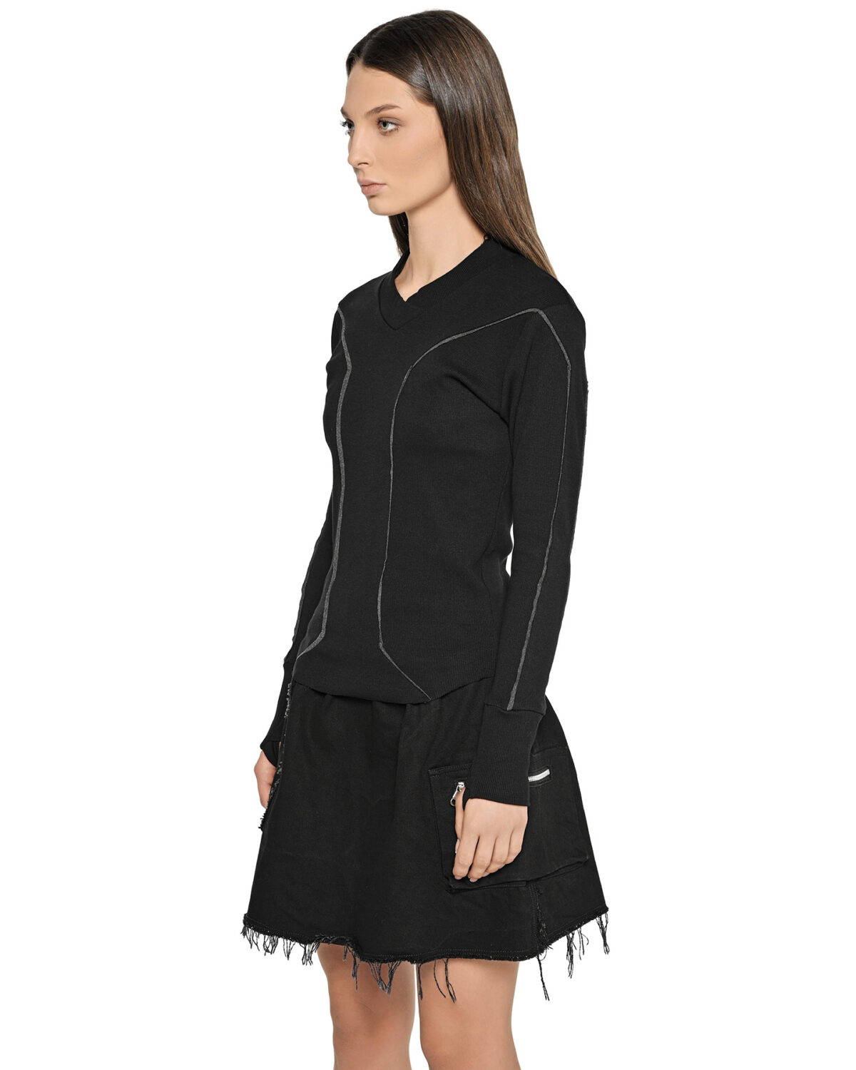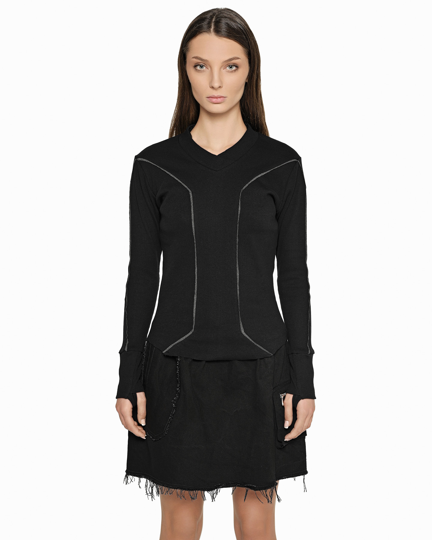 The upper, defined by an overlapping V-neck and thumbholes at sleeve cuffs, is balanced by the asymmetrical finish of a raw hem and a signature hexagon steel loop.