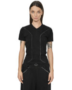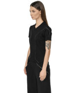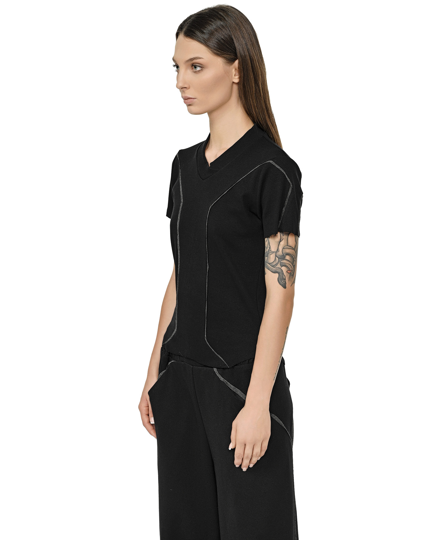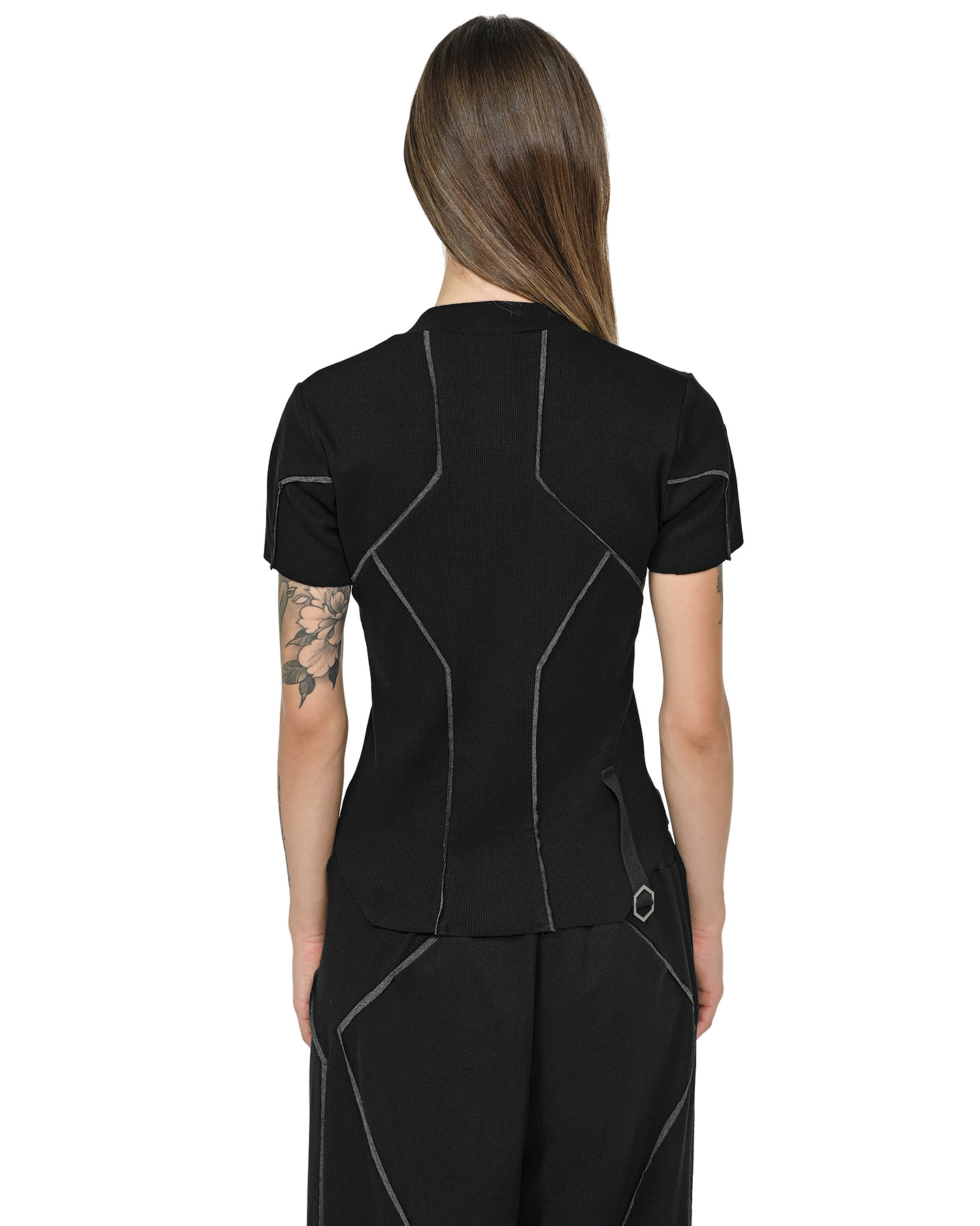 The Cluster External Seam T-shirt obtains its multi-panel geometric construction from the external grey contrast seams that map the black ribbed knit.