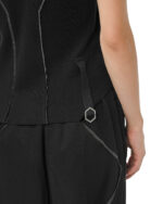 This design is defined by a regular silhouette and a deconstructed raw hemline. An overlapping V-neckline and short sleeves frame the garment, finished with a signature hexagon steel loop at the side as a key focal point.