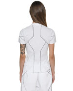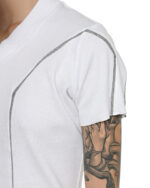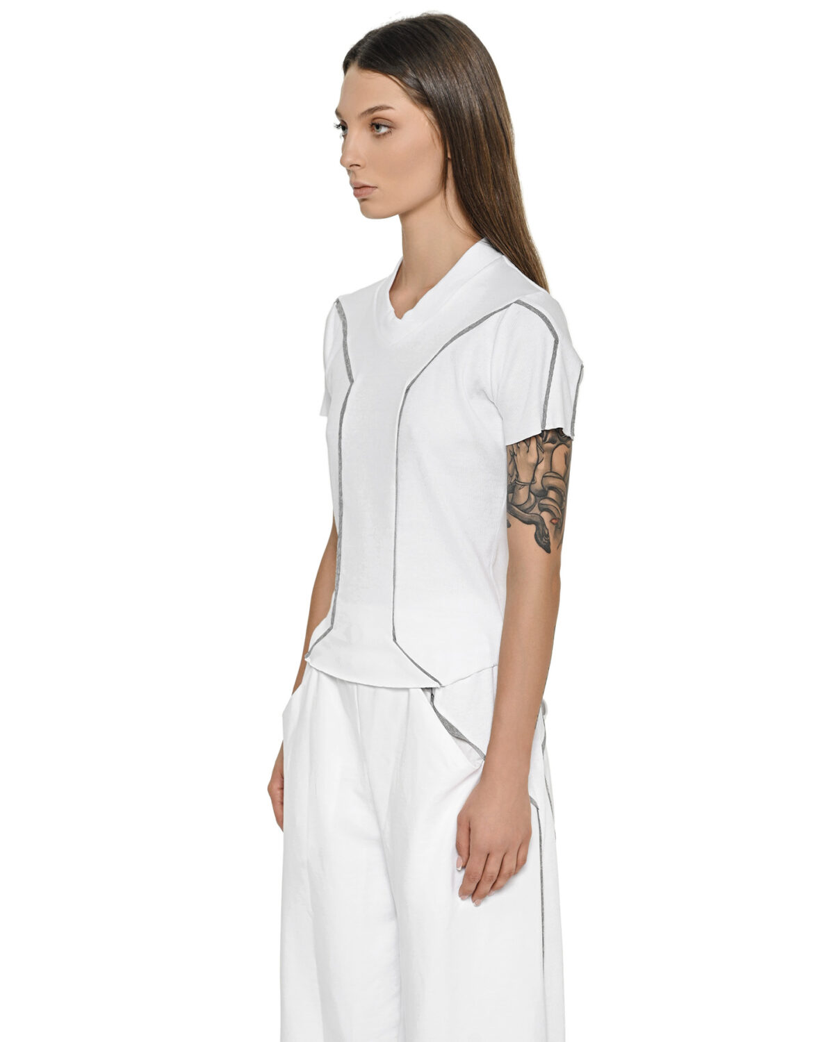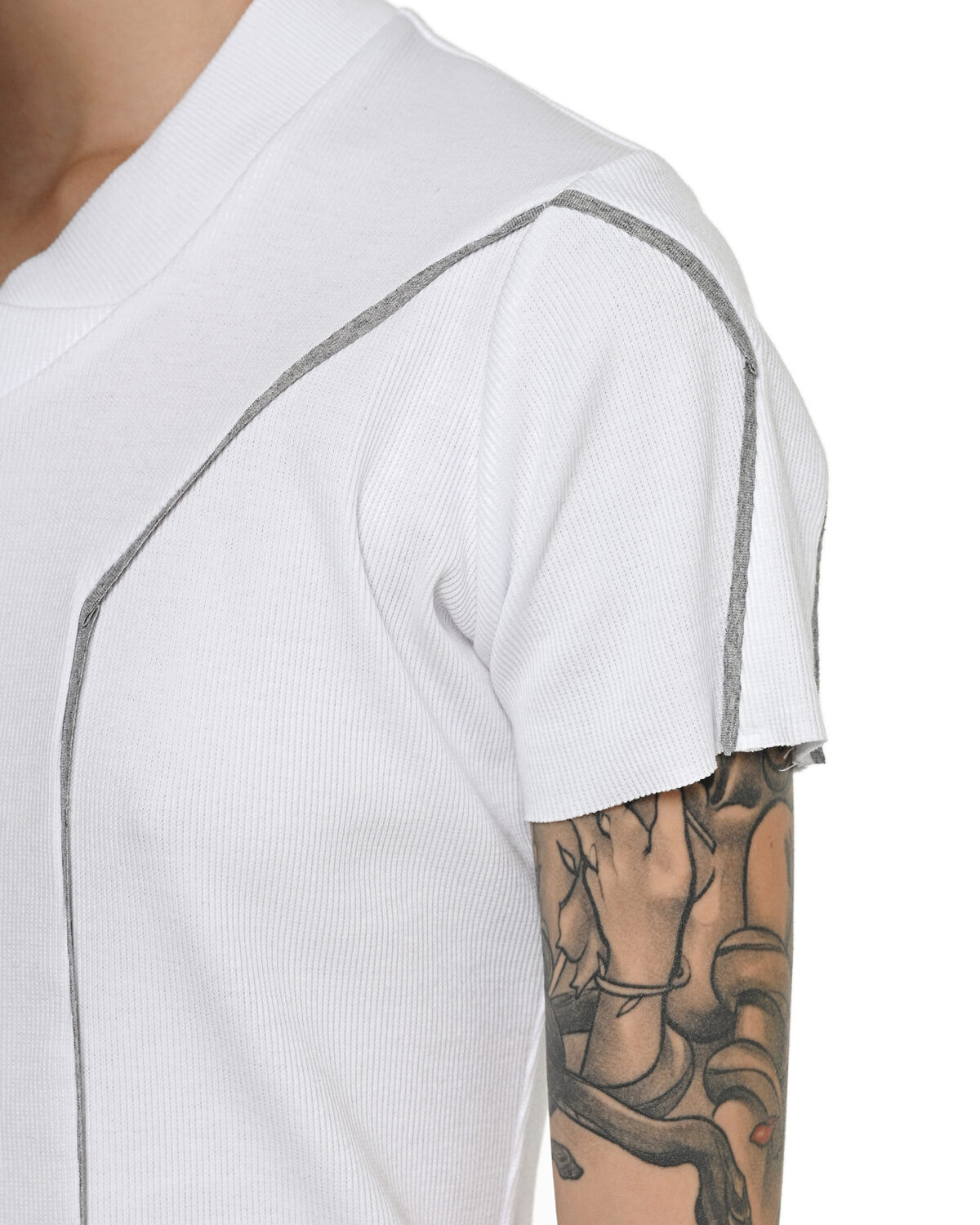 The Cluster External Seam T-shirt obtains its multi-panel geometric construction from the external grey contrast seams that map the white ribbed knit.
