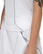 This design is defined by a regular silhouette and a deconstructed raw hemline. An overlapping V-neckline and short sleeves frame the garment, finished with a signature hexagon steel loop at the side as a key focal point.