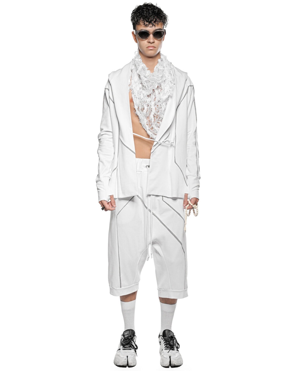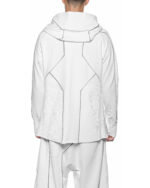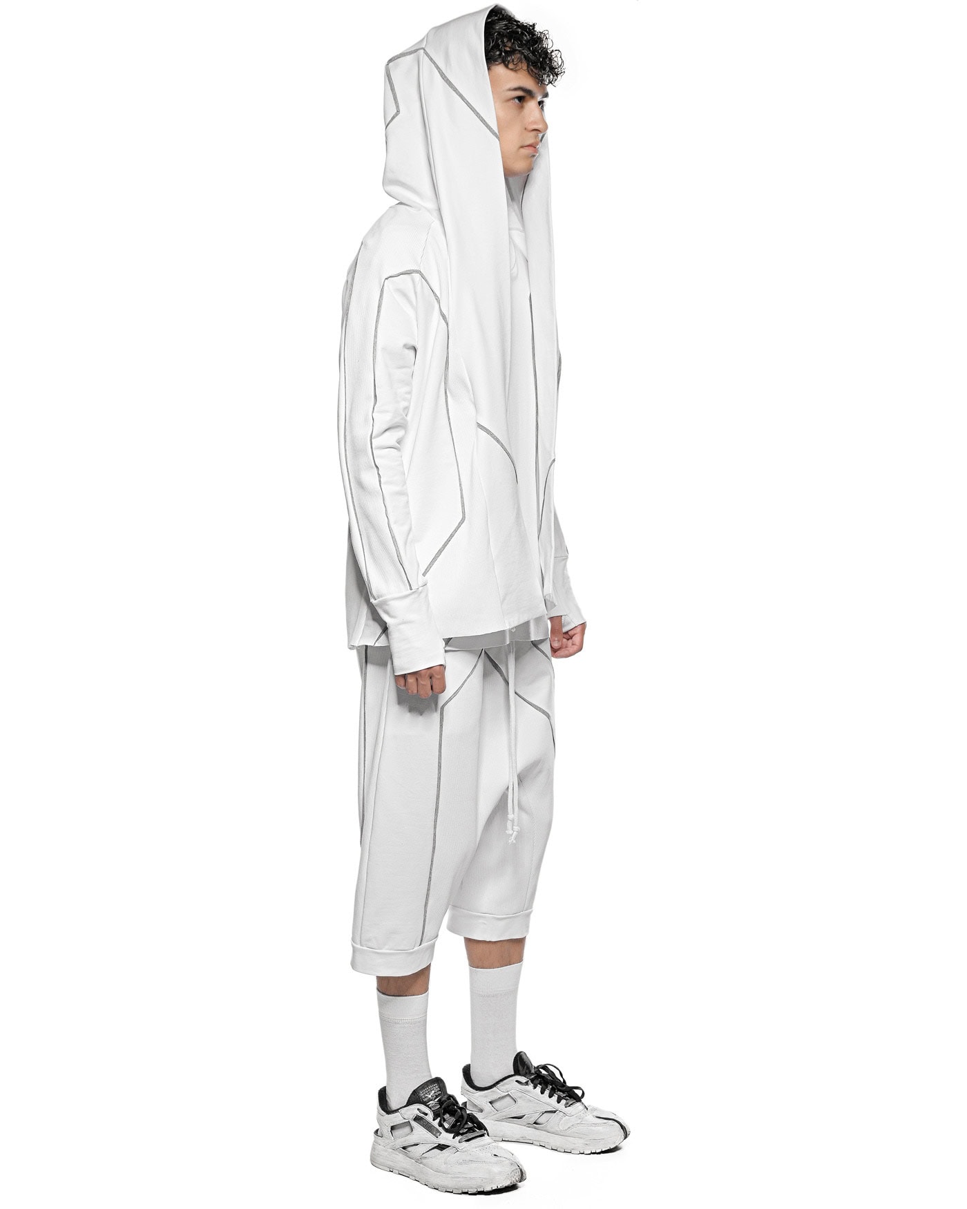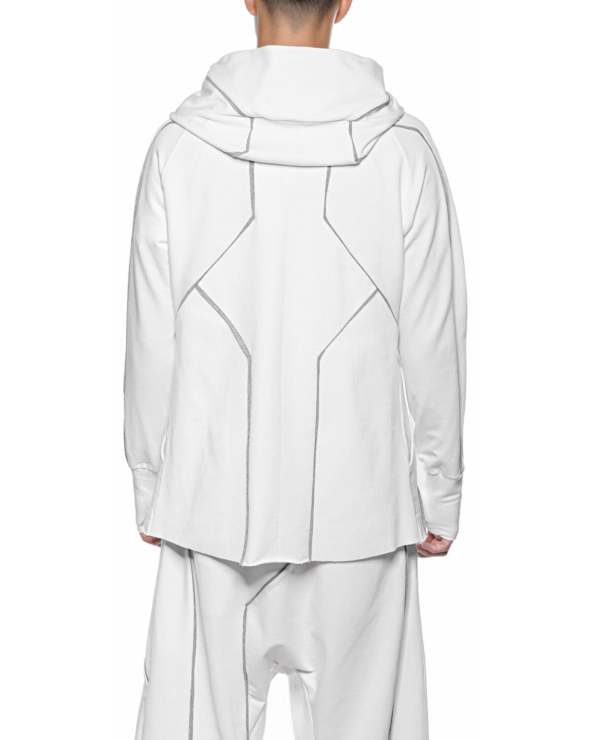 This hooded cardigan evokes a stellar Cluster, with its multi-panel geometric construction defined by external contrast seams that trace its form. The relaxed, open-front silhouette is crafted from a ribbed knit texture, offering a sophisticated layering piece that is both visually complex and easy to wear.