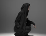 Diese Strickjacke mit Kapuze erinnert an einen stellaren Cluster. Die mehrteilige Konstruktion wird durch äußere Kontrastnähte definiert, die ihre Form nachzeichnen.