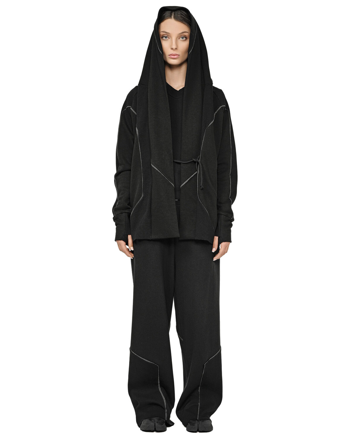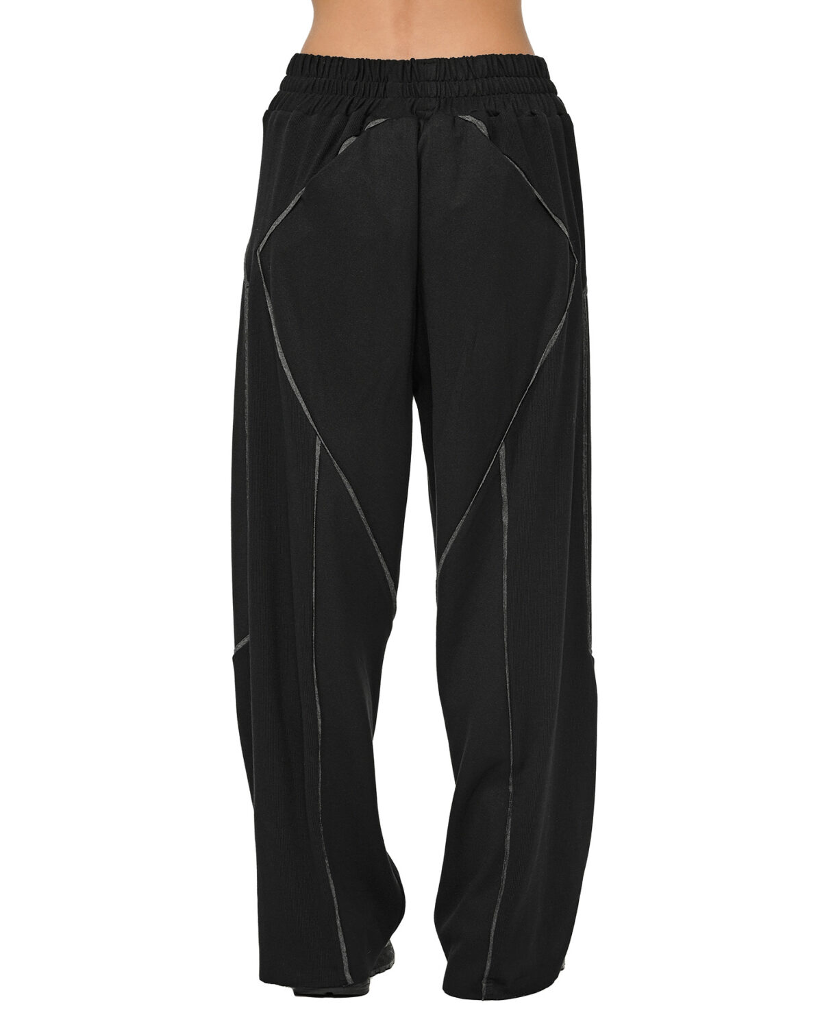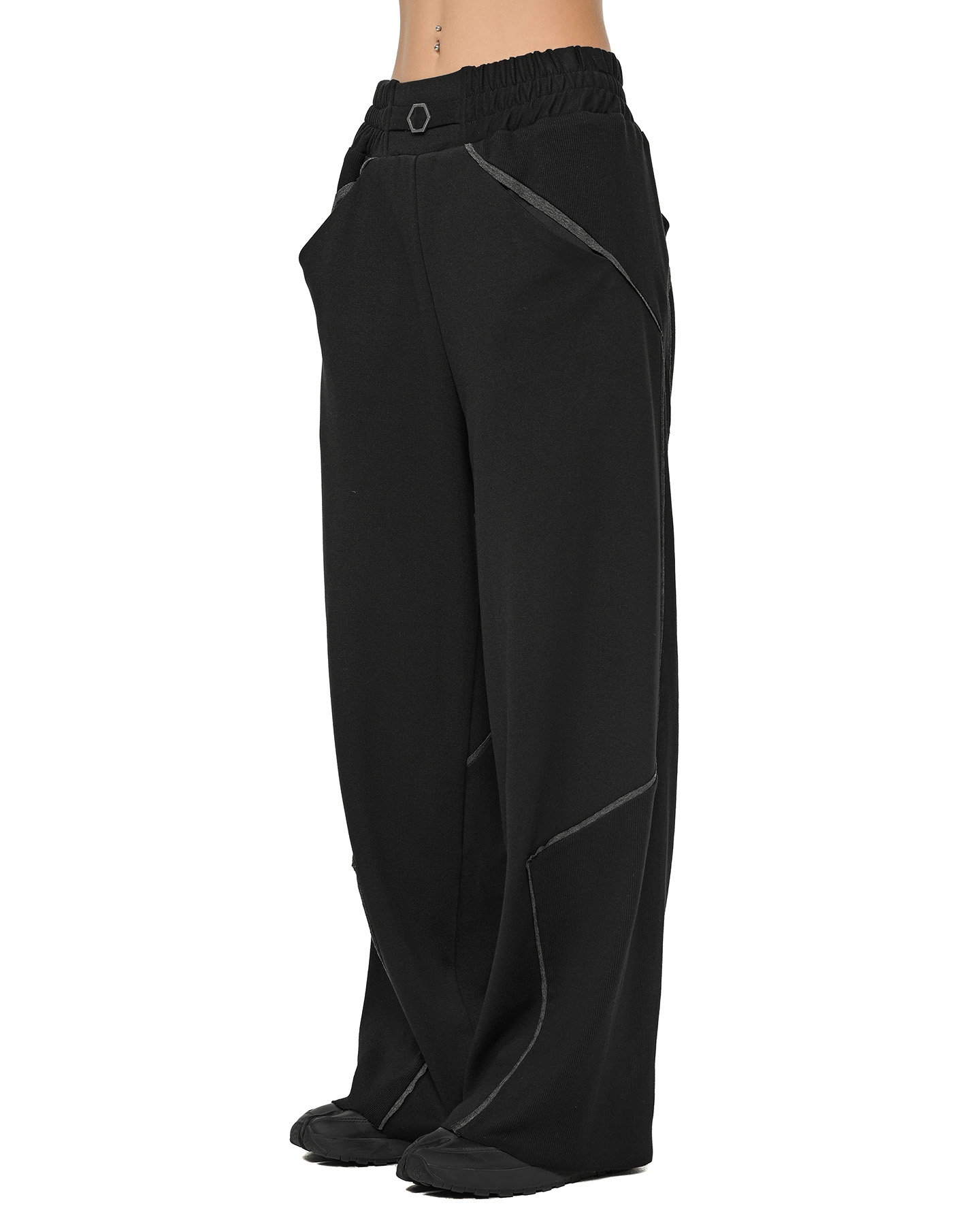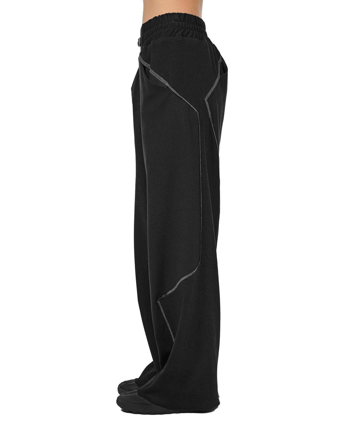 The Cluster Panel Flare Pants achieve their wide, relaxed silhouette through a multi-panel ribbed knit construction enhanced by external contrast seams in grey.