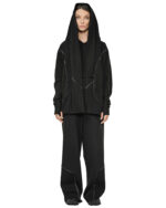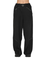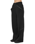 An elasticated waistband, secured by a signature hexagon steel buckle, fuses the utility of integrated slit pockets at the front and rear with the deconstructed design.