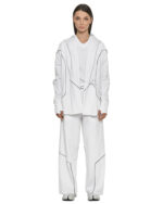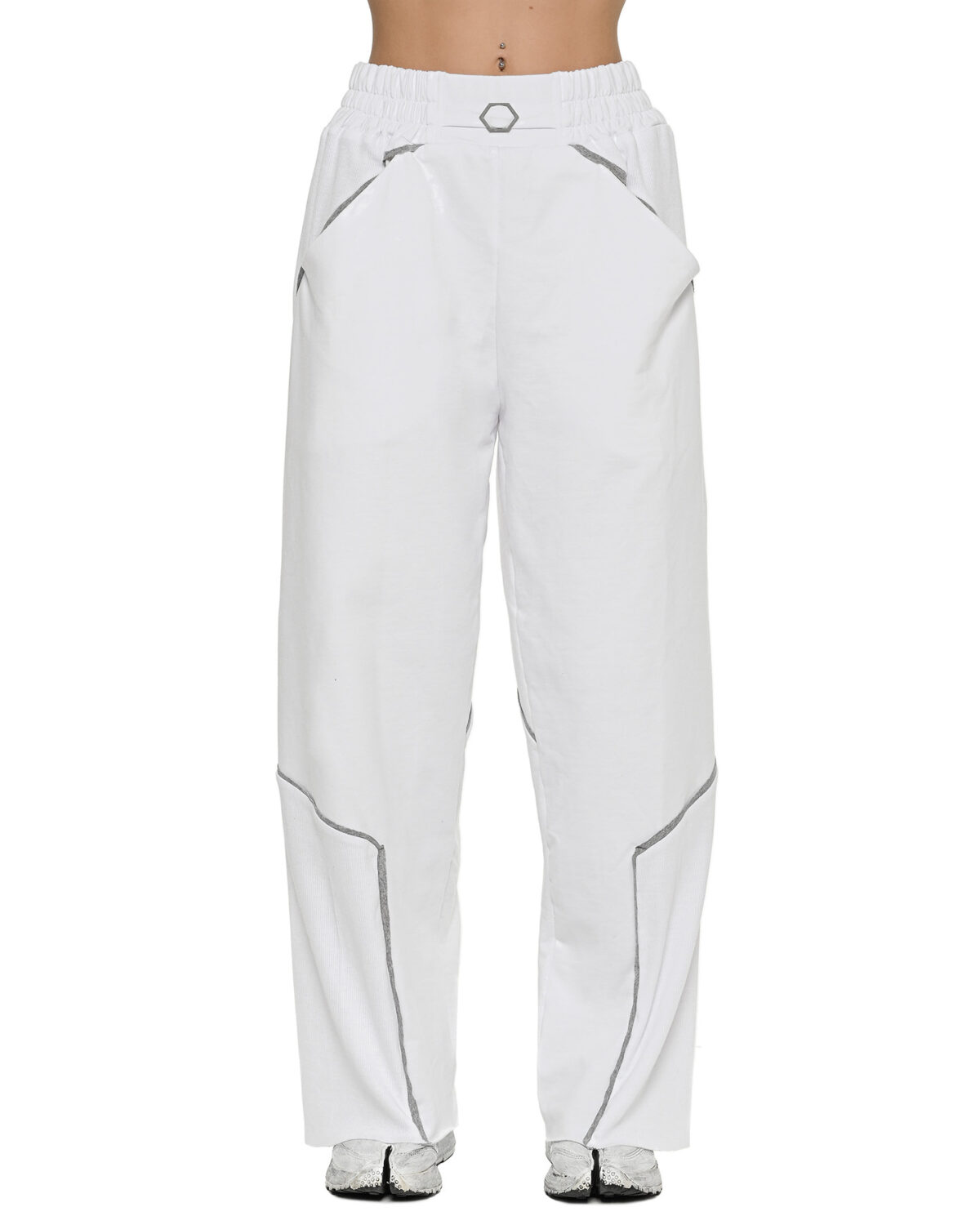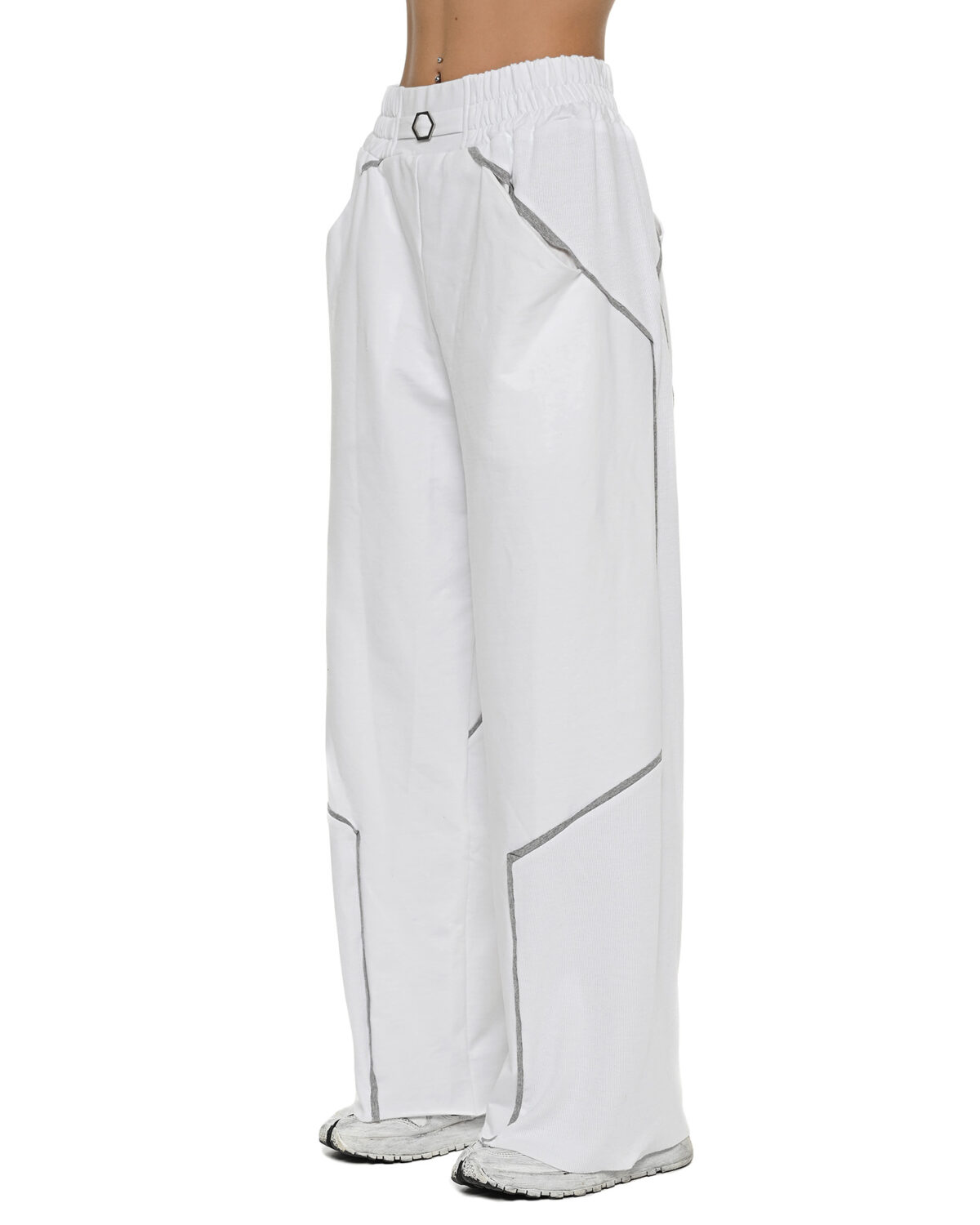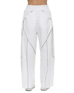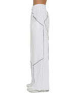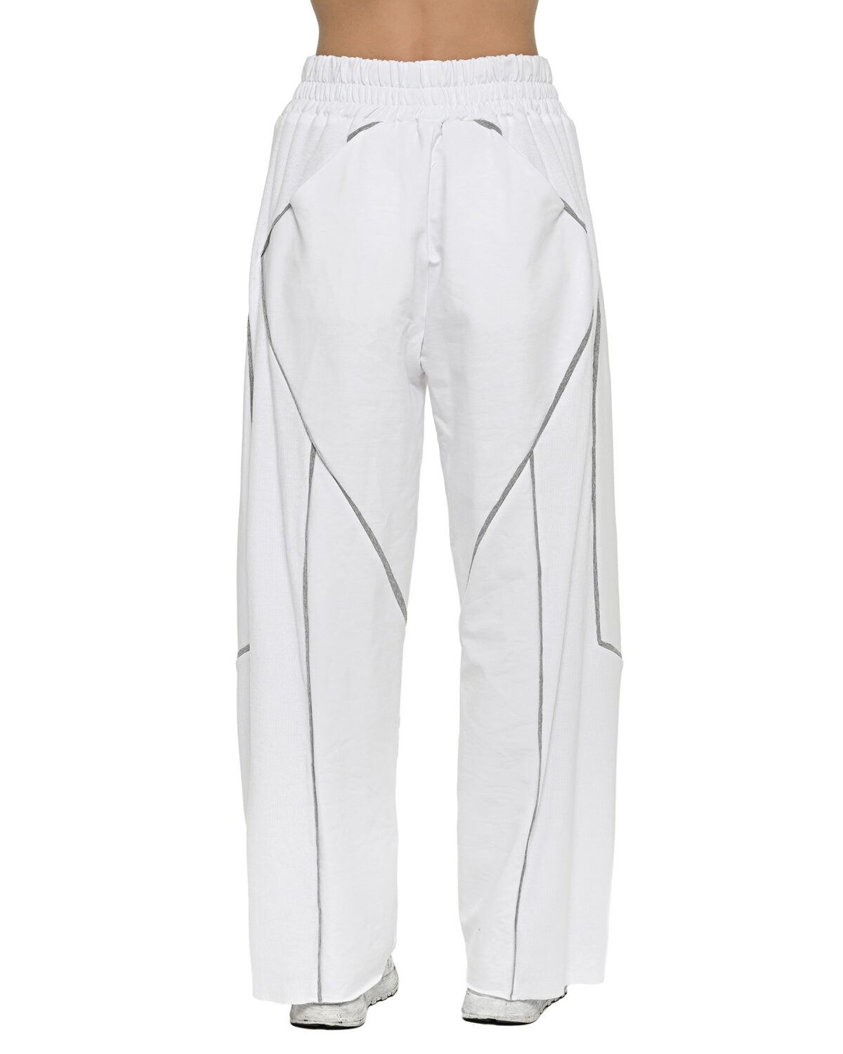 The Cluster White Flare Pants achieve their wide, relaxed silhouette through a multi-panel ribbed knit construction enhanced by external contrast seams in grey.