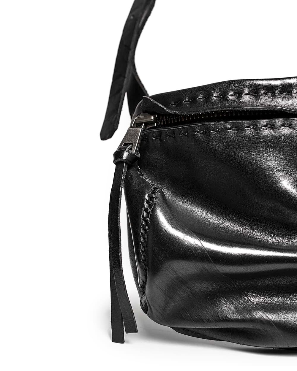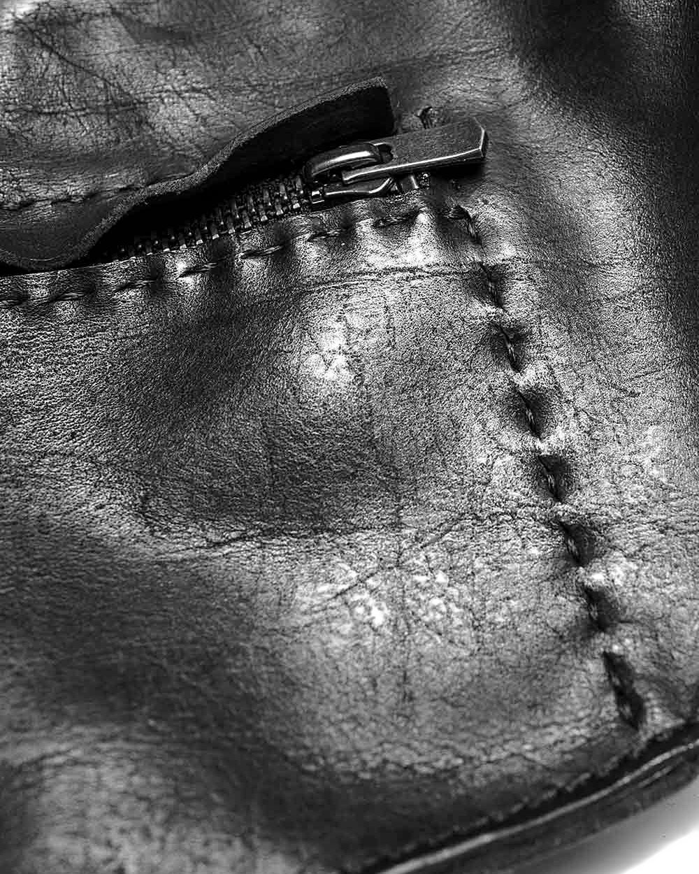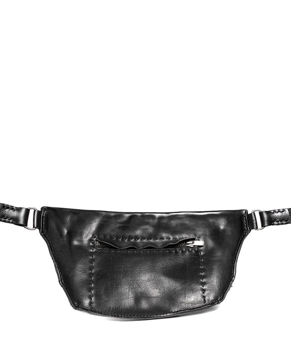 This Body bag is entirely hand sewn from high quality vegetable tanned leather. It has the design and characteristic of a fanny pack bag. The curved and molded shape is further developed with signature linear scar-scratch details and overall textured appearance. The beauty of the textured reversed leather is used in the rear part where a zip pocket is located. The adjustable buckle shoulder strap is crafted from thicker, yet softer leather with deep pores.
