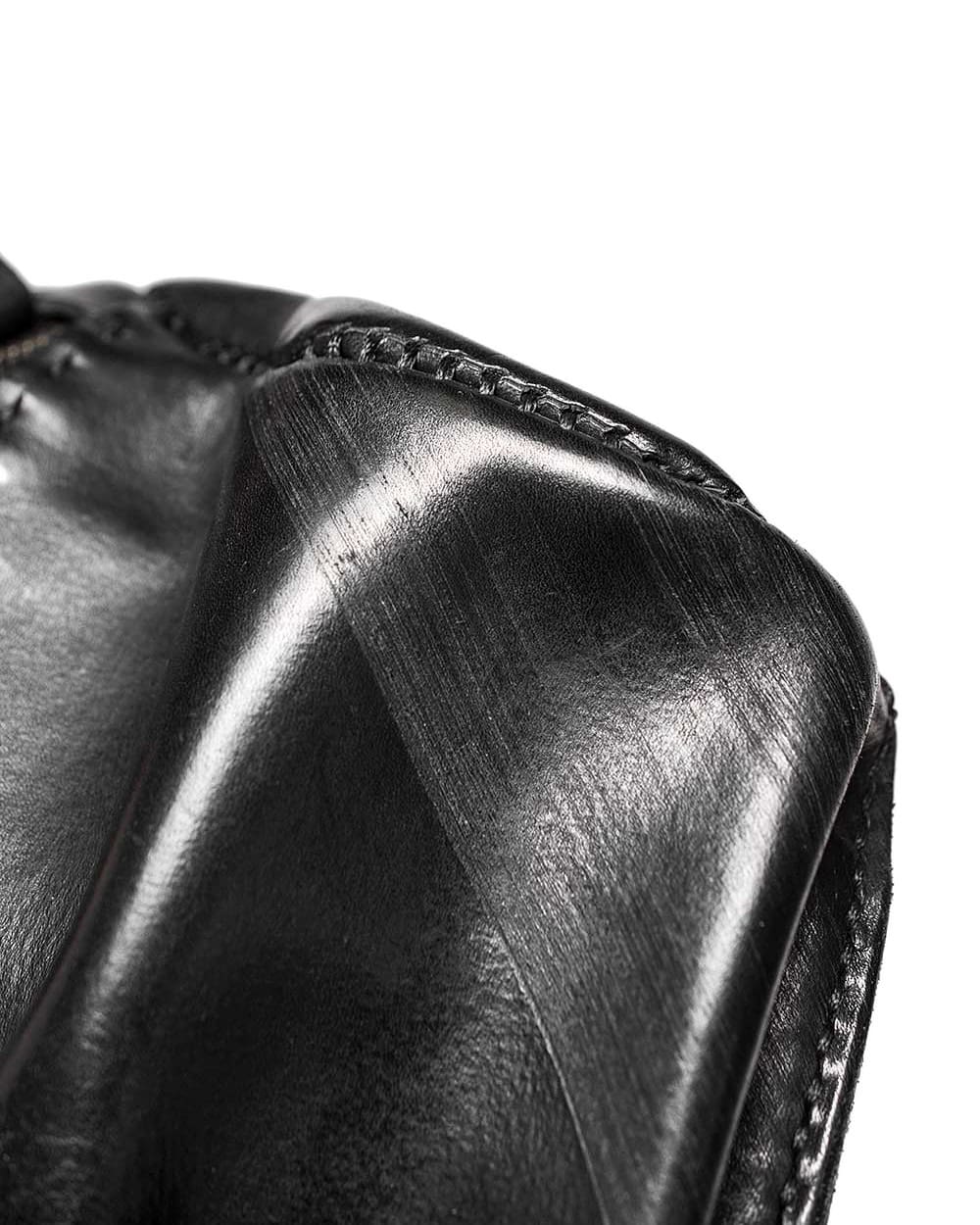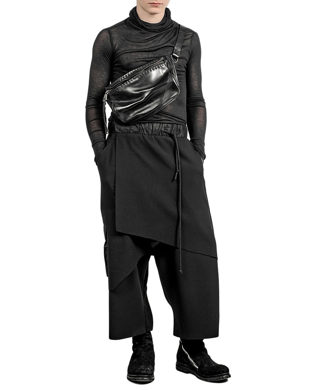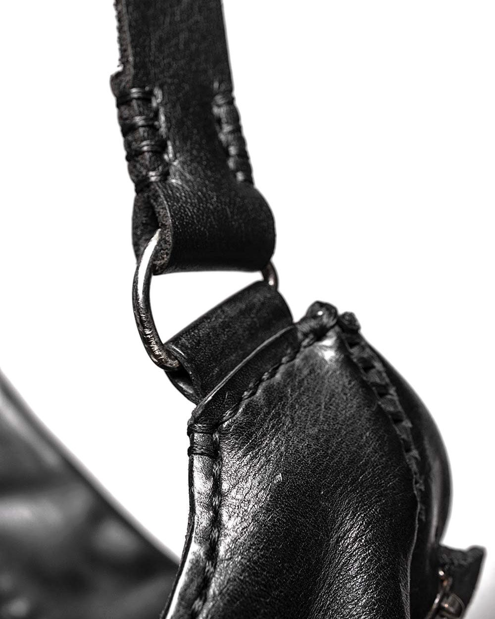 This Body bag is entirely hand sewn from high quality vegetable tanned leather. It has the design and characteristic of a fanny pack bag. The curved and molded shape is further developed with signature linear scar-scratch details and overall textured appearance. The beauty of the textured reversed leather is used in the rear part where a zip pocket is located. The adjustable buckle shoulder strap is crafted from thicker, yet softer leather with deep pores.