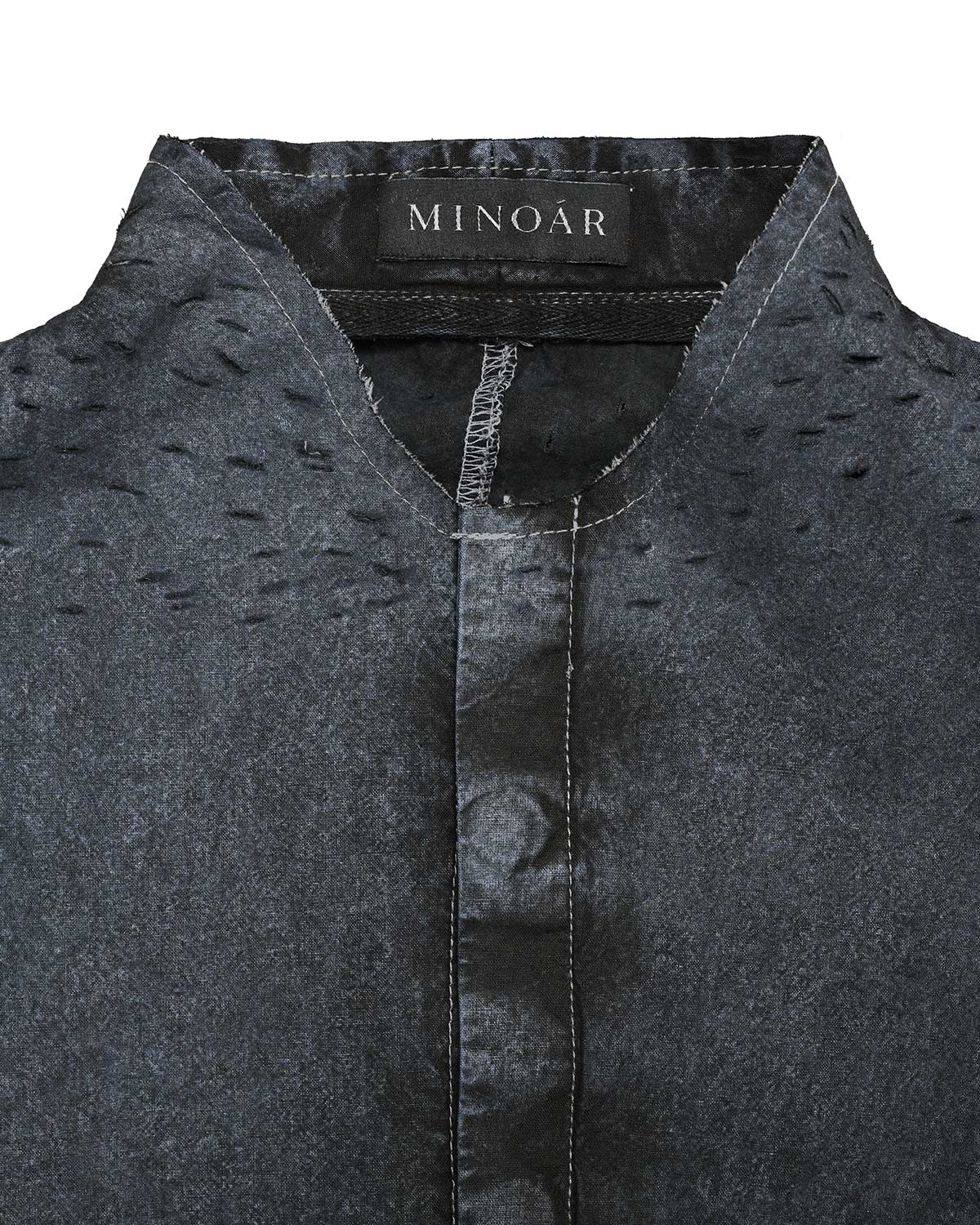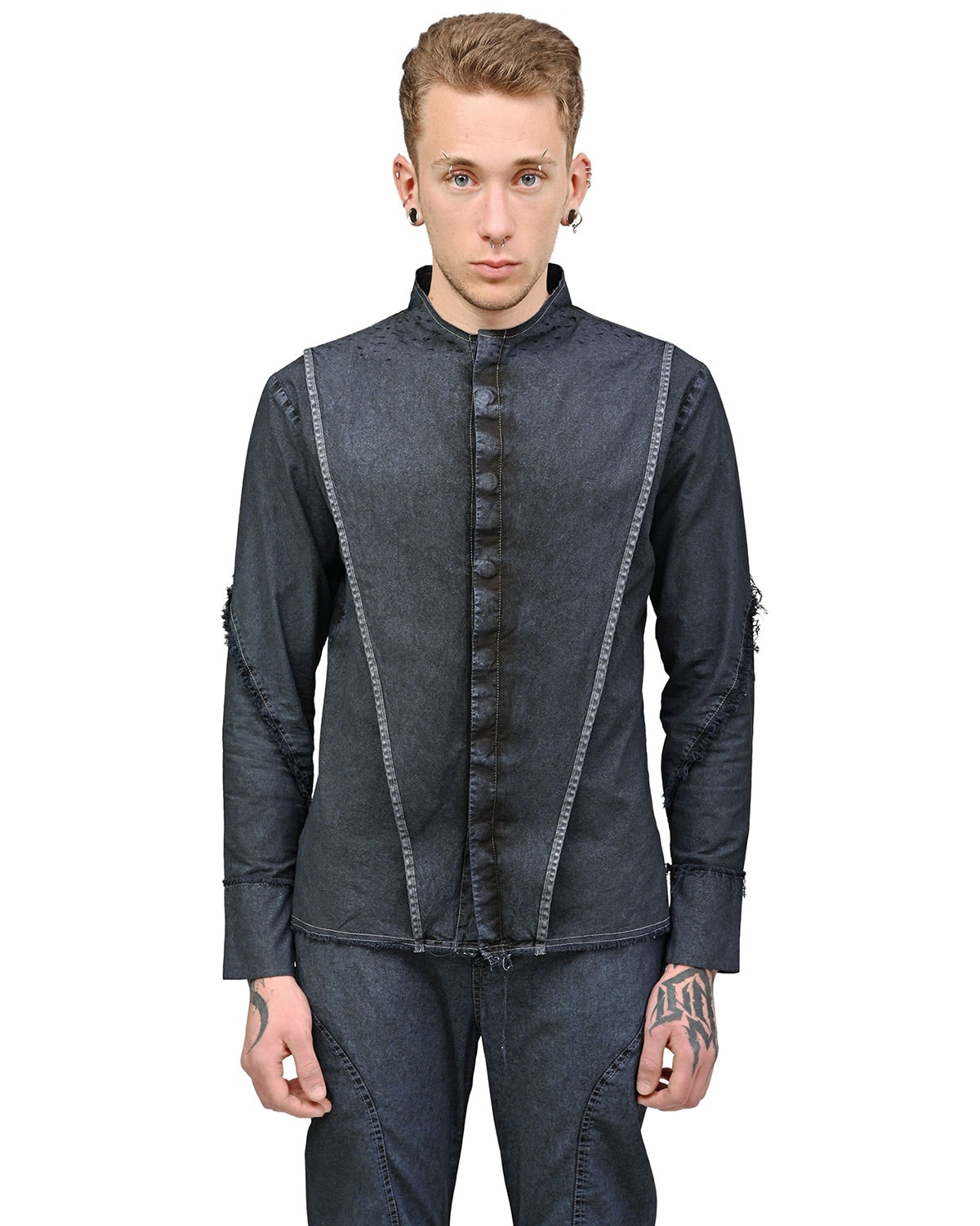 This ‘Insolitum’ standing collar shirt is crafted in soft, 100% cotton fabric in unique, faded black to gunmetal blue rich texture featuring raw edge details and distressed, tear effect at raised collarless neckline.