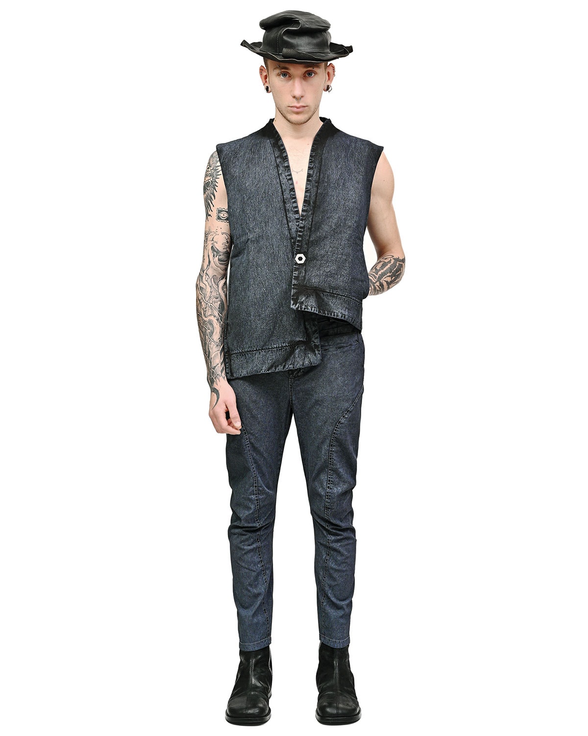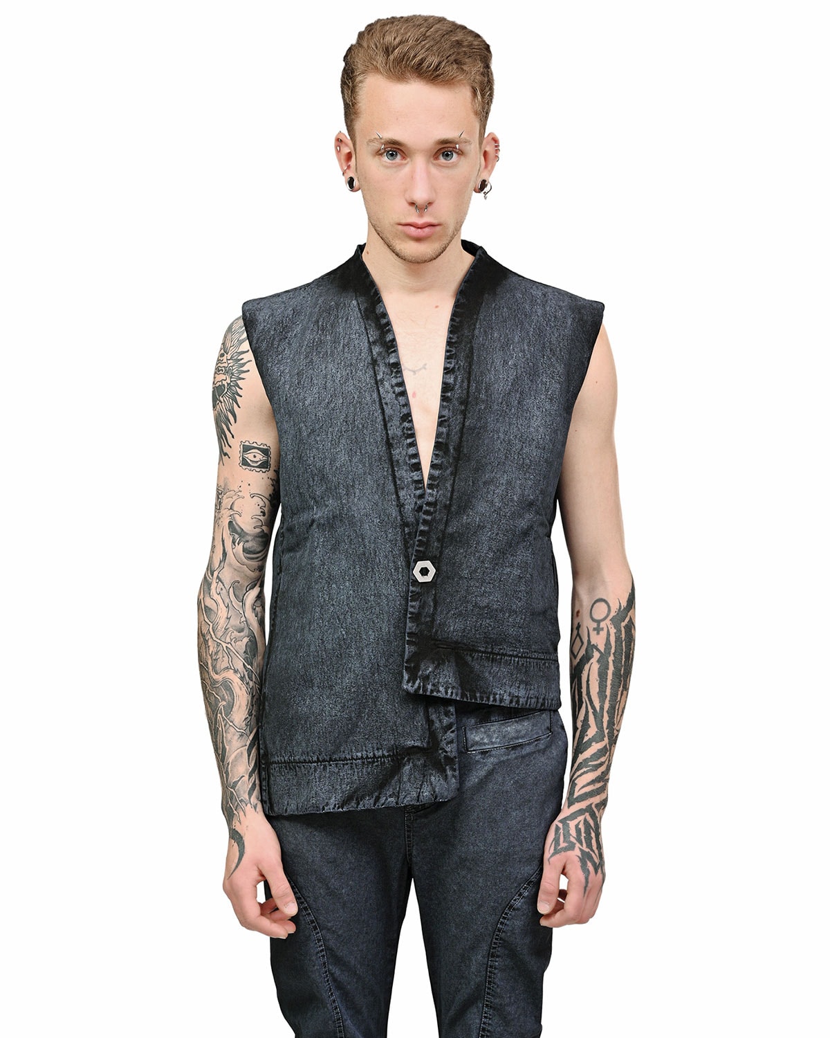This ‘Insolitum’ sleeveless vest is crafted in soft, 100% cotton fabric in unique, faded black to gunmetal blue rich texture featuring raw edge details, distinct asymmetrical silhouette and two side seam pockets, completed by one front signature steel hexagonal button closure.