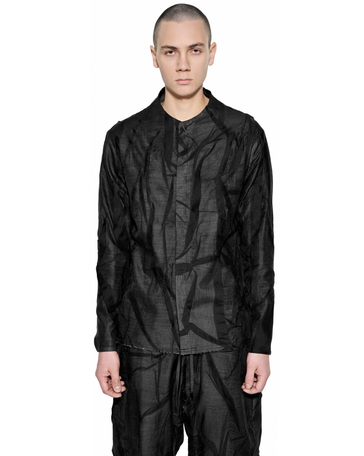 The Diffuse Crushed Shirt embodies a Diffuse nebula, where the signature 'Crushed' technique creates a scattered, textural depth across its dual semi-sheer layers. The interplay of black over white generates a profound sense of shadow and form without sharp boundaries, finished with raw edges for an unrefined aesthetic.