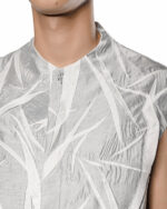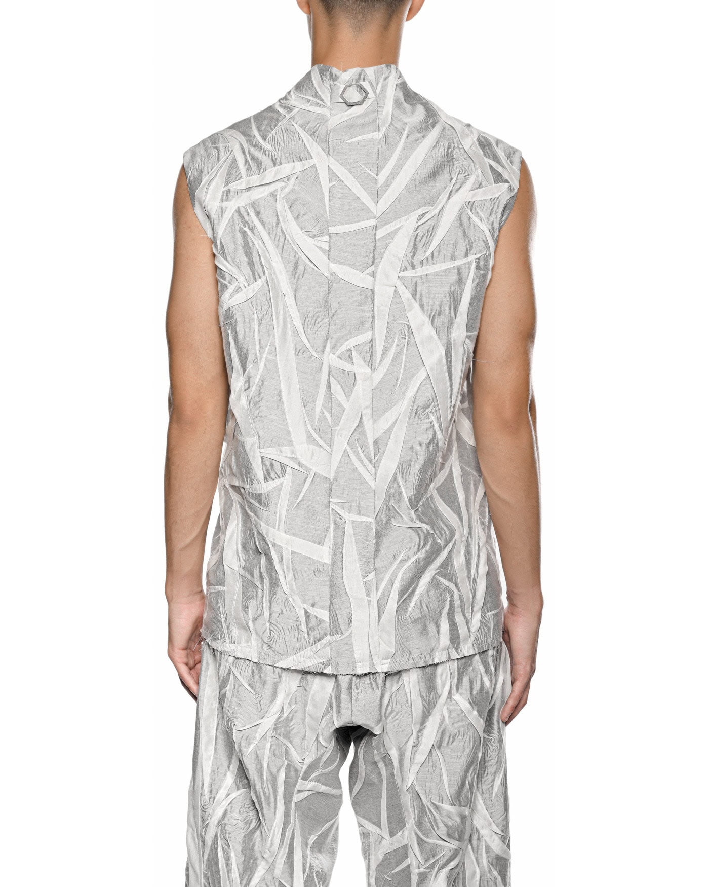 This sleeveless shirt articulates the concept of a Diffuse nebula, where the signature ‘Crushed’ technique creates a scattered, ethereal texture across its dual semi-sheer layers. The interplay of white over black generates a nuanced visual depth, giving the relaxed silhouette a sense of form without sharp boundaries.