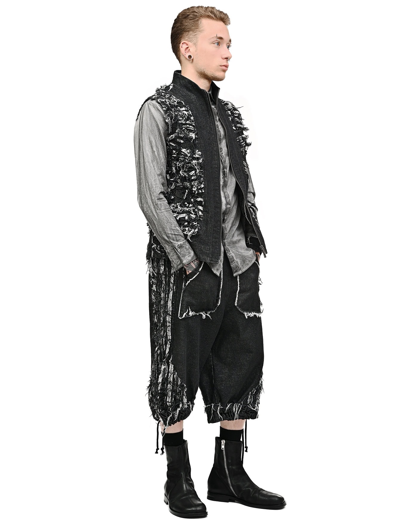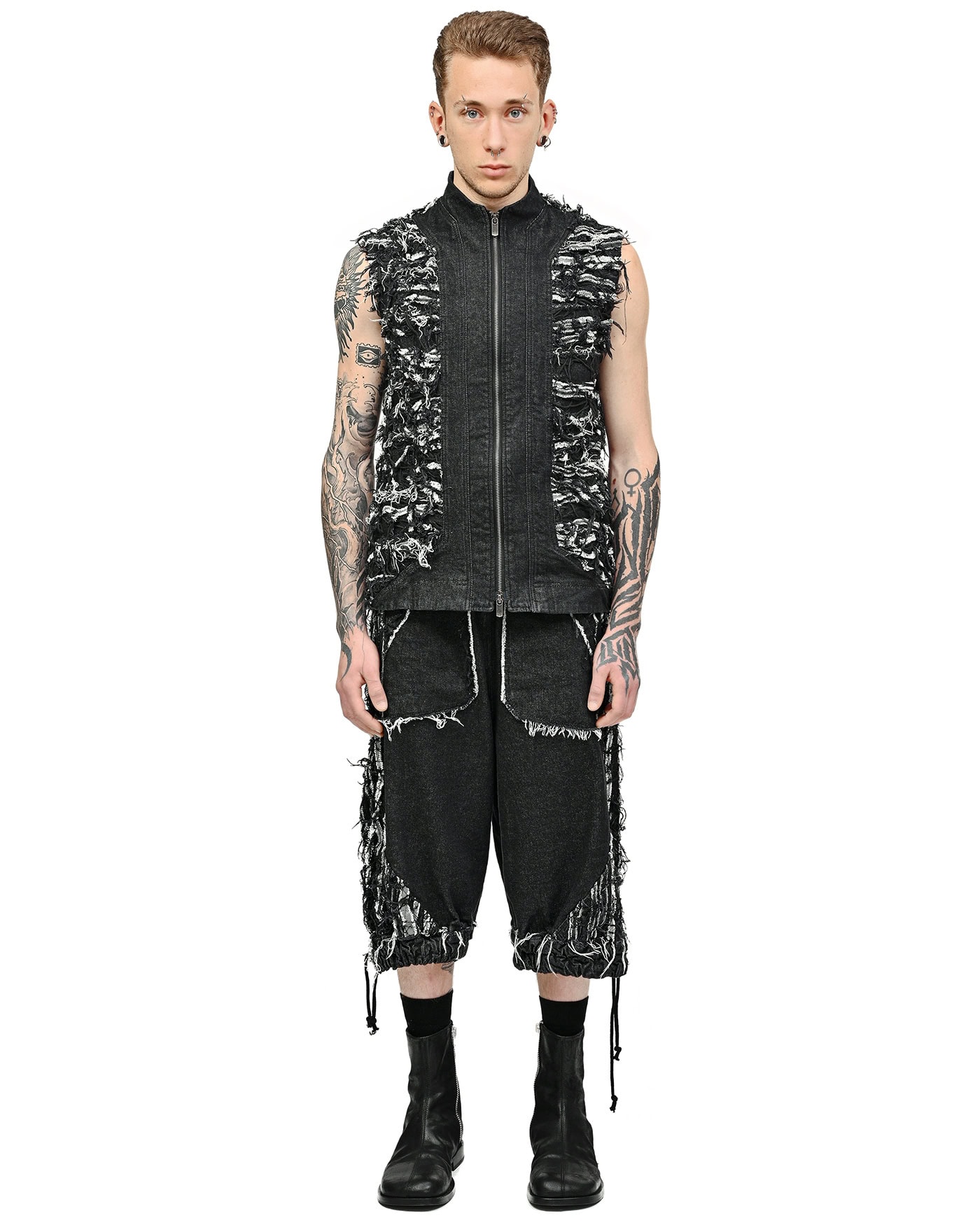 This ‘Insolitum’ Linear Cut Vest is crafted in soft denim in black to grey shade. Offering complex texture through signature Fiber Bond fibers & denim yarn unveiling rich texture in one symmetrical pattern cut. Focusing on comfort and practicality, this vest offers two side seam front pockets, raised neckline and a 2-way YKK central zip. Pair it with the Distressed Linear Cut Crop Shorts for a complete silhouette.