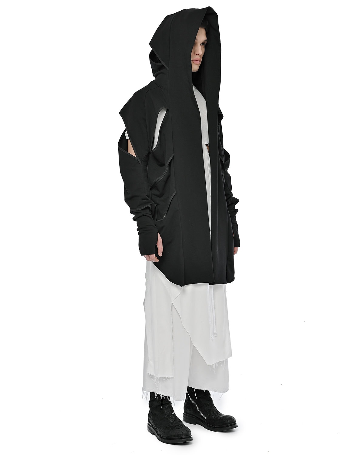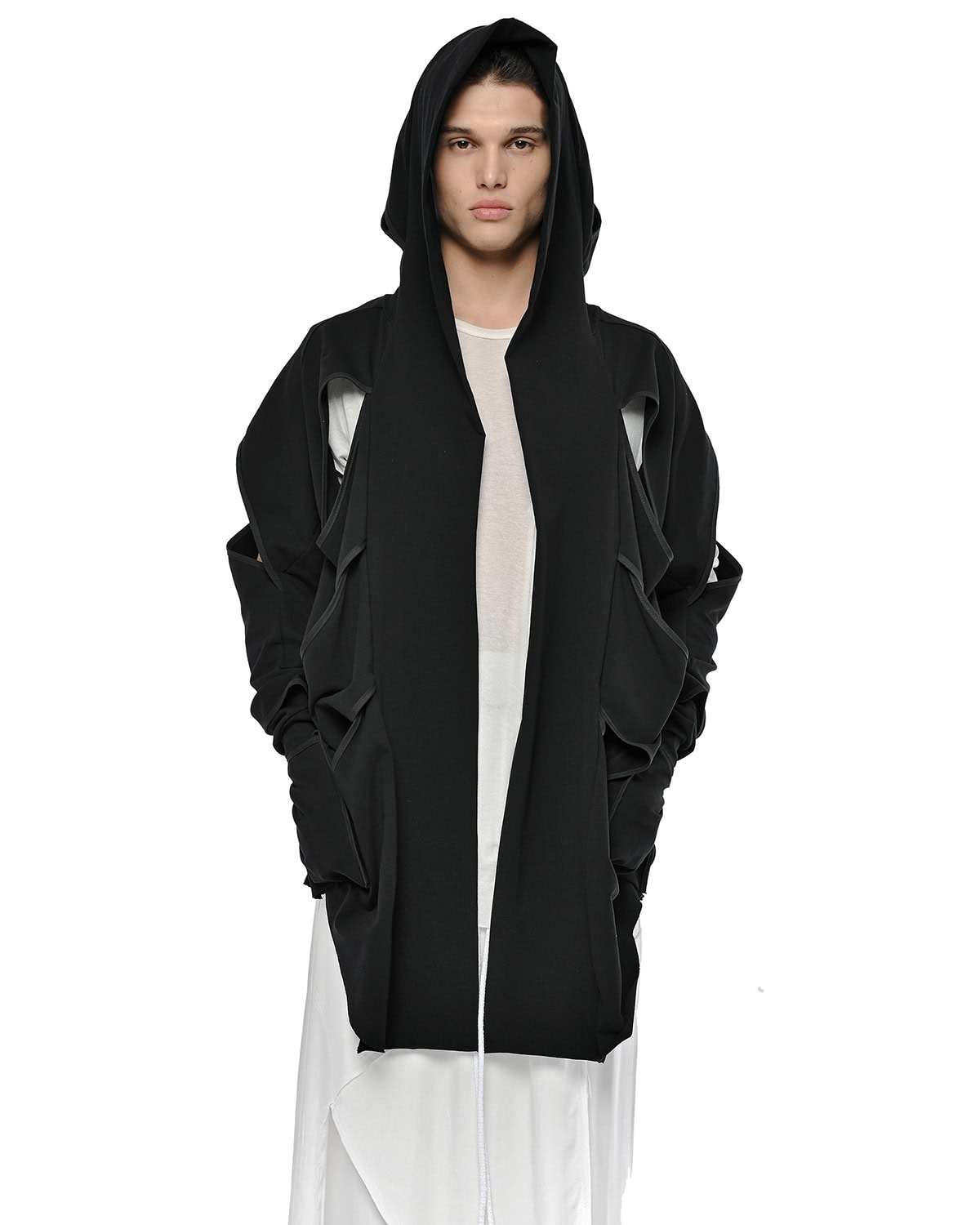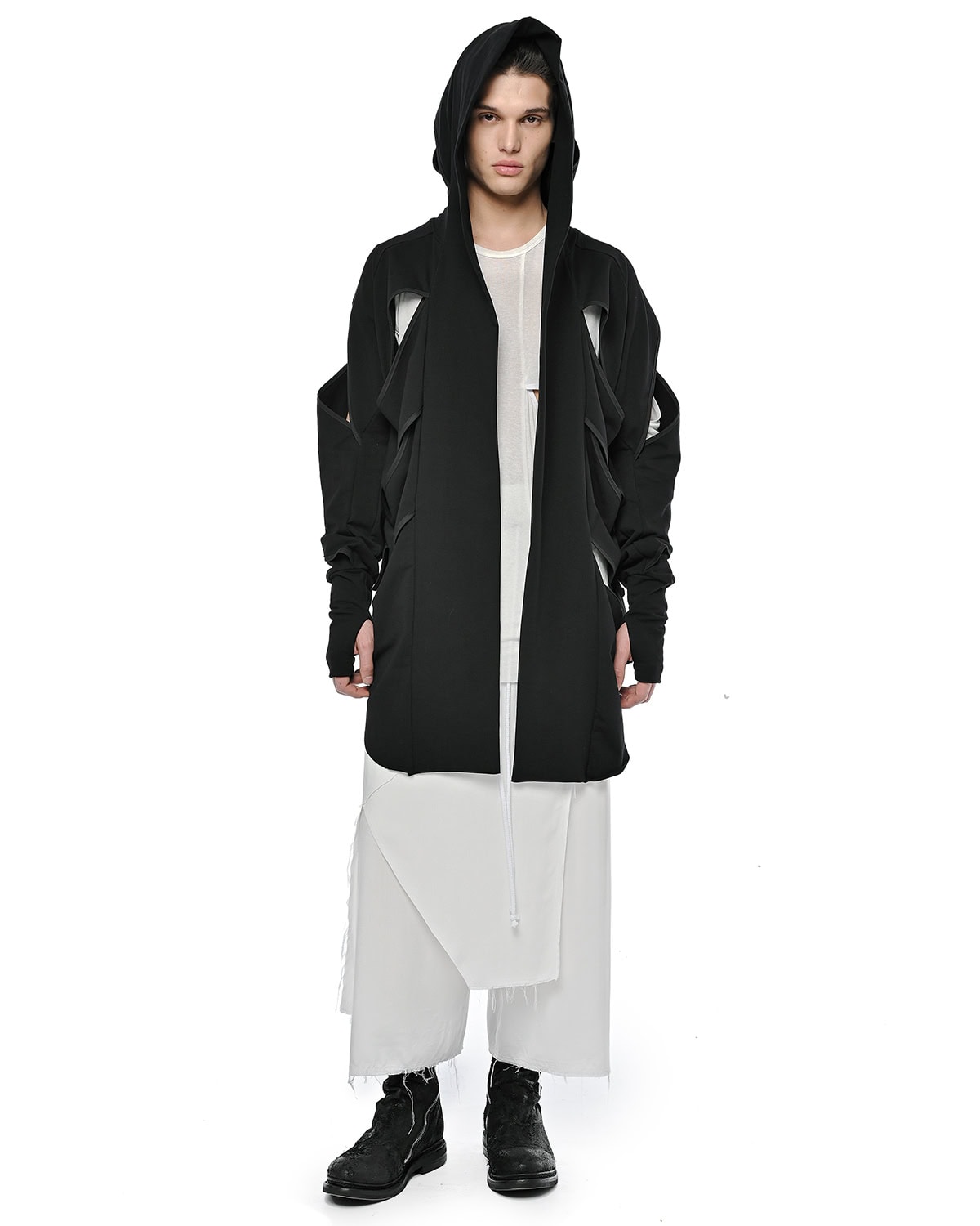 Distinguished by its slit bias binding openings throughout, the External Division Cardigan offers a relaxed, elongated silhouette with a notably soft feel. It features a constructive enlarged hood, an open front design, and practical thumb openings at the cuffs, with an internal signature hexagon steel buckle strap providing a discreet functional detail.