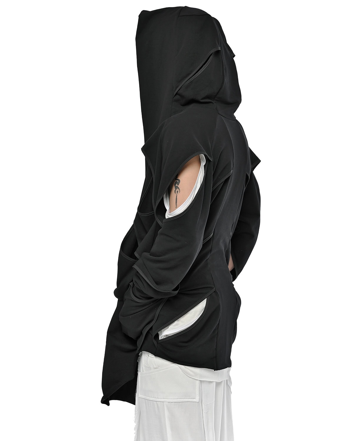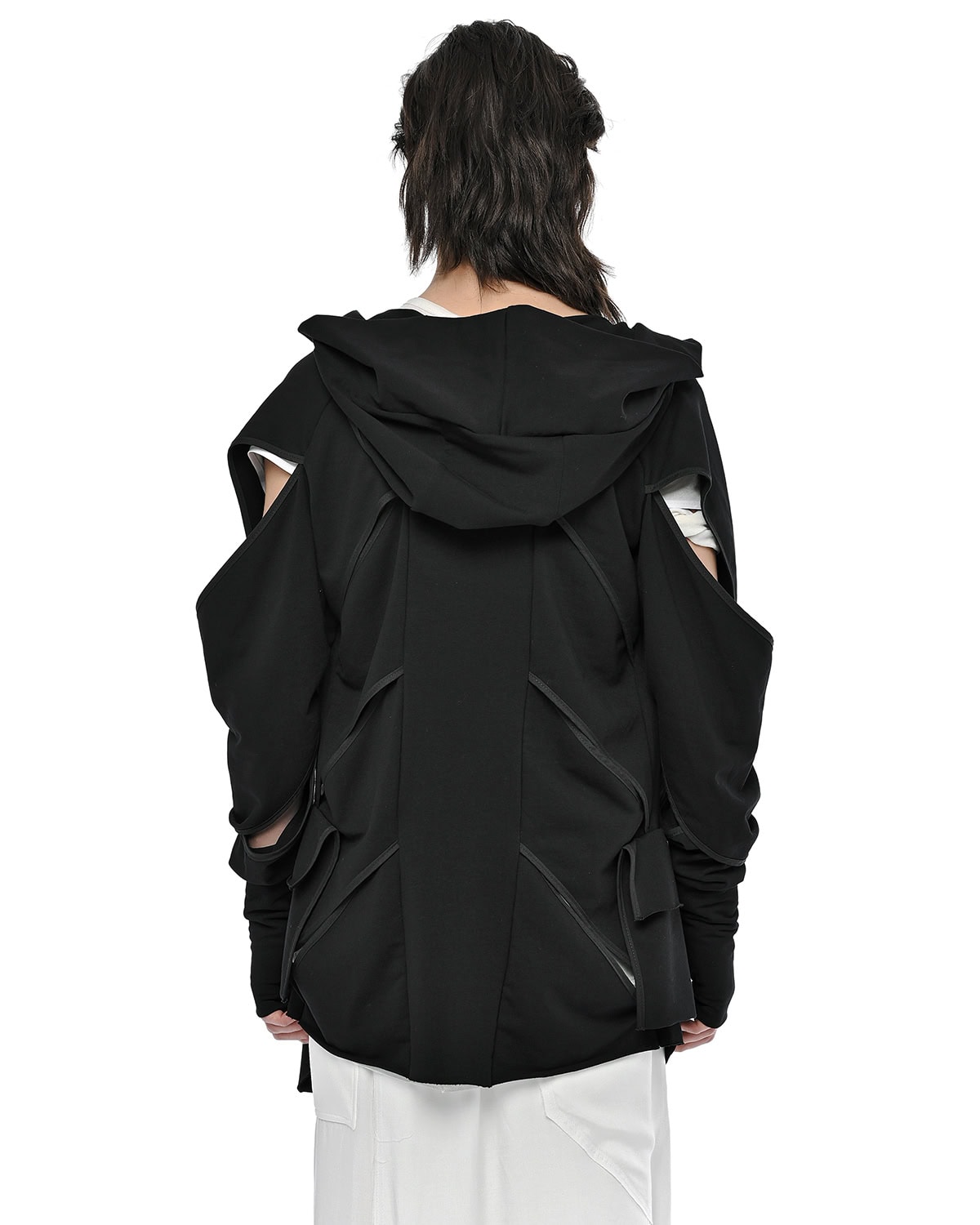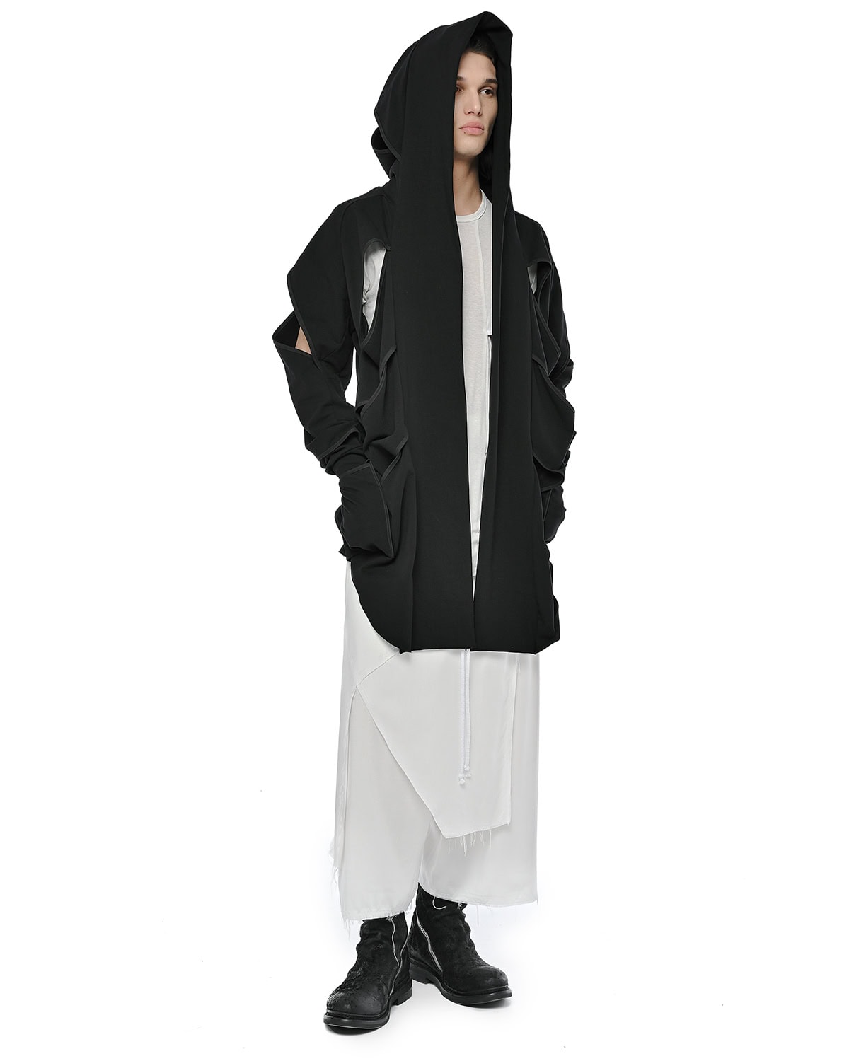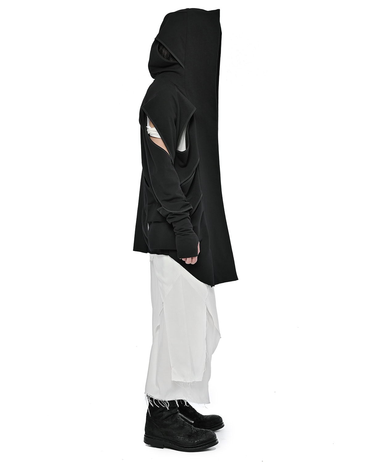 Distinguished by its slit bias binding openings throughout, the External Division Cardigan offers a relaxed, elongated silhouette with a notably soft feel. It features a constructive enlarged hood, an open front design, and practical thumb openings at the cuffs, with an internal signature hexagon steel buckle strap providing a discreet functional detail.