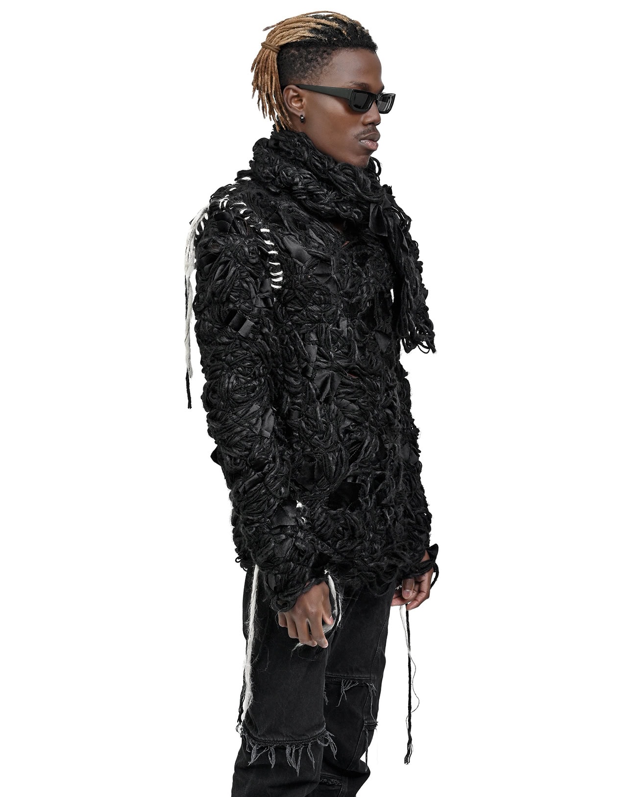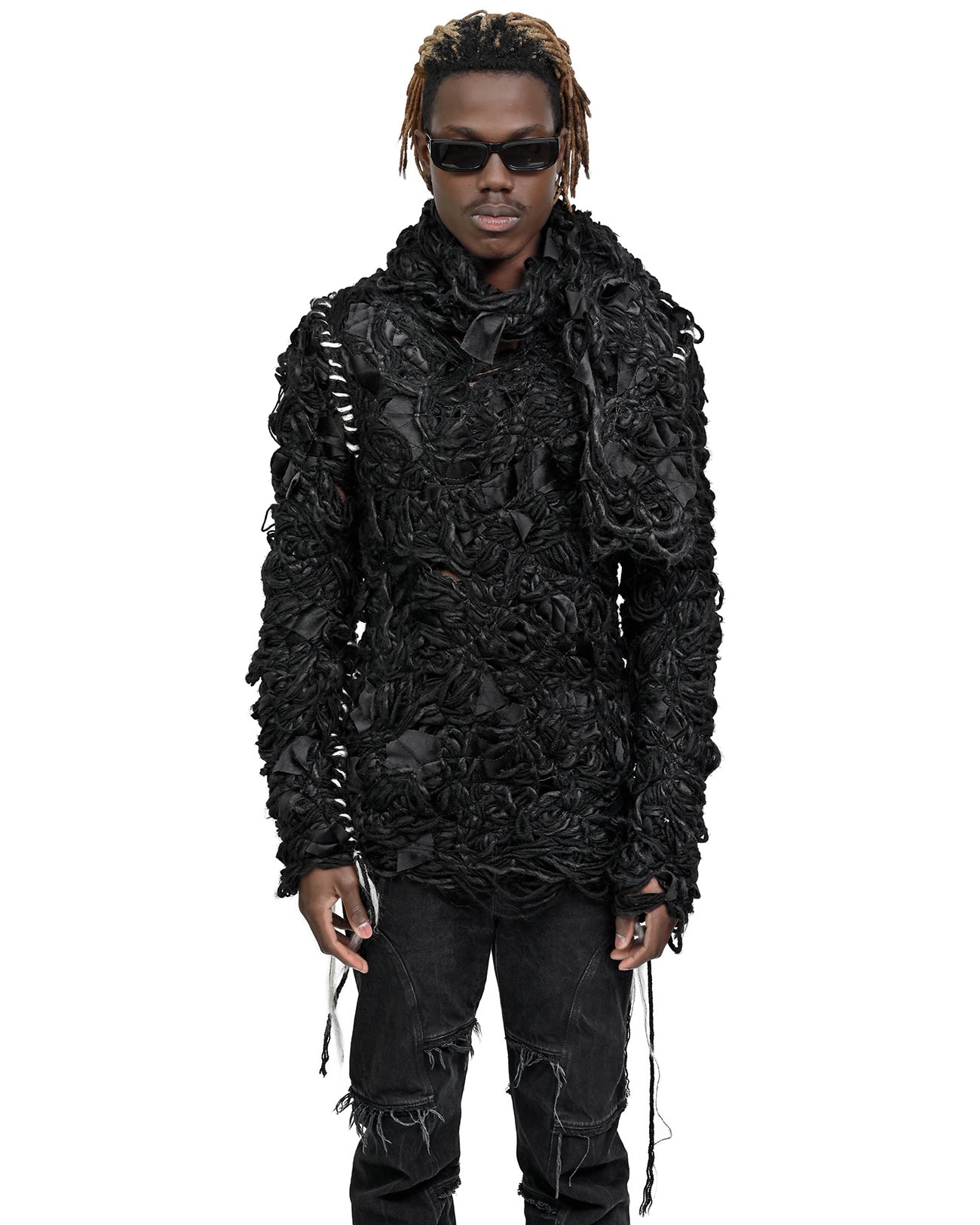 – Hand stitched ‘scar’ seams in light grey wool yarns