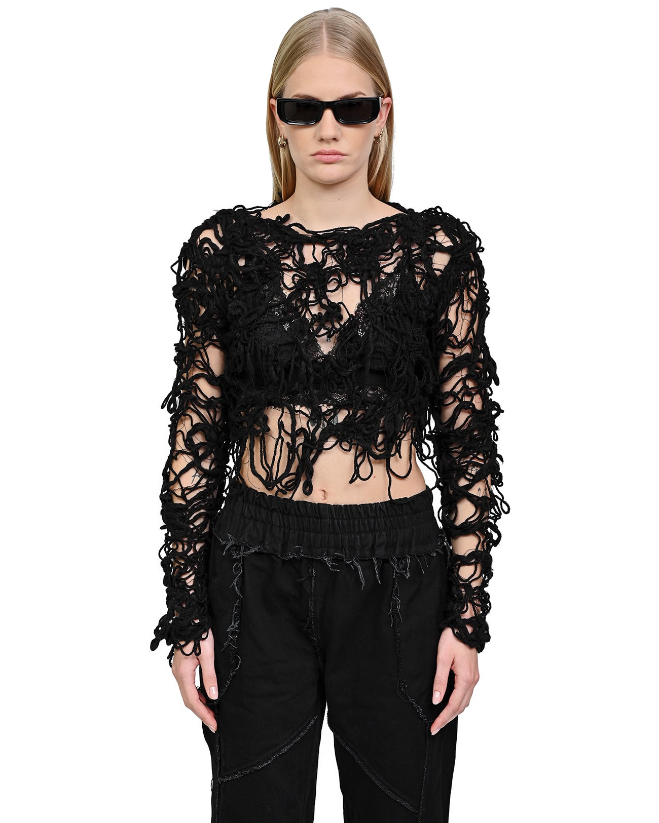 The Fiber Bond Relativ Crop Sweater features a slim, cropped silhouette in black, showcasing the signature ‘Fiber Bond’ artisan technique. Characterized by a relative yarn composition and see-through segments, this design offers a soft and lightweight feel.