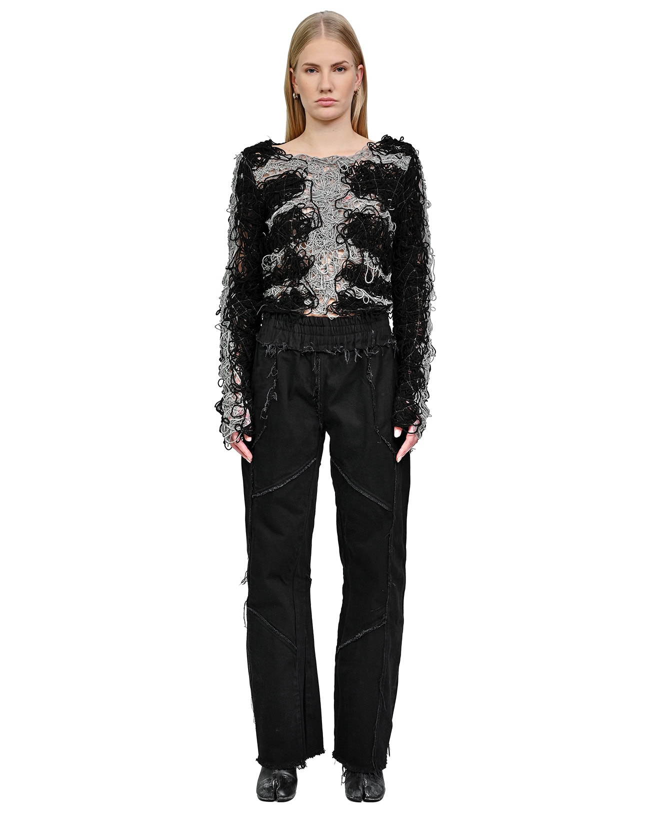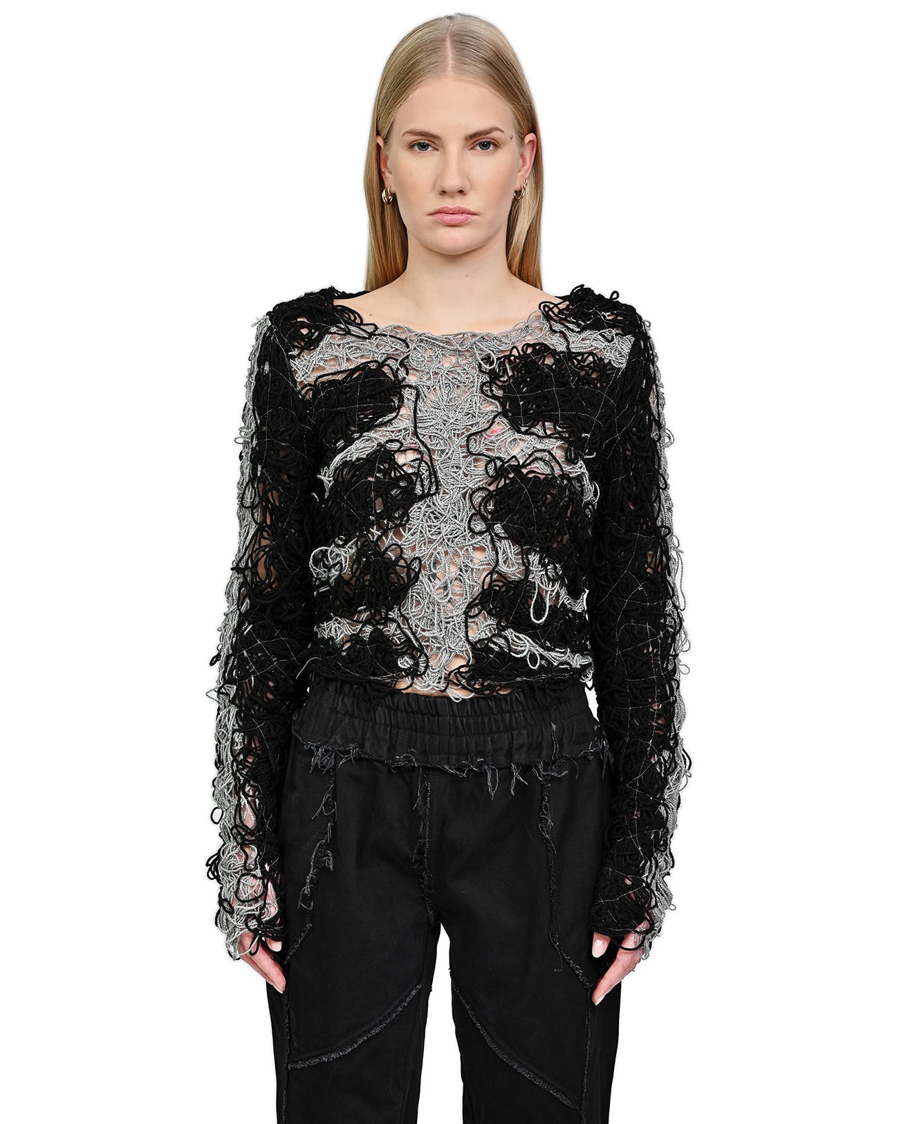 Characterized by primordial design related to ancient traces and boasting Minoar’s signature Fiber Bond technique. The ‘Insolitum’ Symbol Sweater reminisces of unknown signs, through a contrast yarn design. Soft and light, neither knitted nor unknitted – this pullover carries a distinct silhouette with see-through.