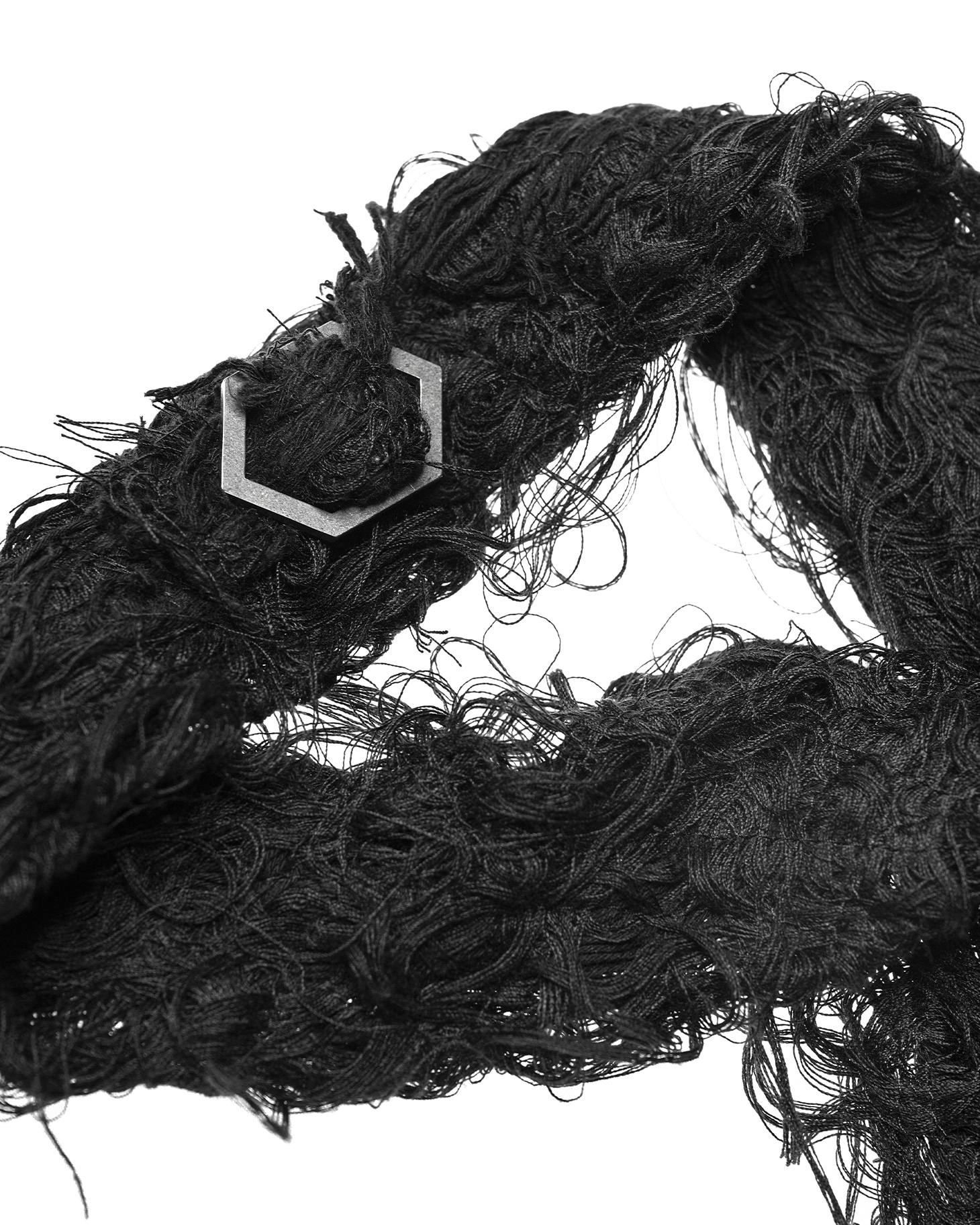 Entirely handcrafted, the Filamentous Dark Ascot Tie is a direct expression of the signature ‘Fiber Bond’ artisan technique, constructing its distinctive structure from a complex cobweb-like bonding of black yarns.