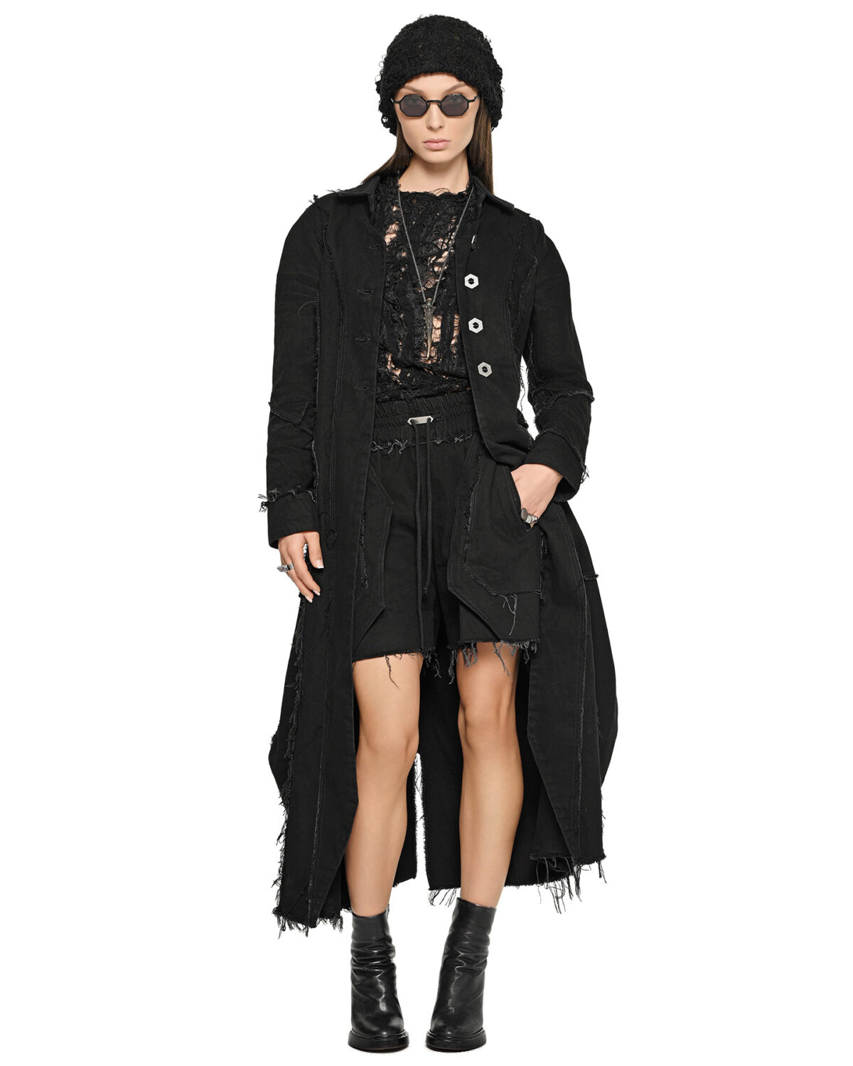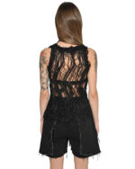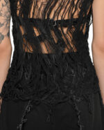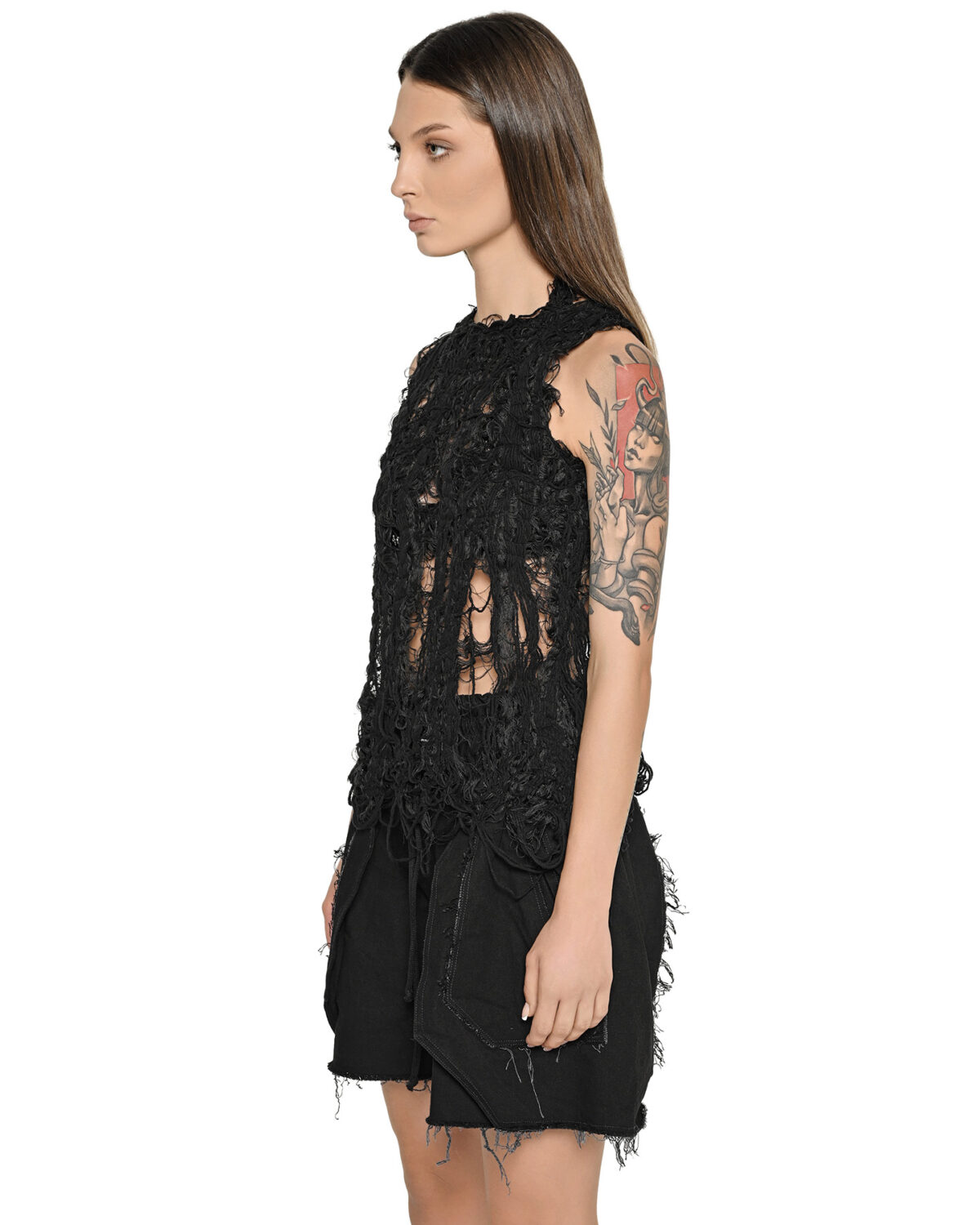 The sleeveless design features a clean round neckline, with raw frayed edges forming a deconstructed finish.