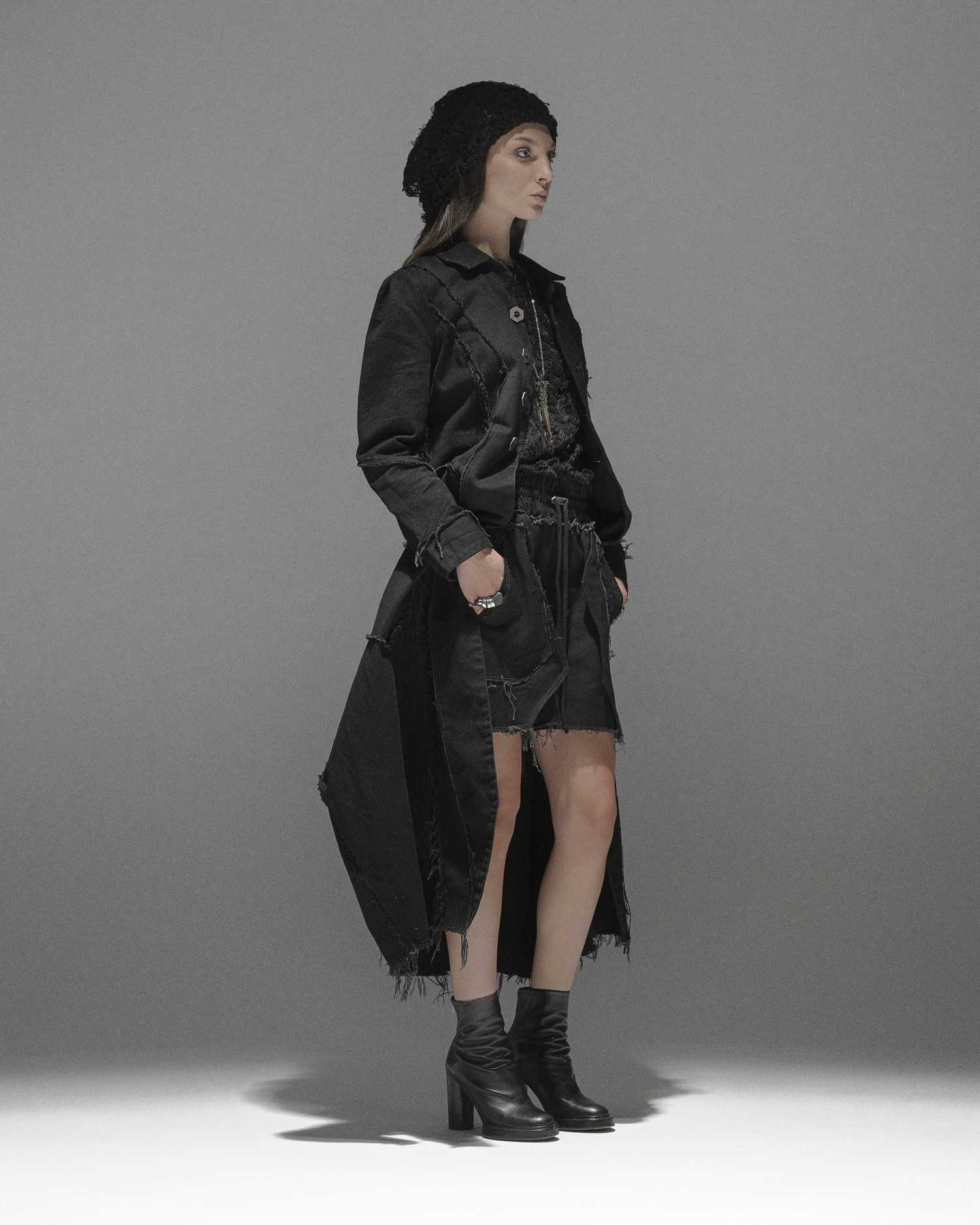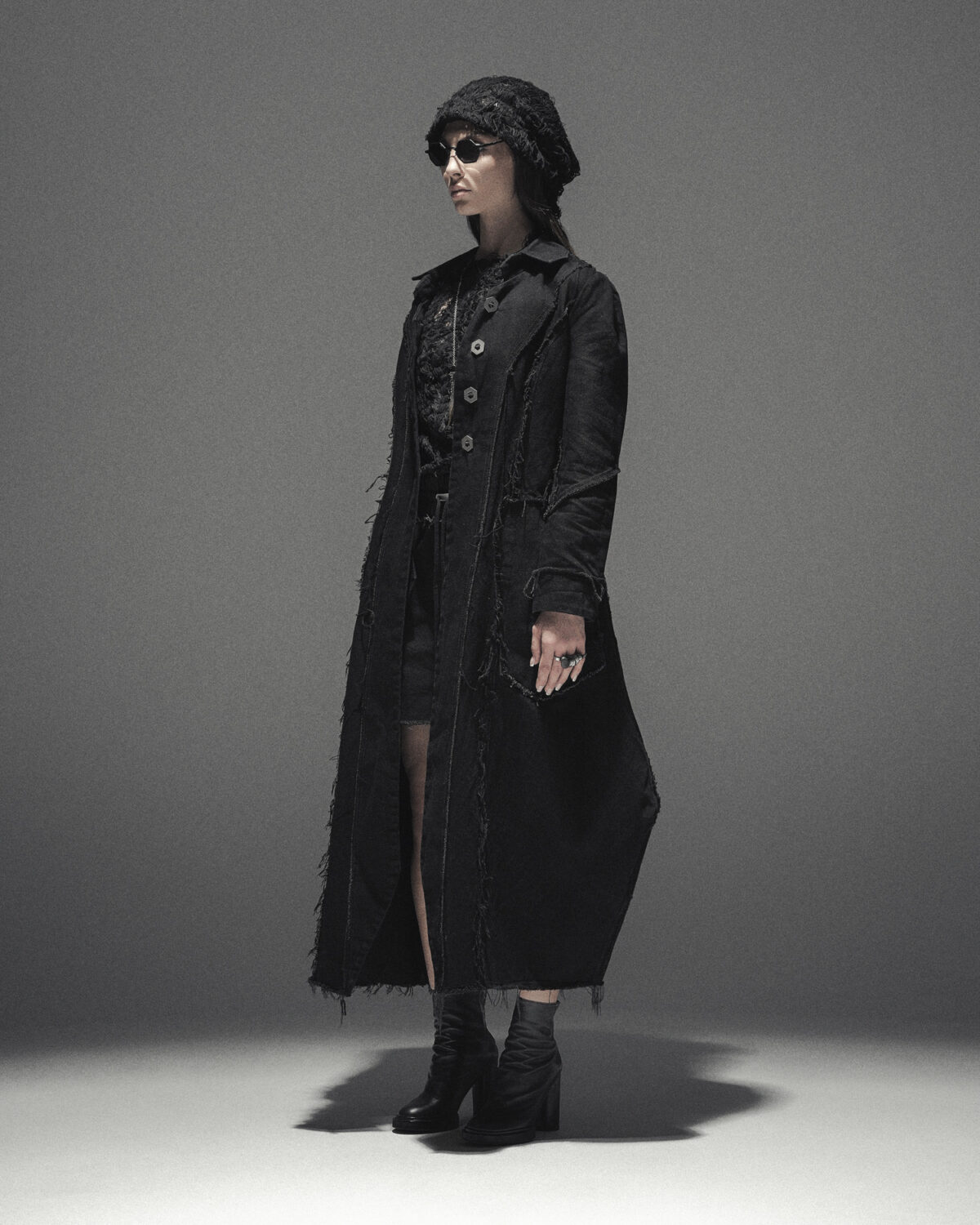 Das ärmellose Design zeichnet sich durch einen cleanen Rundhalsausschnitt aus, wobei rohe, ausgefranste Kanten ein dekonstruiertes Finish bilden.