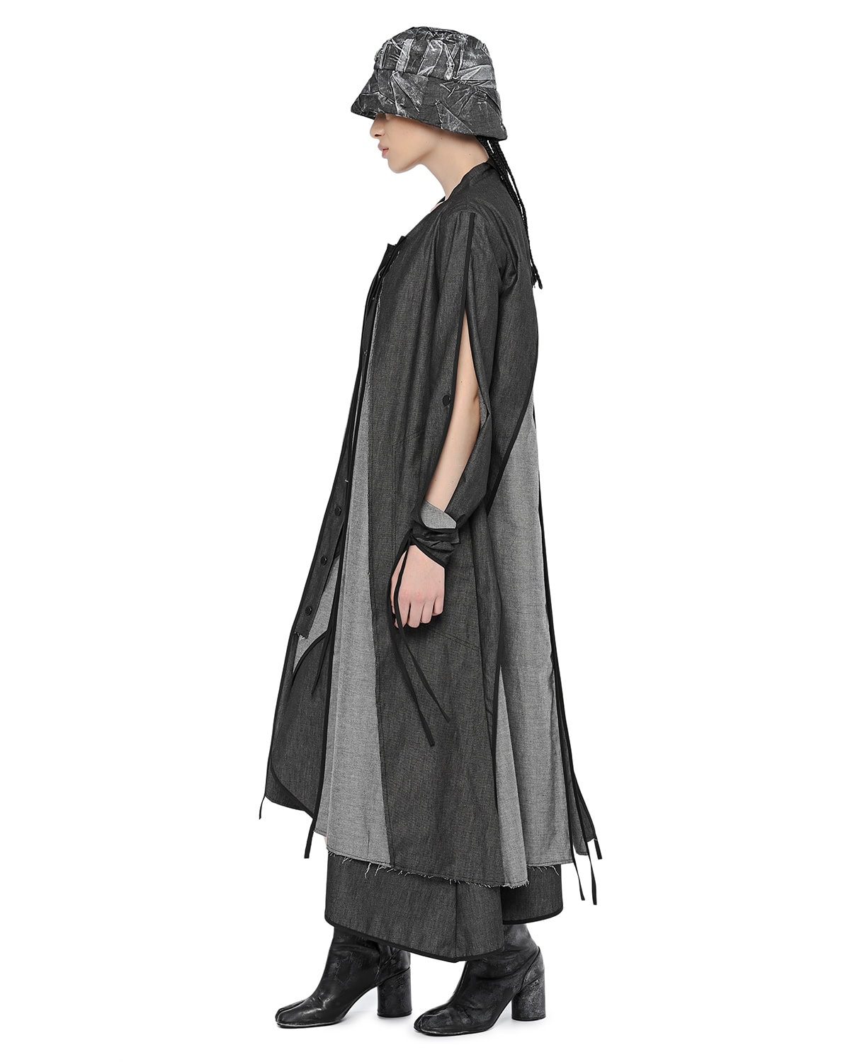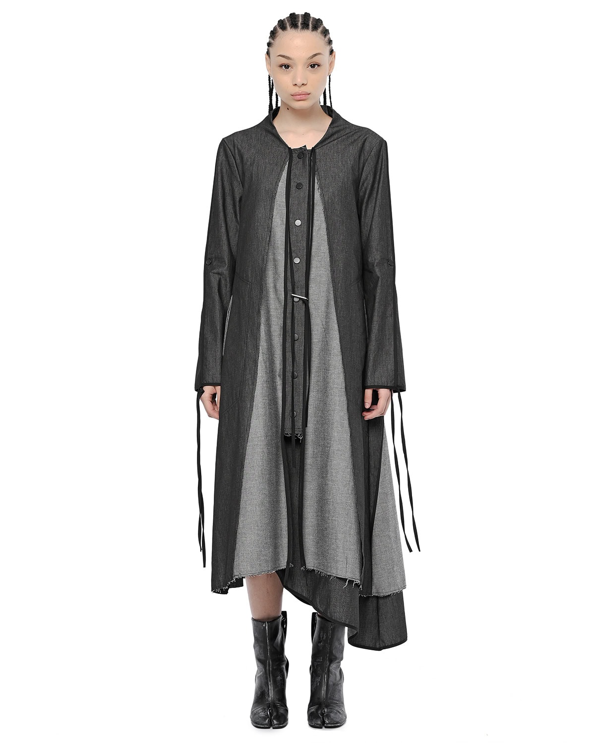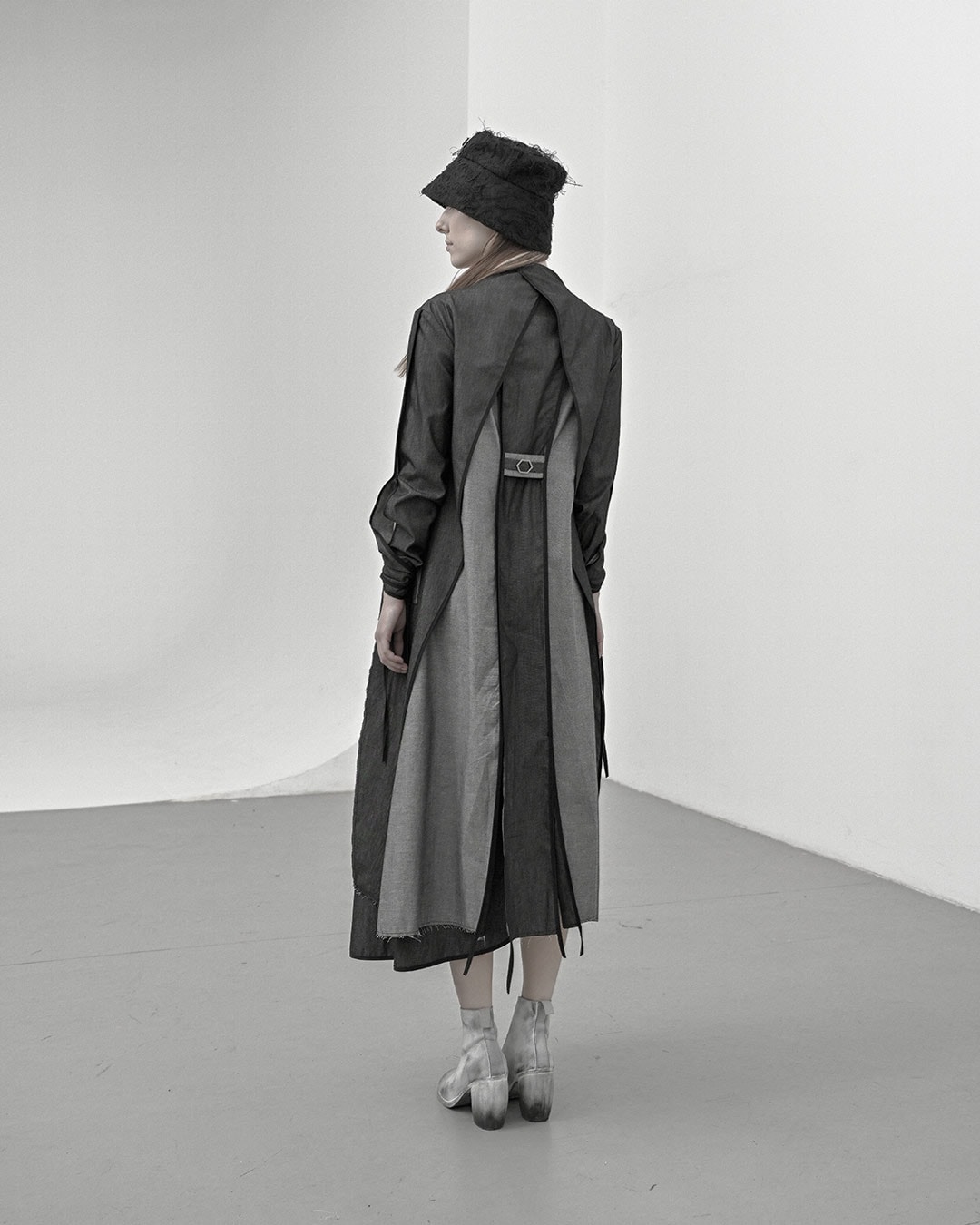 – Front signature ‘Trigon’ descending layers with raw edge finish