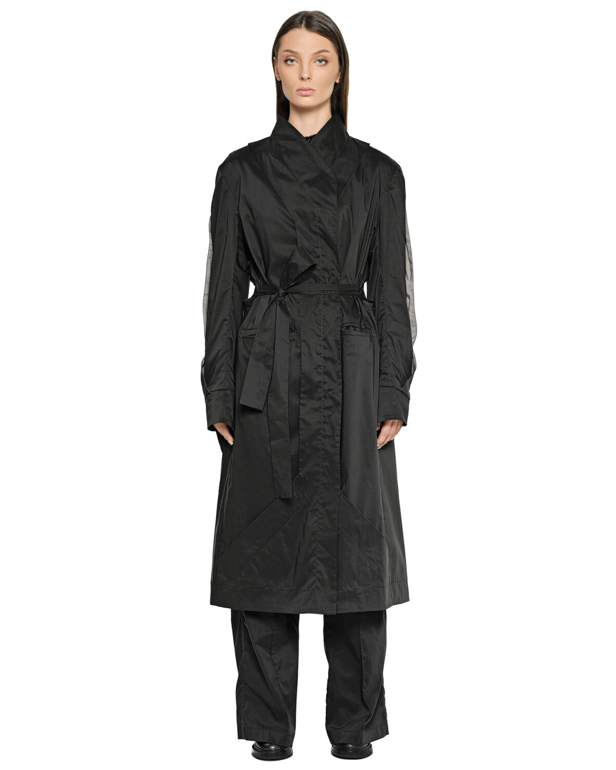 Despite its elongated, architectural silhouette, the garment is crafted from an exceptionally lightweight fabric, creating a compelling dialogue between visual structure and seasonal comfort.