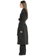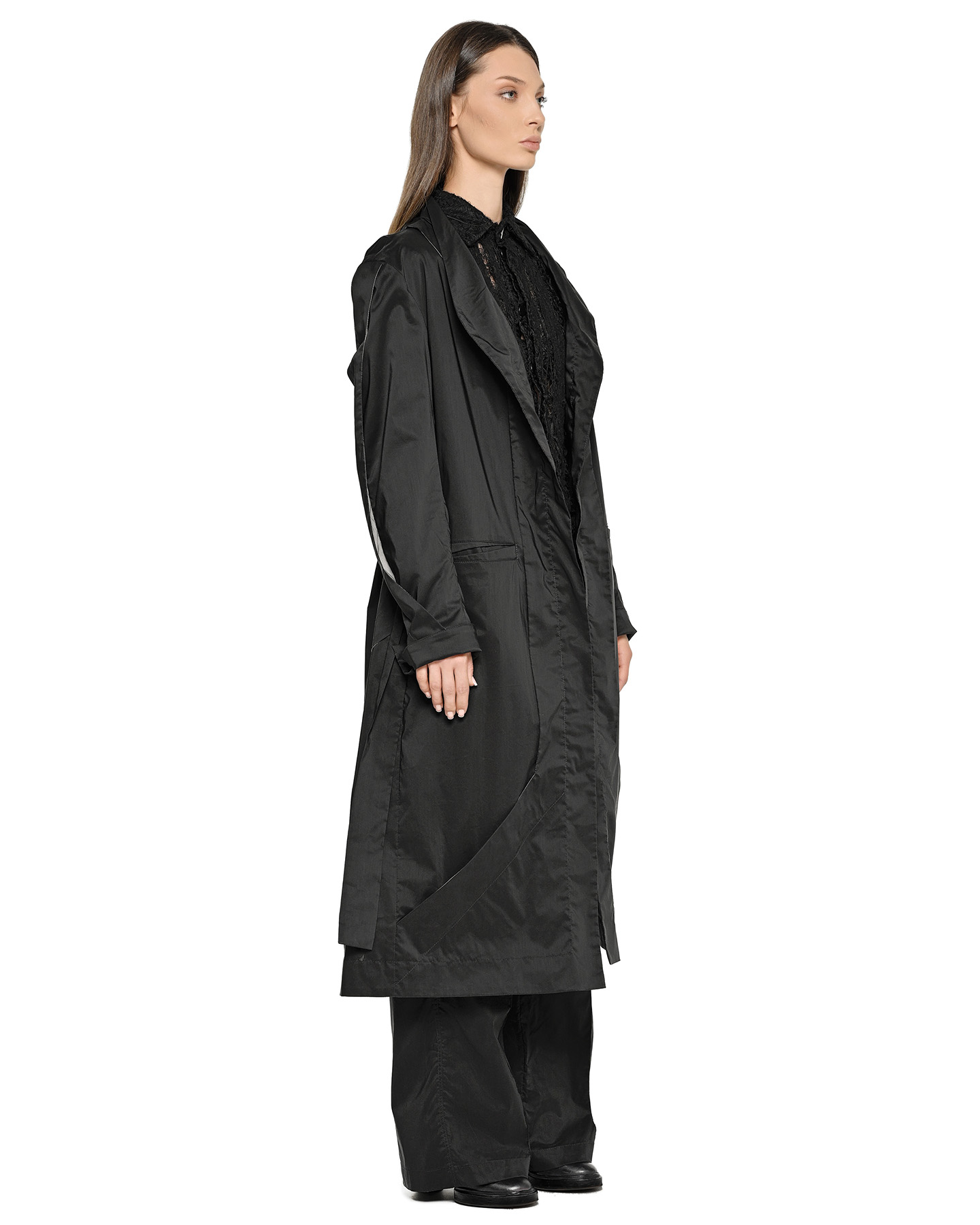 Despite its elongated, architectural silhouette, the garment is crafted from an exceptionally lightweight fabric, creating a compelling dialogue between visual structure and seasonal comfort.