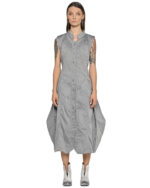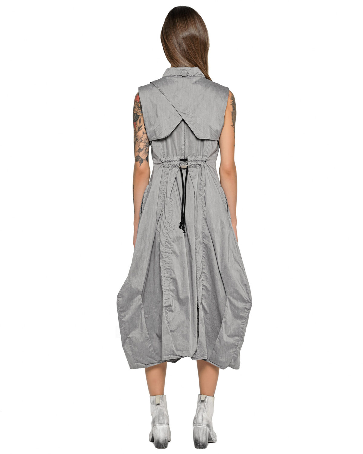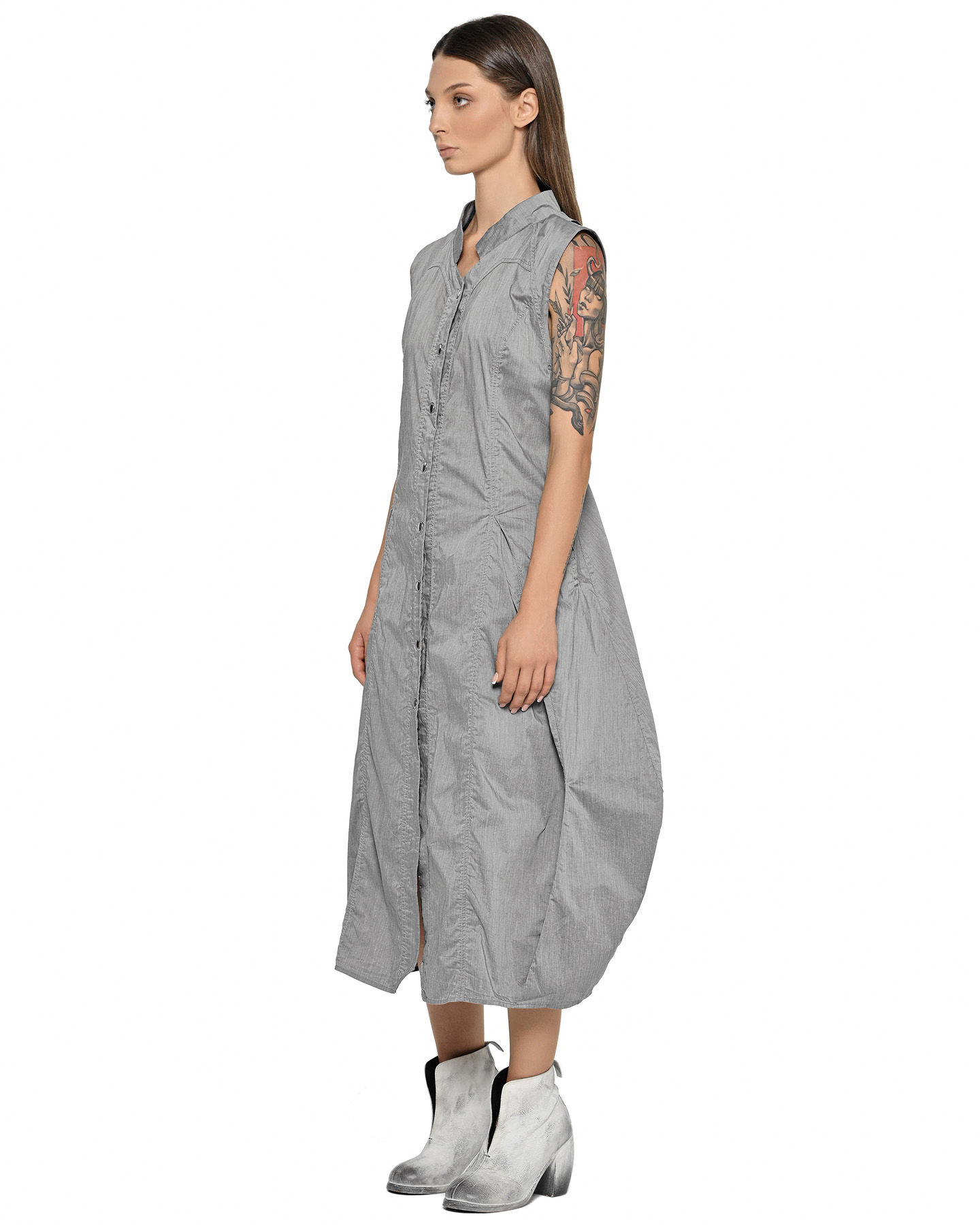 Engineered from lightweight muted grey satin, the Gravity Inox Sleeveless Shirt Dress features a multi-segment construction shaping a relaxed silhouette with a distinct hexagonal flare.