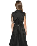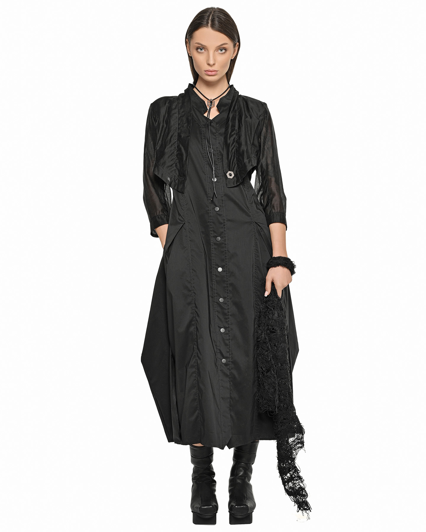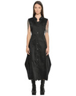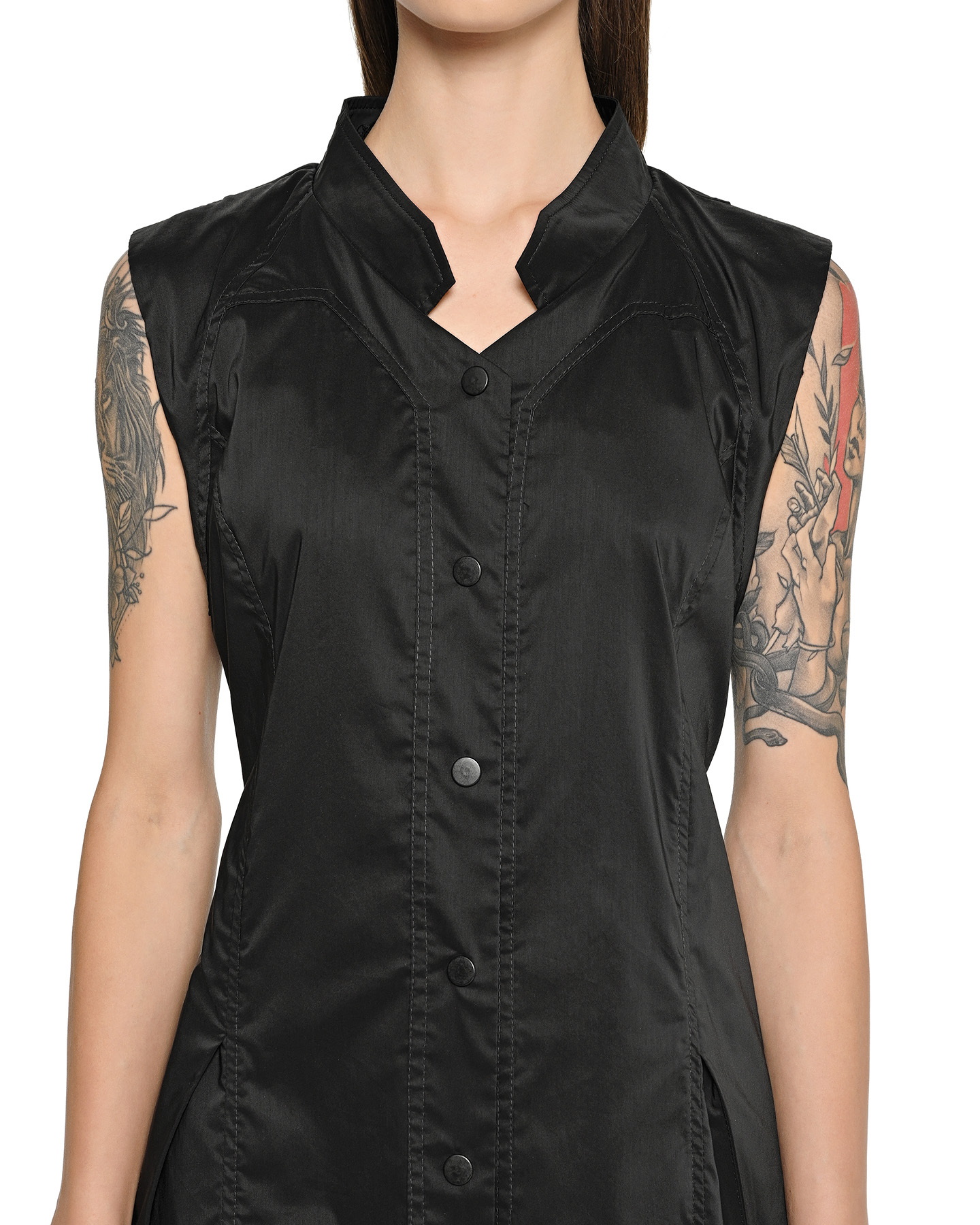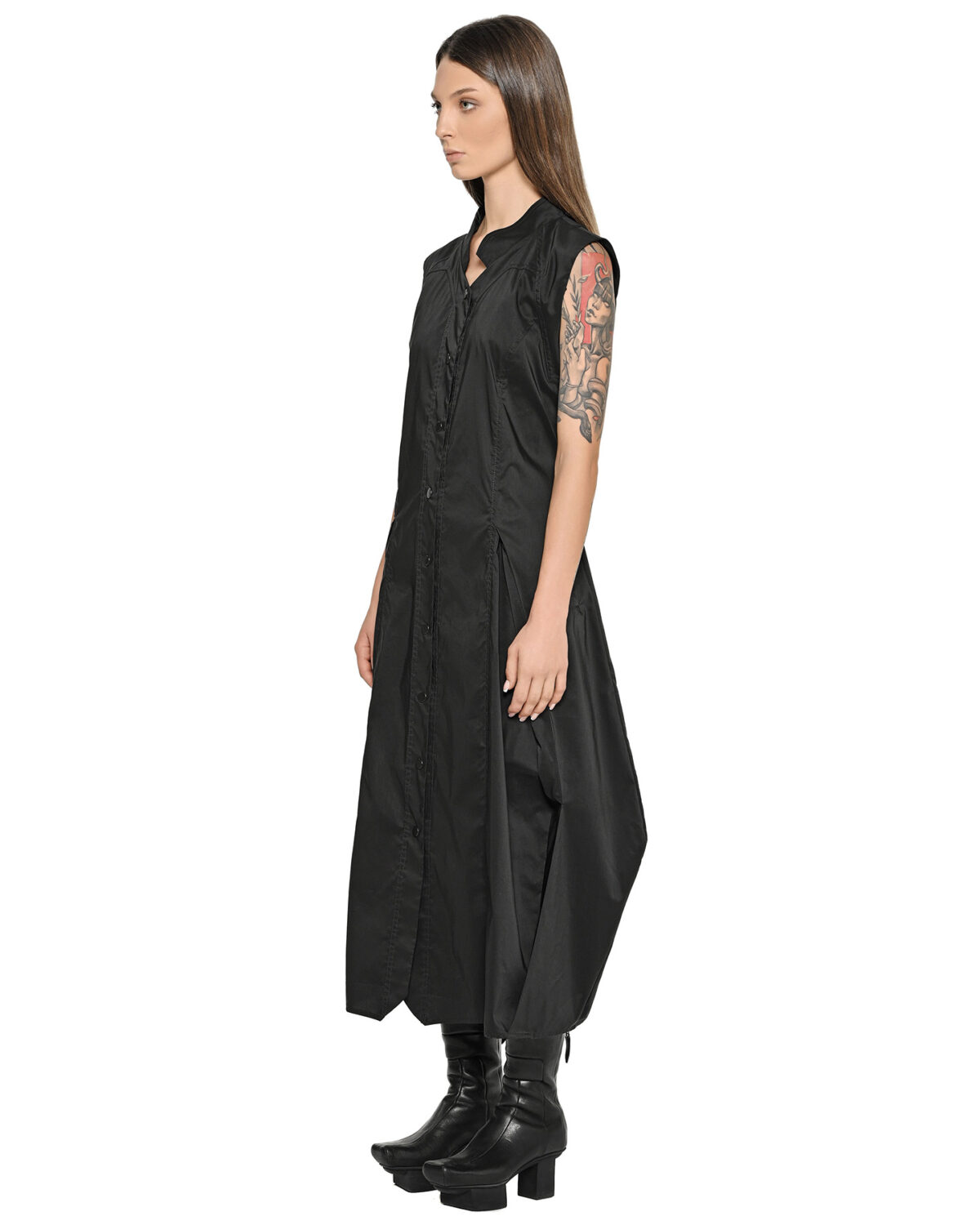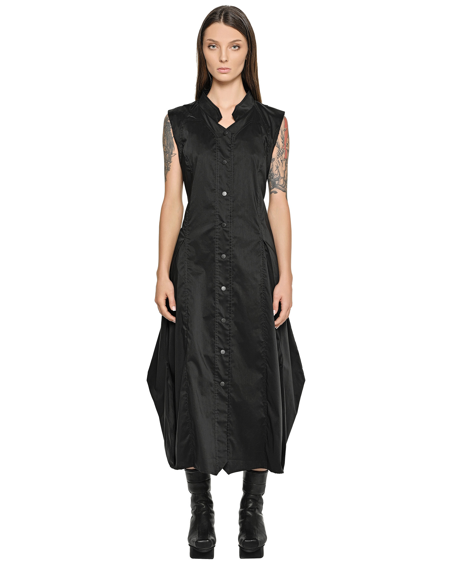 Engineered from lightweight black satin, the Gravity Sleeveless Shirt Dress features a multi-segment construction shaping a relaxed silhouette with a distinct hexagonal flare.
