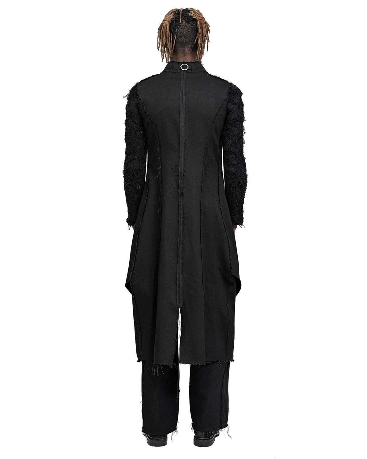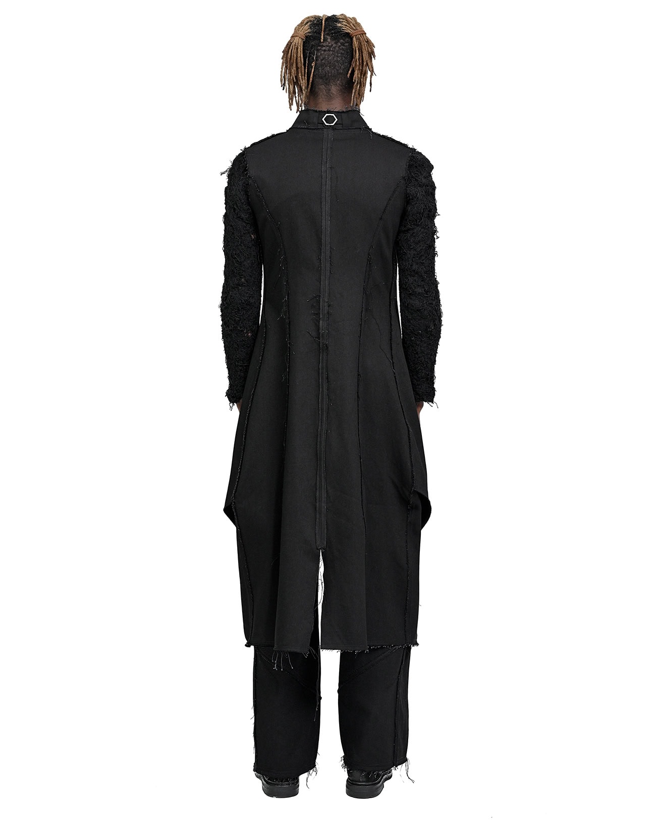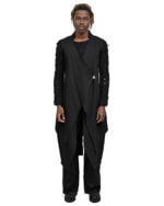 This ‘Insolitum’ garment is crafted in 100% cotton denim in pure black color in raw, untreated finish. Raw denim offers unique characteristics which begin to unveil through time and wear where the fabric will naturally begin to age beautifully and offer one of a kind appearance & fades especially noticeable at the edges. The word HEXA is tightly related to Minoar’s graphic logo abbreviation shaping a Hexagonal shape. This shape is fundamental to Minoar’s core identity. As part of collection Insolitum this item is further provoked by the concept of particle physics and the hypothetical Hexaquarks, hence deconstructed shapes of the Hexagon are implemented within the pattern & construction of this item.